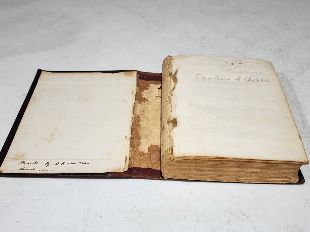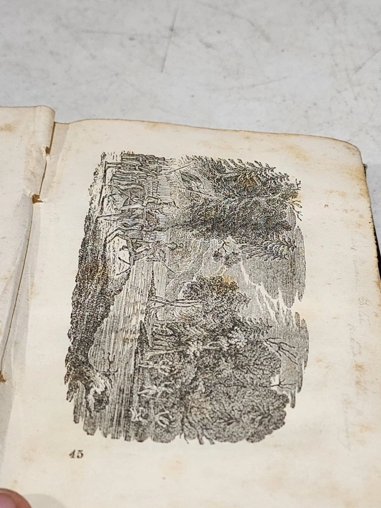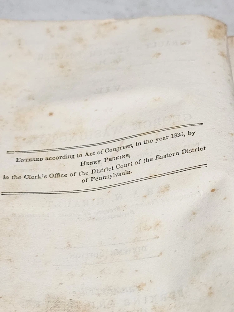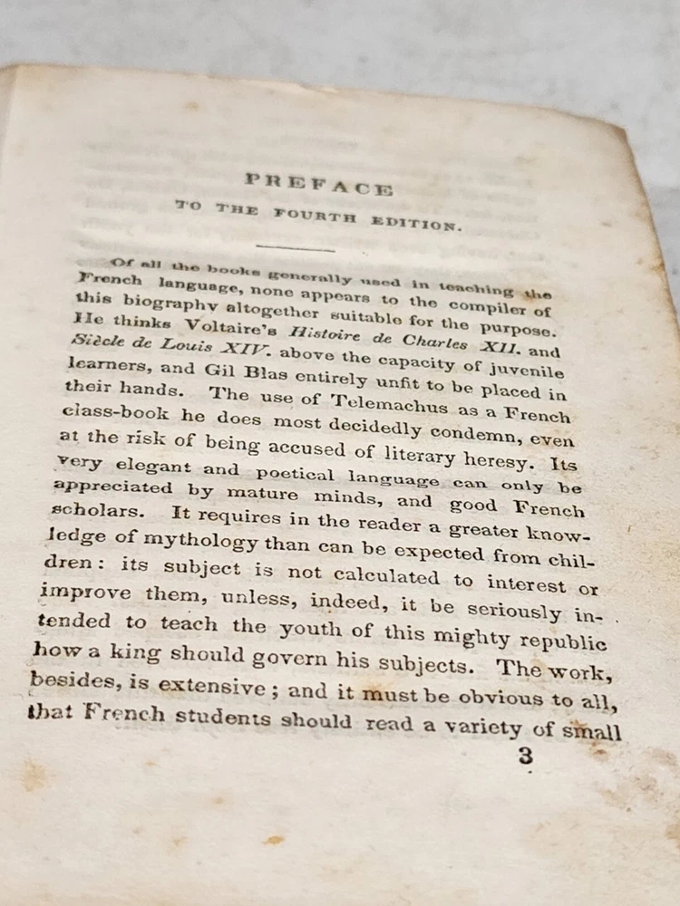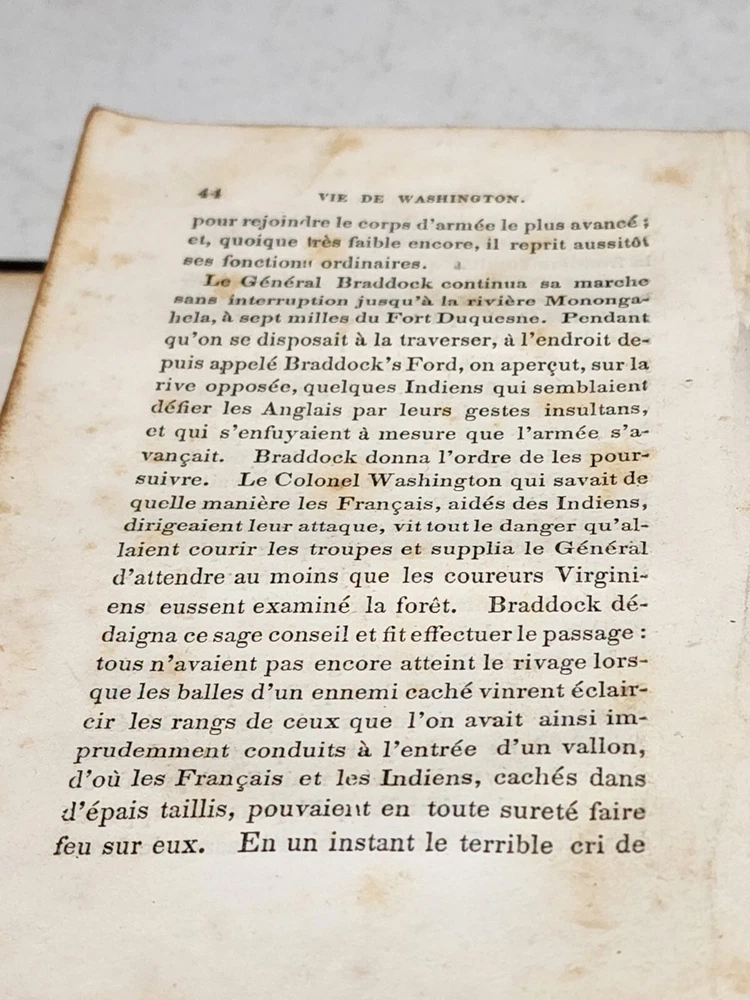 HARDCOVER FRENCH LANGUAGE LEATHER SPINE DATED 1843 AND PUBLISHED BY PERKINS AND PRUVES PHILADELPHIA NO MISSING PAGES. THE SPINE IS PULLING AWAY FROM THE MAIN BOOK. THE FRONT COVER PAGE AND INSIDE COVER HAVE WRITING AND A SMALL TEAR. SOME FOXING VISIBLE ON FIRST SEVERAL PAGES.