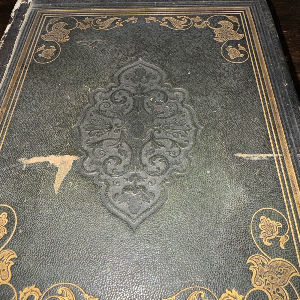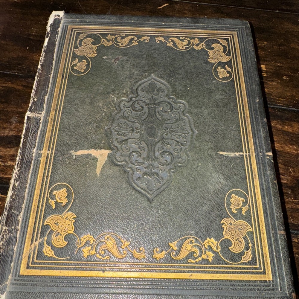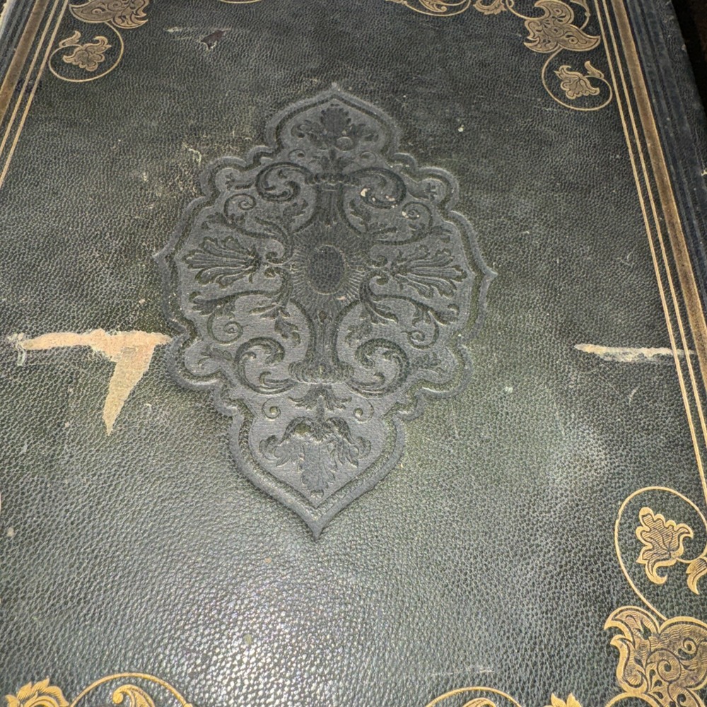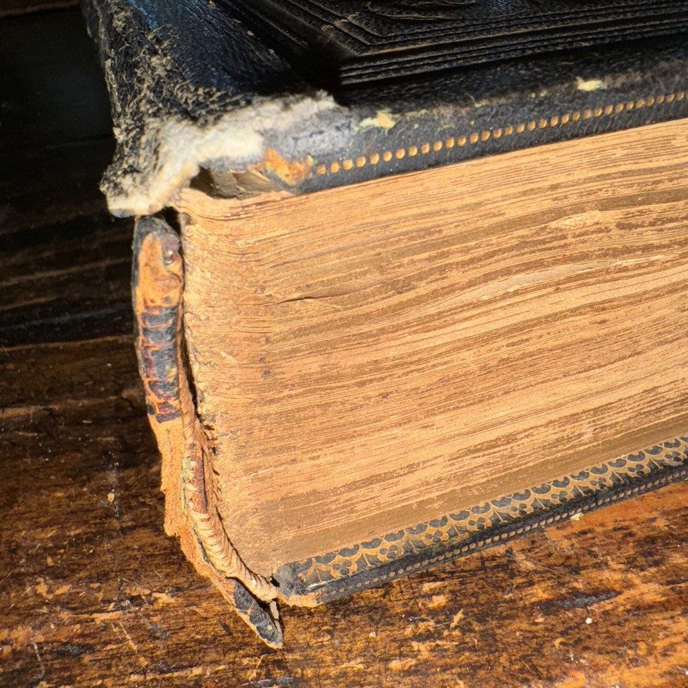 Antique 1850 undated but inscribed by the previous owner Unfortunately this beautiful full leather Bible is in poor condition as shown in the pictures Beautiful leather boards ( faded and scuffed) , the spine is brittle and loose , front boards is loose , back board is detached, pages are all discolored and have age/ water stains , tears and rips , loose binding some pages are detached/ detaching (front endpage) and some blank pages are missing from the front as well , uncertain if any other pages are in missing, illustrations, pages are earmarked, may have other age appropriate wear , all the blank pages on the back of the book are missing, etc - SOLD AS IS Measures 11.5” x 9” x 3” and is 174years old Please see pictures for more details We have hundreds of books listed and combine shipping on multiple purchases (A)