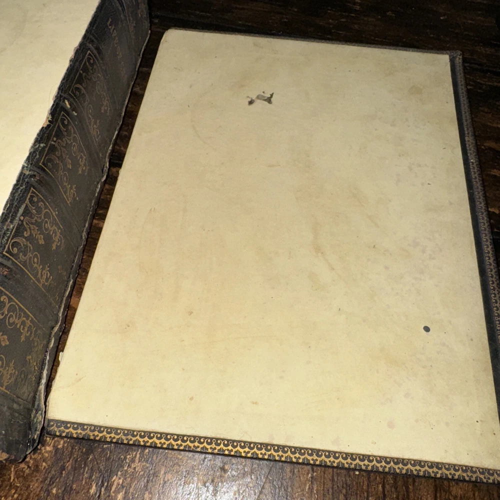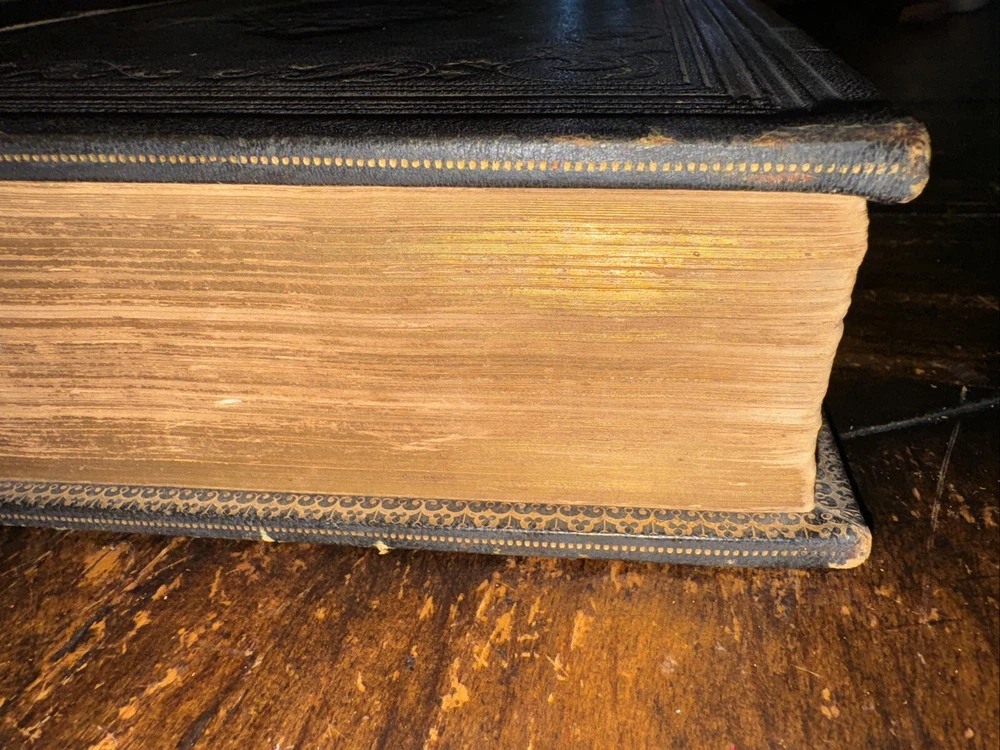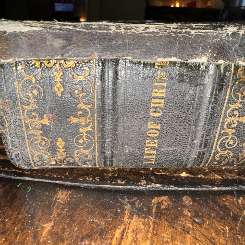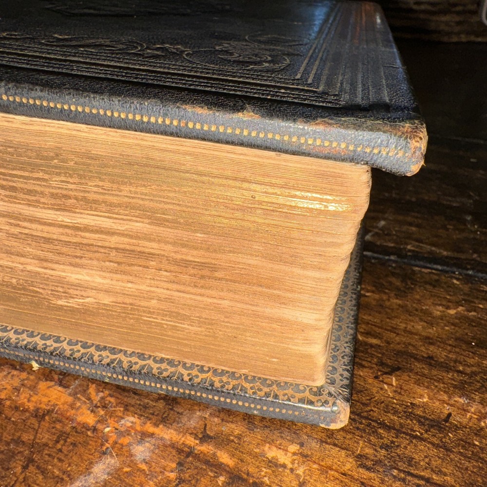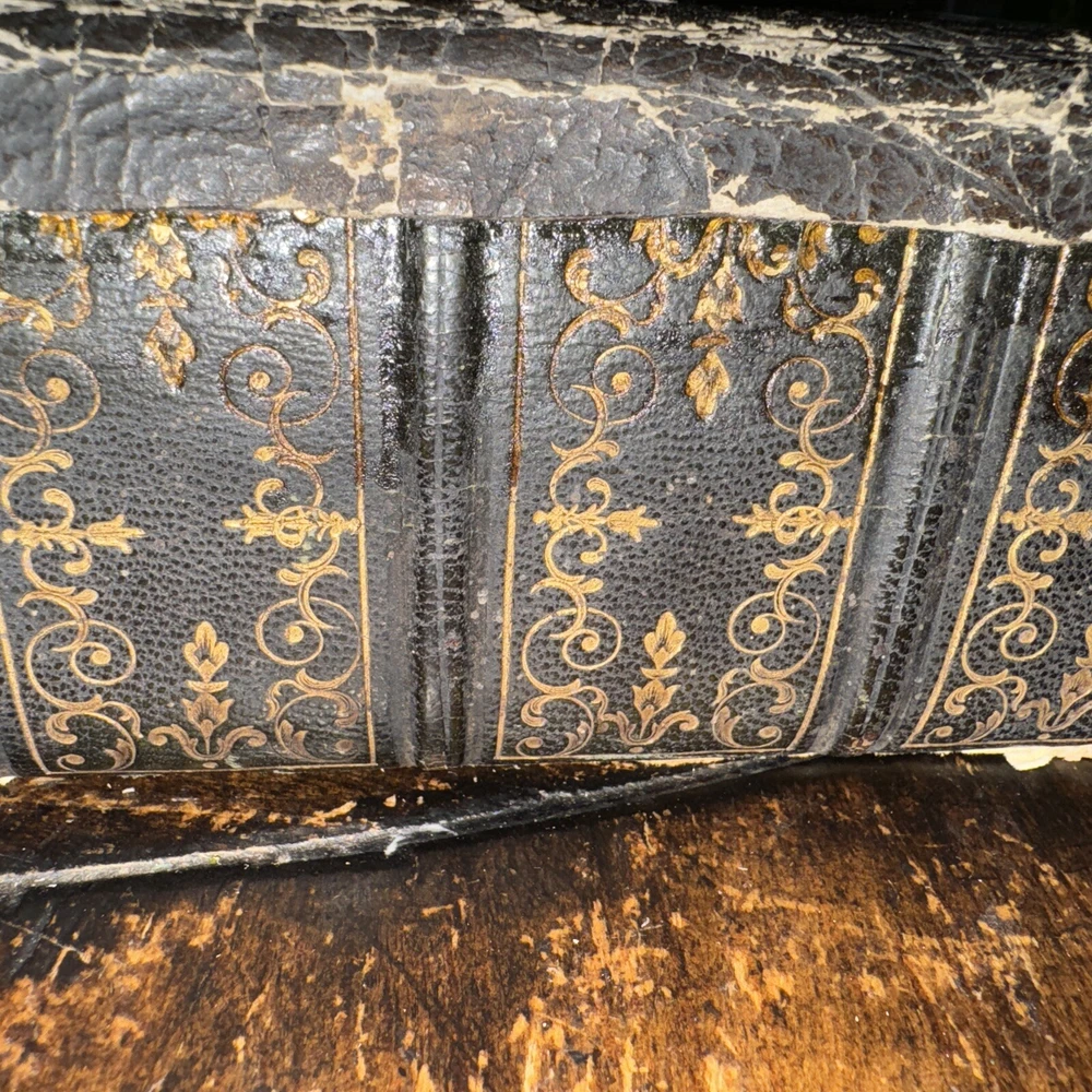 Antique 1850 undated but inscribed by the previous owner Unfortunately this beautiful full leather Bible is in poor condition as shown in the pictures Beautiful leather boards ( faded and scuffed) , the spine is brittle and loose , front boards is loose , back board is detached, pages are all discolored and have age/ water stains , tears and rips , loose binding some pages are detached/ detaching (front endpage) and some blank pages are missing from the front as well , uncertain if any other pages are in missing, illustrations, pages are earmarked, may have other age appropriate wear , all the blank pages on the back of the book are missing, etc - SOLD AS IS Measures 11.5” x 9” x 3” and is 174years old Please see pictures for more details We have hundreds of books listed and combine shipping on multiple purchases (A)