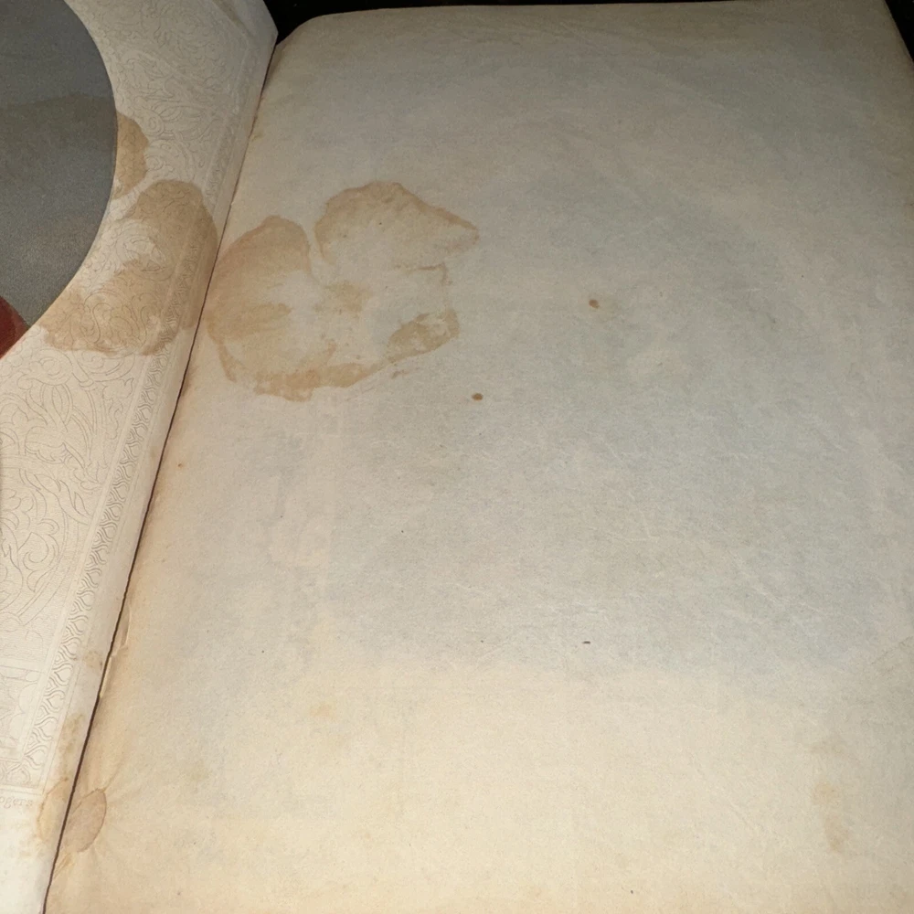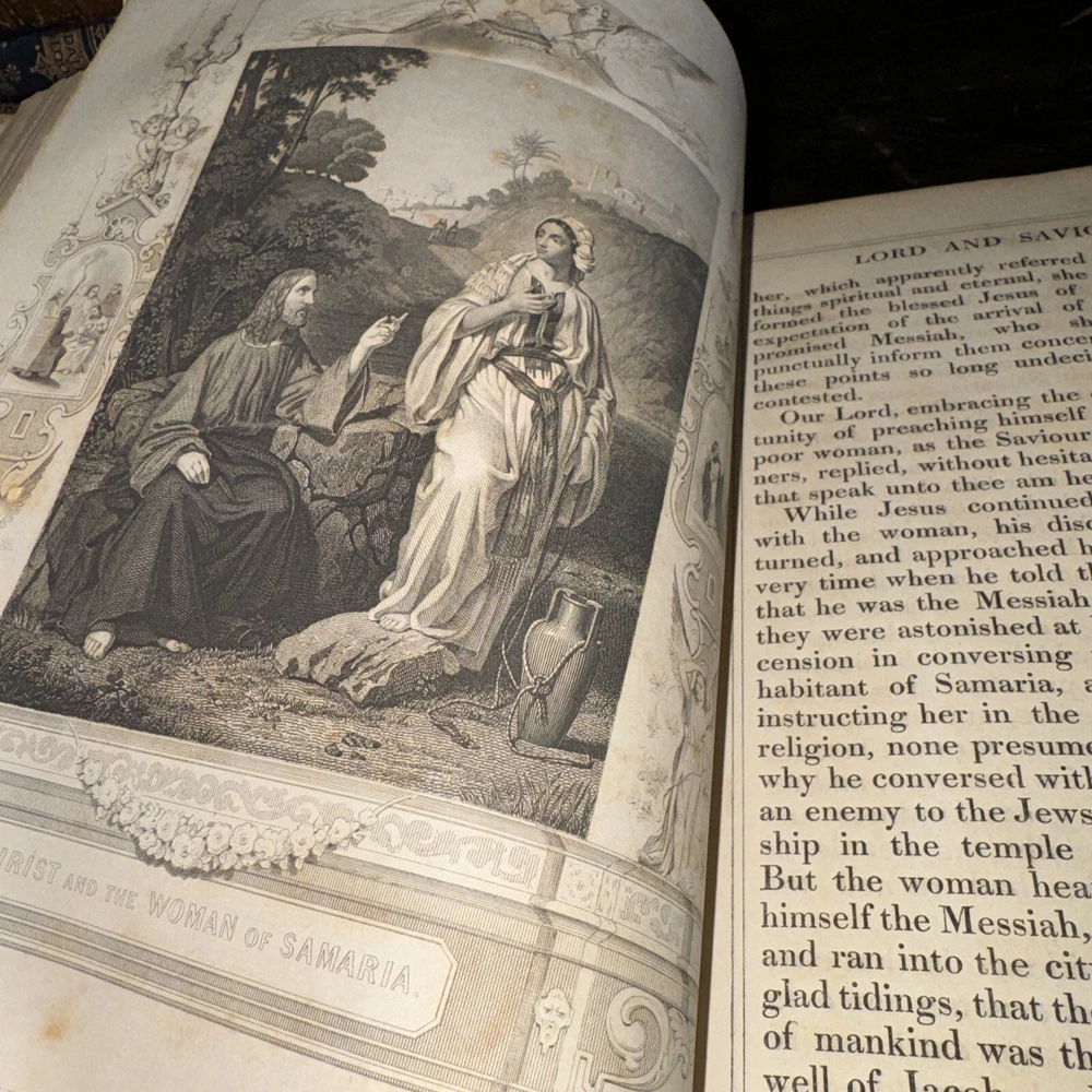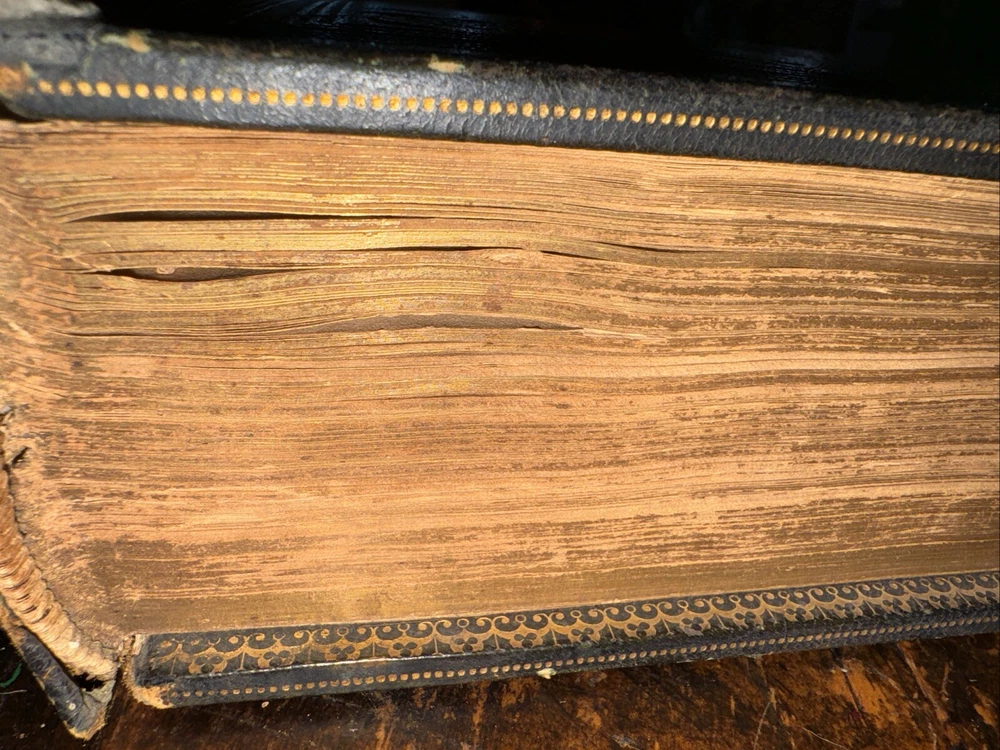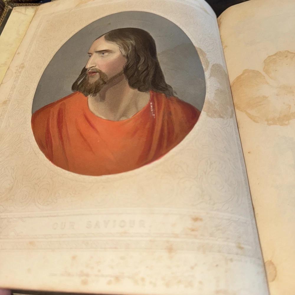 This antique Bible from 1850 is a true treasure despite its worn condition. The rich leather cover, though faded, still carries history in every scuff and dusting. The pages show signs of age with stains and loose binding, but the beautiful illustrations and handwritten inscriptions add so much character. It’s a rare find for—perfect for collectors who appreciate the charm of well-loved relics. The imperfections tell its story, making it even more special. Would love to restore it carefully!