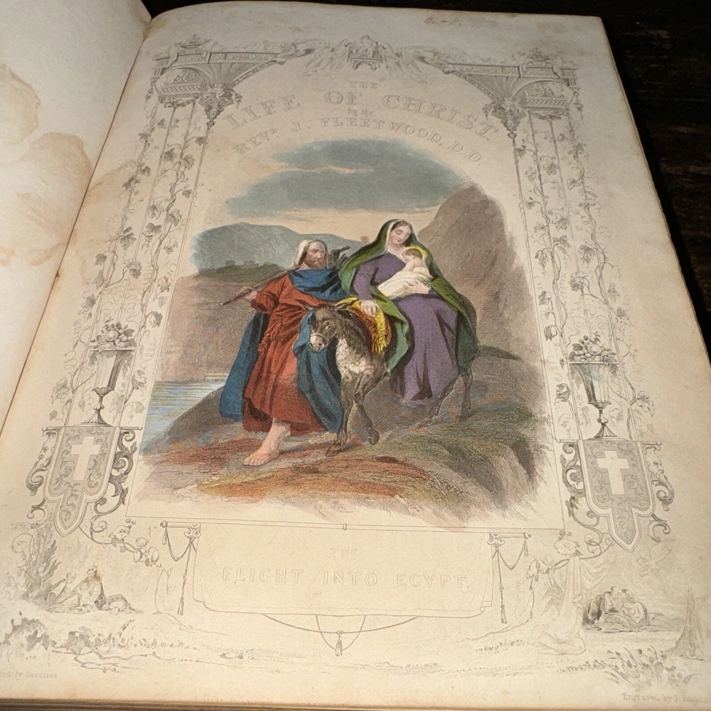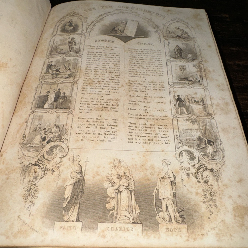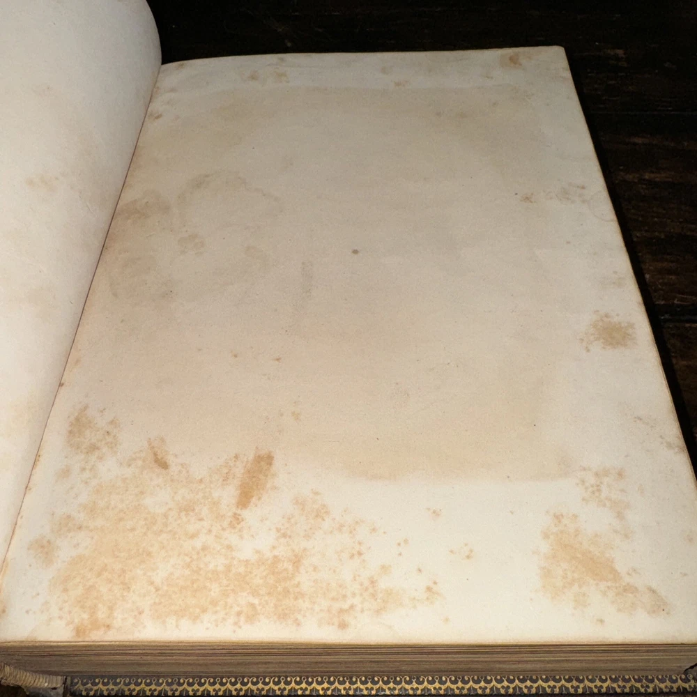 This antique Bible from 1850 is a true treasure despite its worn condition. The rich leather cover, though faded, still carries history in every scuff and dusting. The pages show signs of age with stains and loose binding, but the beautiful illustrations and handwritten inscriptions add so much character. It’s a rare find for—perfect for collectors who appreciate the charm of well-loved relics. The imperfections tell its story, making it even more special. Would love to restore it carefully!