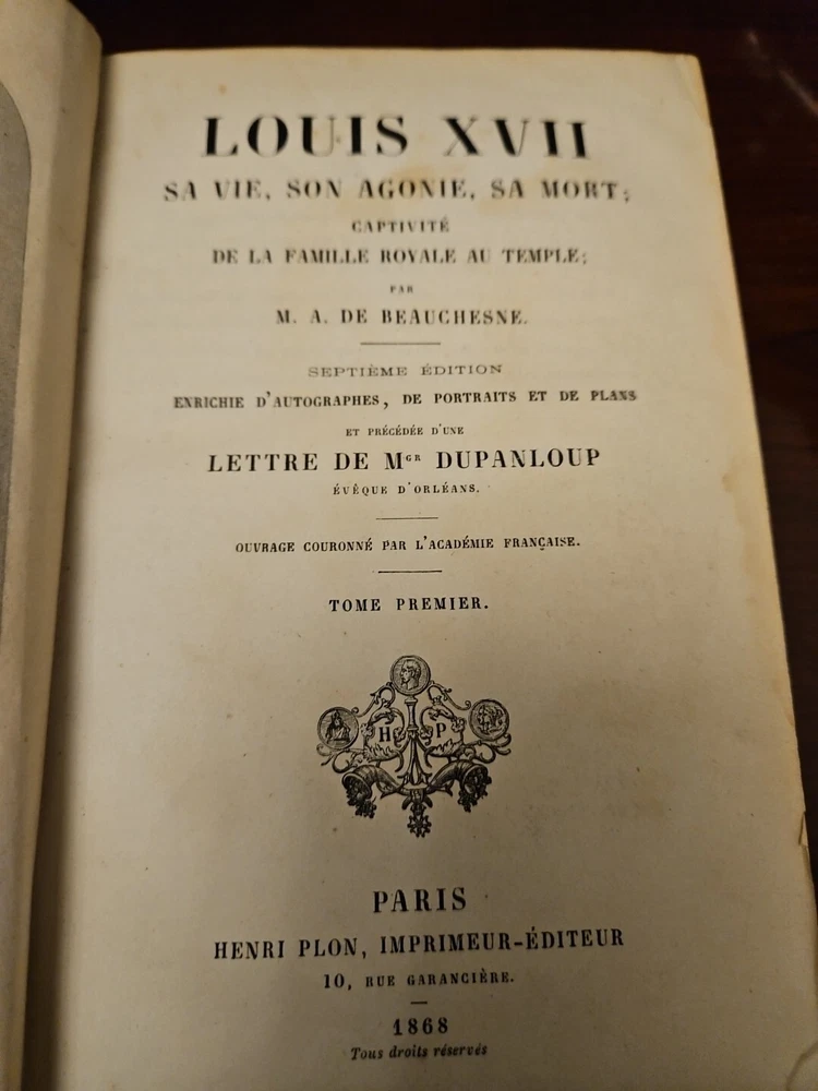 This antique book titled "His Life, His Agony, His Death" by M. A. DE BEAUCHESNE is a collector's edition vintage paperback published by HENRI PLON, IMPRIMEUR-ÉDITEUR in Paris, France in 1868. The book is written in French and contains special attributes that make it a unique addition to any collection. The binding is made of leather and the book is an original print. The topic of the book is literature and the subject is biography and autobiography. This book is perfect for anyone interested in European history and culture. Measurements 7.25 x 4.75 x 1.5 inches See pictures LOUIS XVII HIS LIFE, HIS AGONY, HIS DEATH; CAPTIVITY OF THE ROYAL FAMILY IN THE TEMPLE; ABOUT Mr. A. DE BEAUCHESNE. SEVENTH EDITION ENRICHED WITH AUTOGRAPHS, PORTRAITS AND PLANS AND PRECEDED BY A LETTER FROM MA DUPANLOUP, BISHOP OF ORLEANS. WORK CROWNED BY THE FRENCH ACADEMY. TOME PREMIER. H PARIS HENRI PLON, PRINTER-PUBLISHER 10, RUE GARANCIÈRE. 1868 All rights reserved LOUIS XVII SA VIE, SON AGONIE, SA MORT; CAPTIVITÉ DE LA FAMILLE ROYALE AU TEMPLE; PAR M. A. DE BEAUCHESNE. SEPTIÈME ÉDITION ENRICHIE D'AUTOGRAPHES, DE PORTRAITS ET DE PLANS ET PRÉCÉDÉE D'UNE LETTRE DE MA DUPANLOUP ÉVÊQUE D'ORLÉANS. OUVRAGE COURONNÉ PAR L'ACADÉMIE FRANÇAISE. TOME PREMIER. H PARIS HENRI PLON, IMPRIMEUR-ÉDITEUR 10, RUE GARANCIÈRE. 1868 Tous droits réservés #antiquebooks #rarebooks #bookstagram #oldbooks #vintagebooks #books #antiques #bibliophile #bookcollector #antique #antiquarianbooks #vintage #booklover #book #bookbinding #booksofinstagram #bookworm #art #library #antiquebook #homedecor #history #thcentury #bookstore #bookcollection #booksforsale #interiordesign #antiqueshopping #firsteditions #bookseller