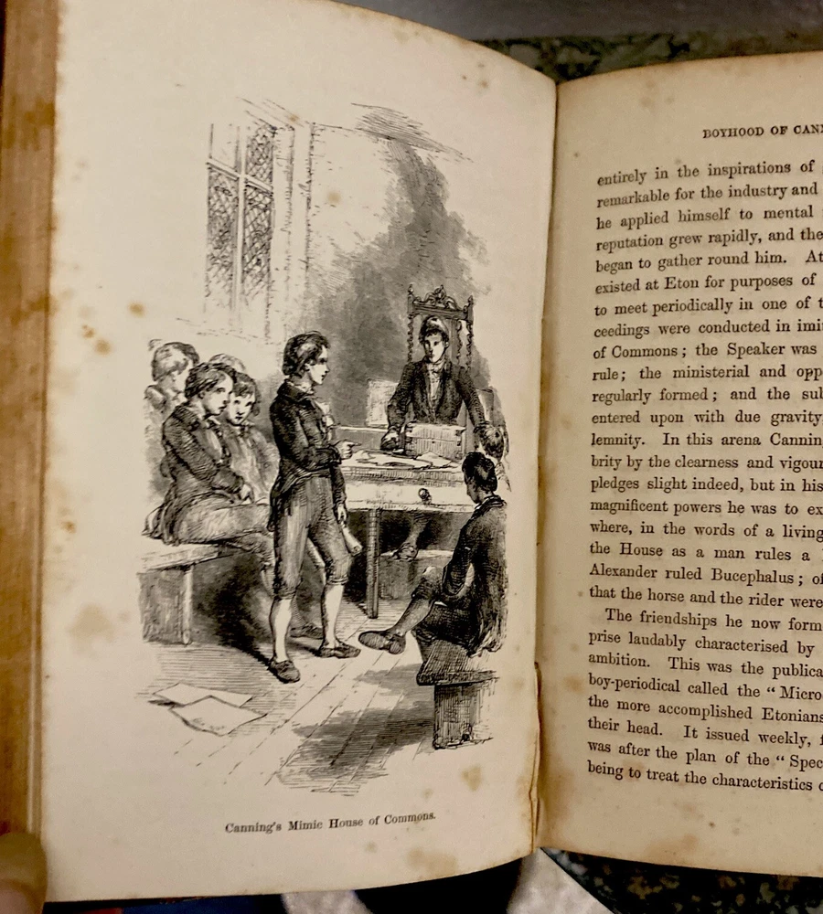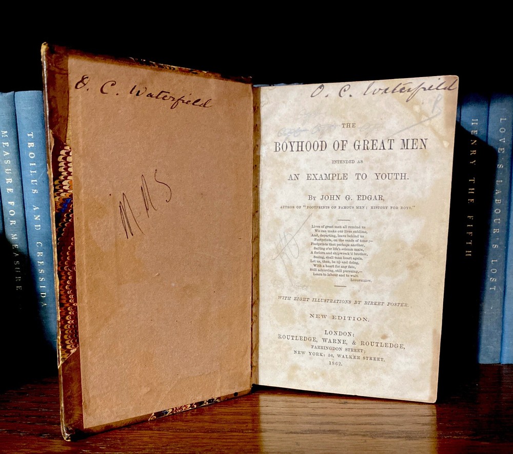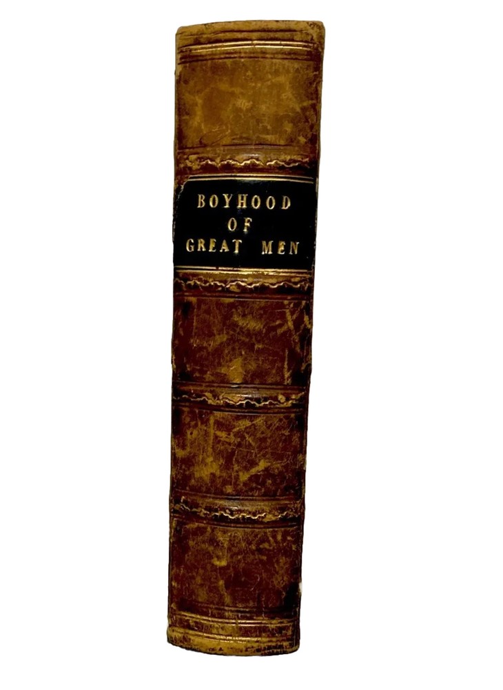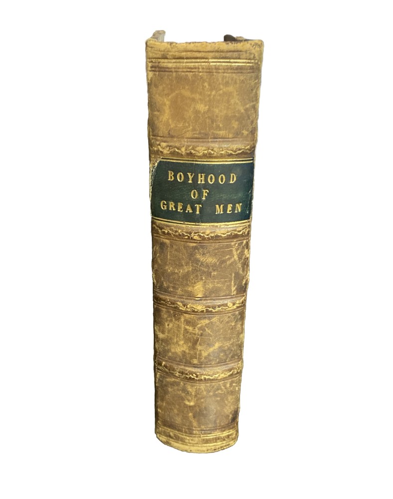 Antique book with double history , read below . The Boyhood of Great Men intended as an Example to Youth John G Edgar , 1862 8 illustrations ( engraved woodblock etchings) by Birket Foster London : Routledge, Warne, And Routledge Farringdon Street; New York : 56, Walker Street Forty biographies of great men in nineteen different categories (Poets, Historians, Statesmen, Inventors, &c) intended to inspire boys and young men to seek their own greatness in life. This was his first book, published in London in 1853. He wrote historical narrative fiction, mainly intended for boys, as was the first editor of Every Boy's Magazine. The double history is the ownership of this book . As shown in photos, O.C. Waterfield is written twice in fountain pen . Ottiwell Charles Waterfield ( O. C. Waterfield ) authored The New Suez Canal , Considerations addressed to the committee of shipowners appointed … May 10, 1883 This HC leather bound spine / board book is in good condition, with some flaws from aging and the writing inside . Pages are tightly bound , though 1 plate ( Wilkes) is loose . ( please see photos) . The cover page is missing . There are initials in pencil . P 130 is very discolored (photo) Please see all photos as part of description. Overall well preserved , with some flaws . Double dose history!