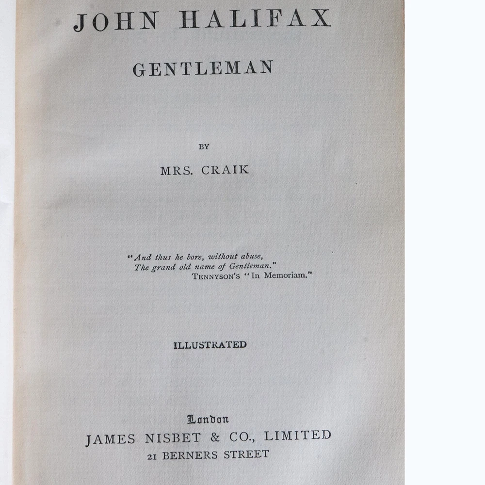 DETAILS TITLE John Halifax, Gentleman PUBLISHER John Nisbet & Company, Ltd. (London, England) BINDING Three-quarter red leather hardcover binding. Marbled paper covers and fore-edge. ILLUSTRATED Black and white plates EDITION Later edition. Originally published in 1856 SUBJECT(S) Victorian life; novel AUTHOR(S) Dinah Maria Craik (Mrs. Craik/Miss Mulock) (English, 1826-87) | Illustrator: Christiana Mary Demain Hammond (English, 1860-1900) MARKS Presentation inscription dated 1905. Plates printed signature and dated: Chris Hammond 98. PERIOD Edward VII (1901-10) | Early 20th century DATE Copyright 1905 DIMENSIONS Width 5 Depth 1.75 Height 7.25 inches CONDITION Note: wear to leather.