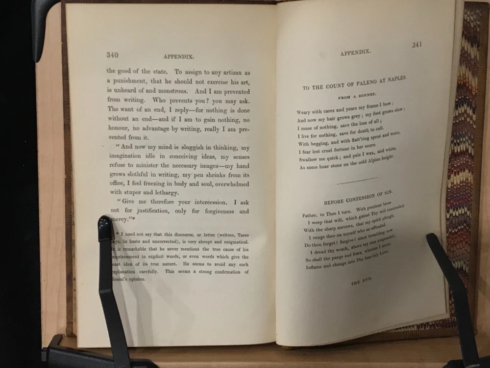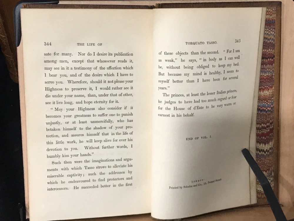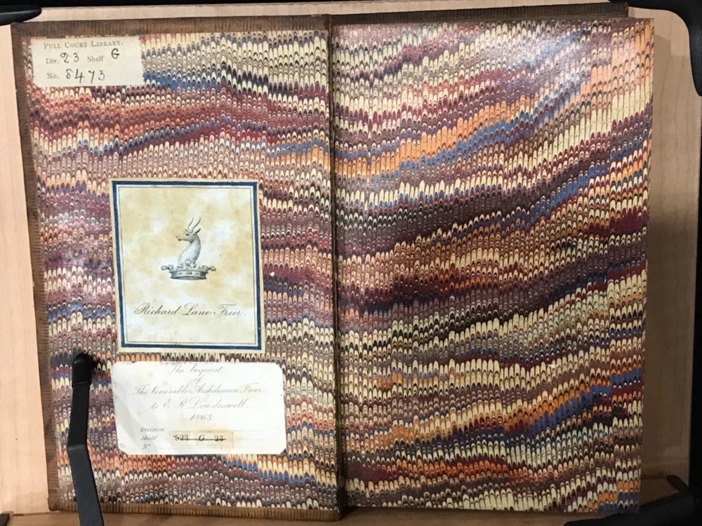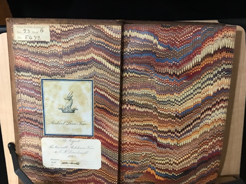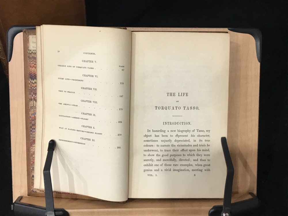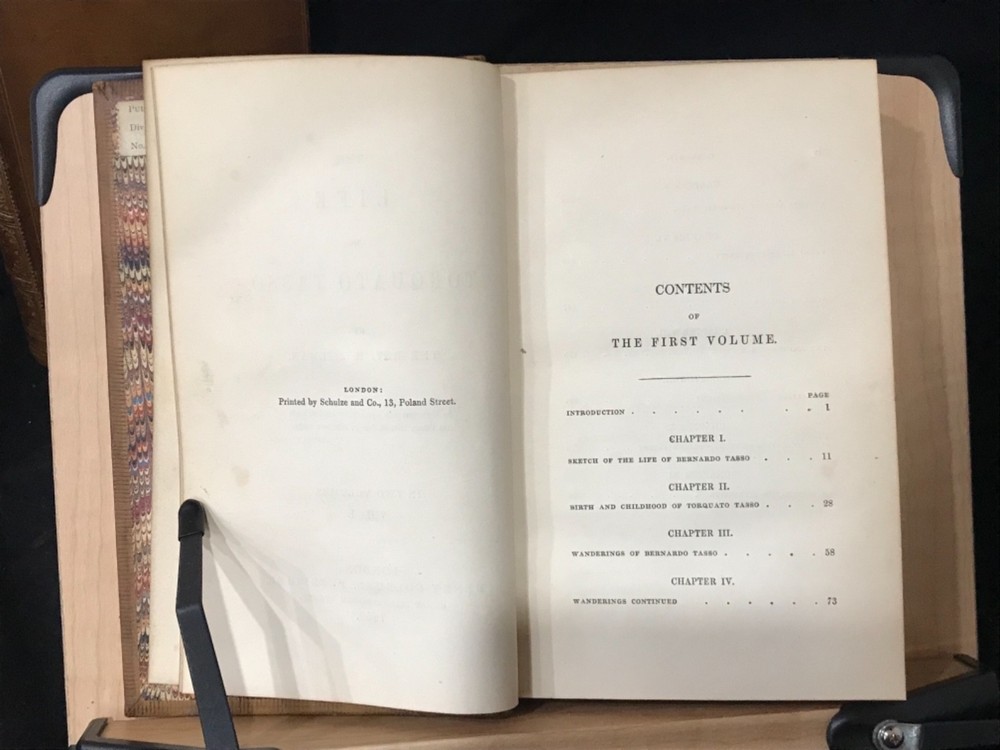 Torquato Tasso was one of the best read poets in Europe for a very long time; his most known work is “Jerusalem Delivered”. This particular set of volumes is from the Pull Court Library and was donated by one of the Library’s biggest benfactor’s: Edmund Dowdeswell. This is a nice set of volumes in excellent condition. Very Good Condition: 8vo, 2 Volumes, Leather Binding with Marble Endpapers: bookplates inside front: Richard Lane Freer to E. R. Dowdeswell 1863. Shelf Notes on top inside board along with bookplates: some foxing due to age. “The Life of Torquato Tasso” by Rev. R Milman. London: Henry Colburn. 1850. COLL 1850B EF A