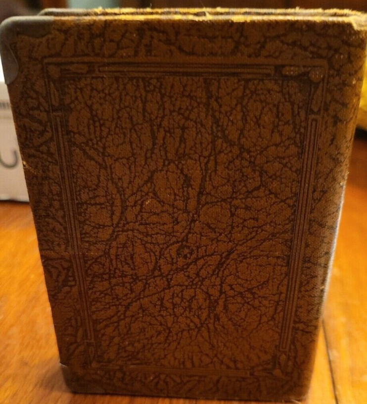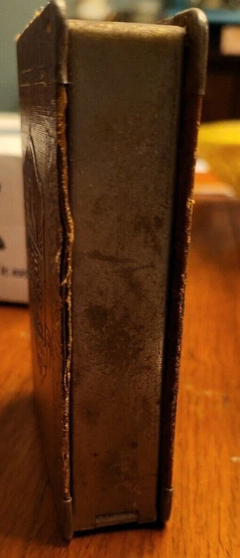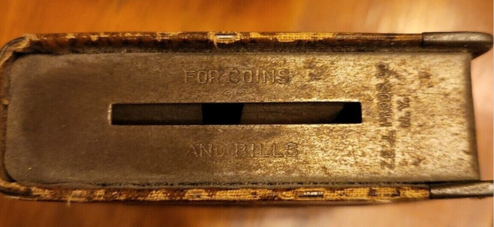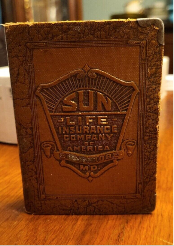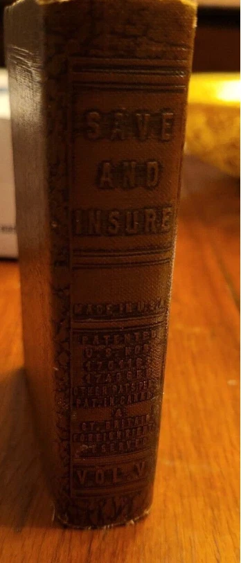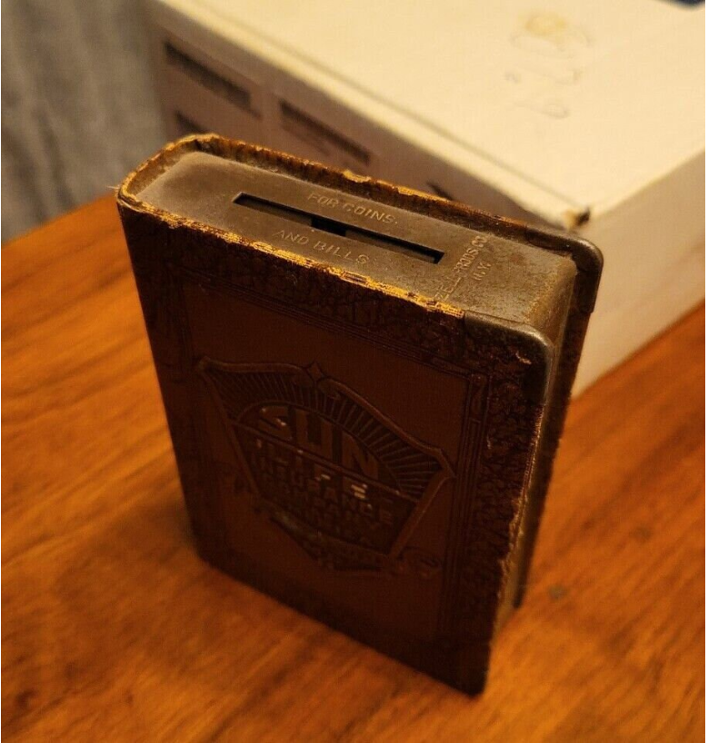 You are about to take home an Antique Money Bank bearing the name Sun Life Insurance Company. Constructed with Leatherbound Steel. The spine reads: "Save and Insure" Made in the USA Patented U.S. Nos 1701163, 1749655 Other pats pend. Pat. In Canada and Gt. Britain Foreign Rights Reserved. Vol V. Patent No. 1701163 states that "This invention relates to guards for coin collection receptacles and has for its primary object to provide a simple and effective device of this character which may be readily applied and used in connection with coin banks or safes of various types to prevent the extraction of coins therefrom through the coin receiving slot while permitting of the ready insertion of coins through the said slot into the bank or receptacle. (US Public Patent Search) Patent No. 1749655 states that "This invention relates to new and useful improvements in receptacles and more particularly to pocket size containers for coins, cosmetics, or the like. and that "The primary object of the invention is to securely preserve small articles against accidental removal or loss, and yet render the same readily accessible." (US Public Patent Search) This lovely little bank measures: 4.25 in. Tall 3.25 in. Wide 1 in. Thick Weighs 7 oz. For coins and bills. See pics for the condition of this fantastic item.