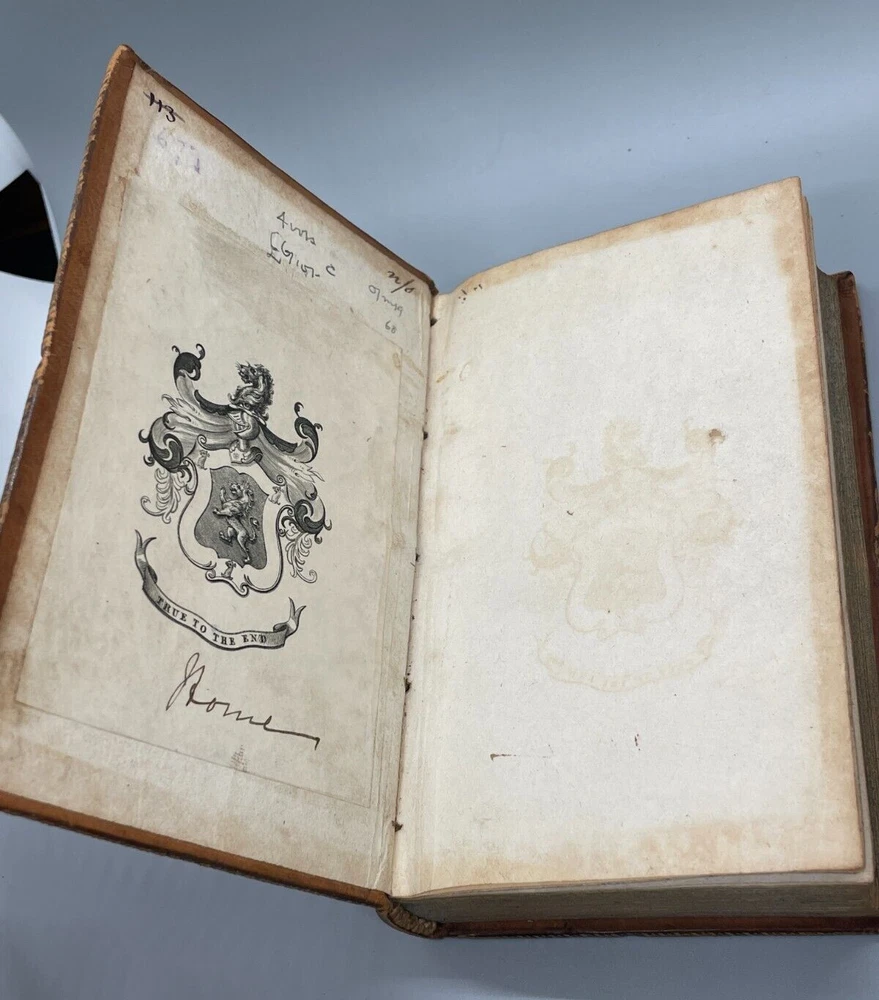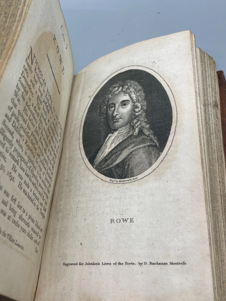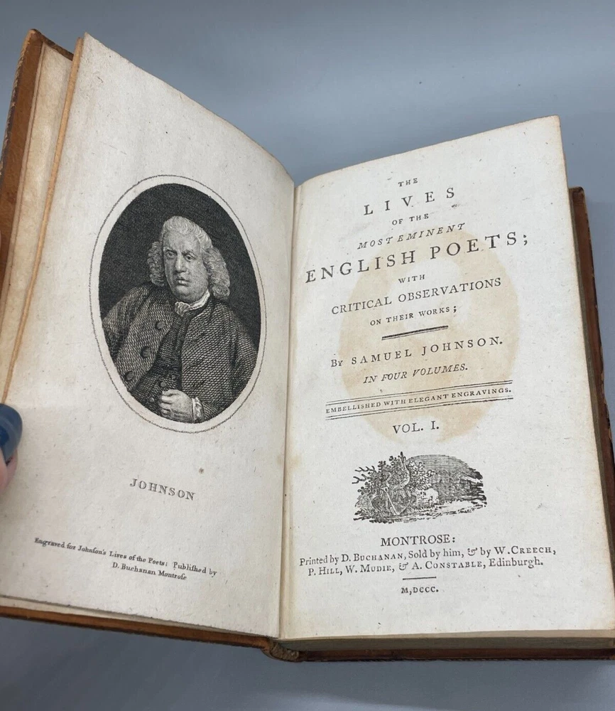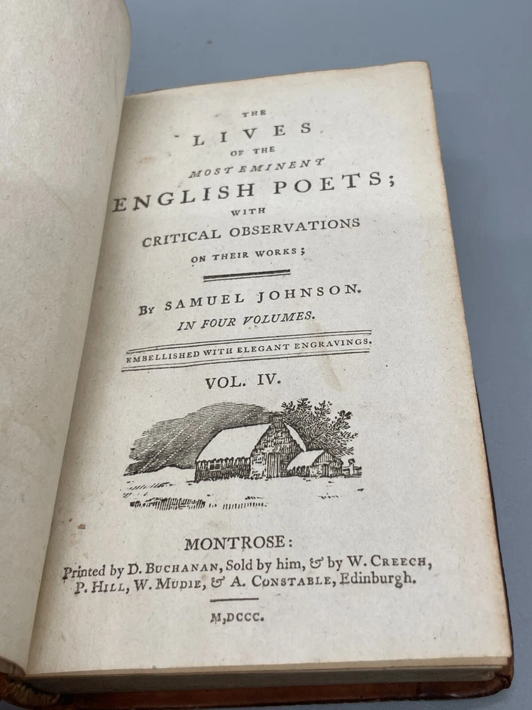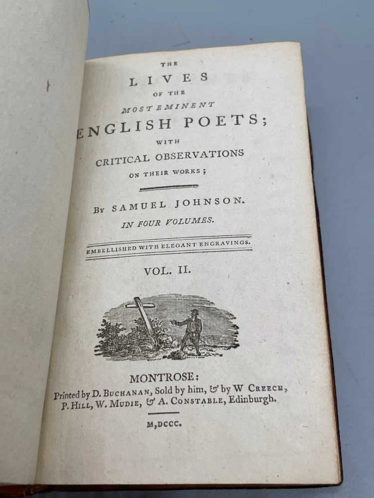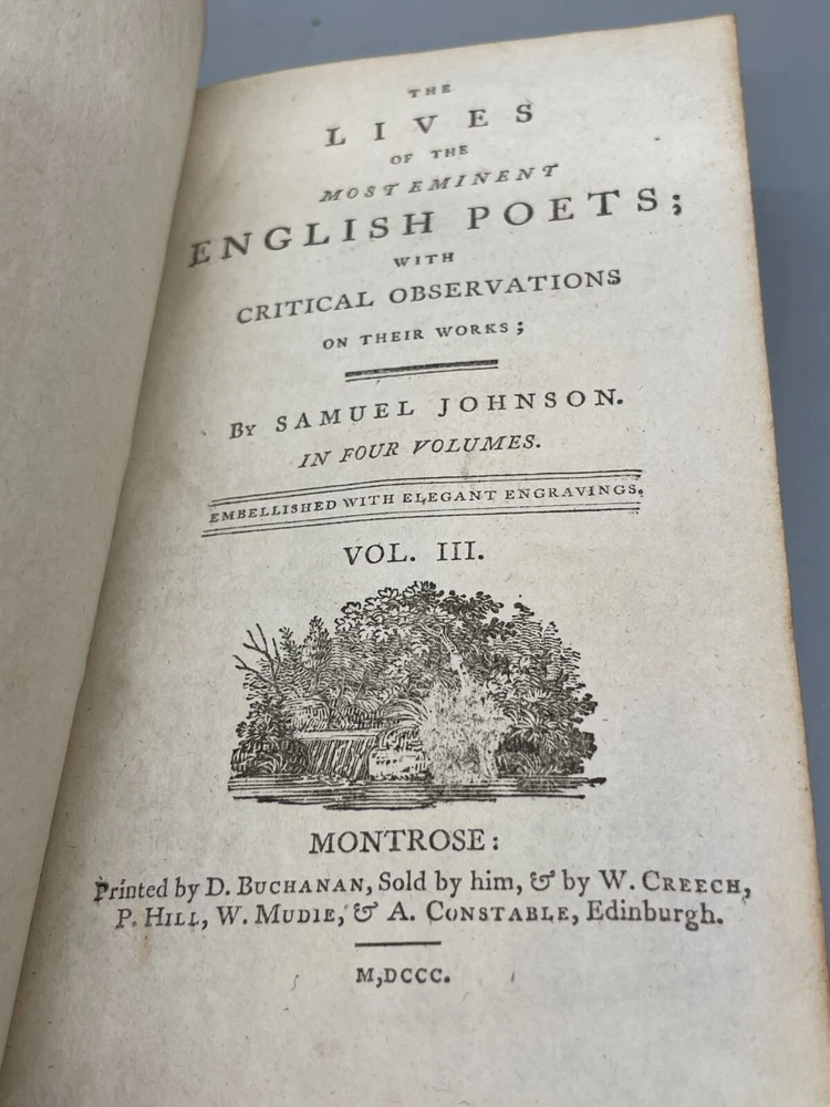 "The Lives of The Most Eminent English Poets; with Critical Observations on Their Works by Samuel Johnson in Four Volumes, Embellished with Elegant Engravings. Montrose: Printed by D. Buchanan, Sold by Him & by W. Creech, P. Hill, W. Mudie & A. Constable, Edinburgh, M,DCCC. (1800). 18mo (3.75 x 5.75 inches) Uniform binding of full calf leather with green labels and gilt tooling. Test block edges are marble flecked. Frontispiece engraved portrait of the author in the first volume. Other engravings are portraits of some of the poets. Volume I: 313 pages, Volume 2: 308 pages, Volume 3: 306 pages and Volume 4: 340 pages. Inside each cover is an armorial style bookplate with the hand-written "Home" surname. The bookplate imagery shows a left facing standing lion, a knight's head armor and the motto" True To The End". This imagery and motto are associated with the Earl of Home, a title in the Peerage of Scotland. A gift inscription on each book reads " A. H. to his sisters 1801". The 10th Earl Home, Alexander (1769-1841), had two sisters. His son, Cospatrick Alexander was born in 1799 and had no sisters. His father died prior to this date. It is possible this set was gifted by the 10th Earl and the inscription is in his hand and the bookplate surname is in the hand of one of his sisters. A modern index card was inserted in Volume 2 with a handwritten note "This is the closest I could find to the 18th c. Hope the set is suitable. Engravings are interesting. - John R." Bindings are intact and show wear to edges and corners. Cracking to spine leather and loss of some gilt. Minimal foxing. Previous owner's personal library notations on end papers. Gift inscription on blank page of each book. Vols 1, 2 and 4 back covers have a crack across leather. Shipped boxed and insured.