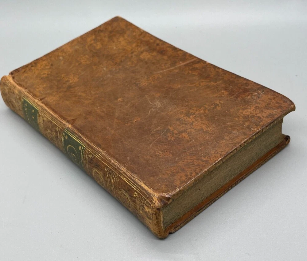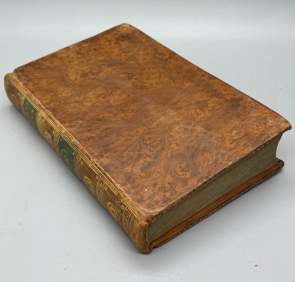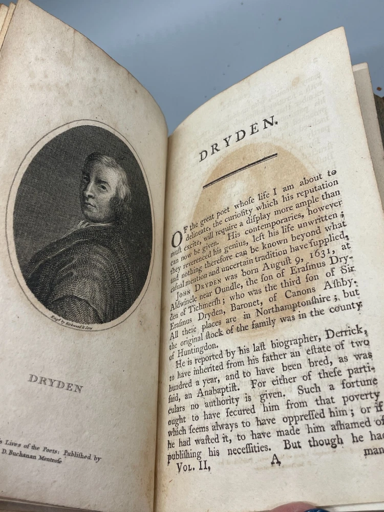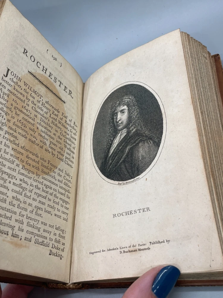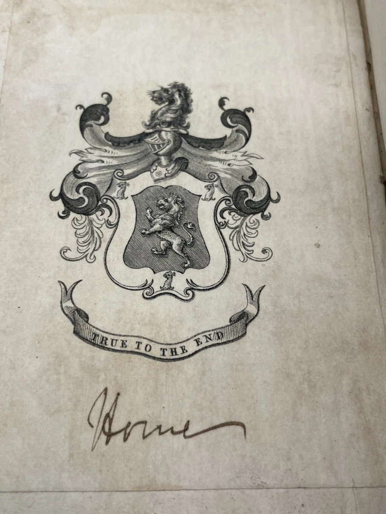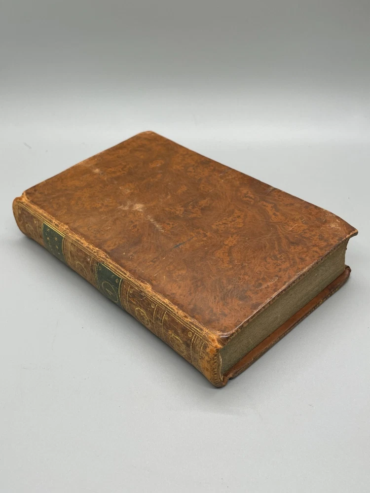 "The Lives of The Most Eminent English Poets; with Critical Observations on Their Works by Samuel Johnson in Four Volumes, Embellished with Elegant Engravings. Montrose: Printed by D. Buchanan, Sold by Him & by W. Creech, P. Hill, W. Mudie & A. Constable, Edinburgh, M,DCCC. (1800). 18mo (3.75 x 5.75 inches) Uniform binding of full calf leather with green labels and gilt tooling. Test block edges are marble flecked. Frontispiece engraved portrait of the author in the first volume. Other engravings are portraits of some of the poets. Volume I: 313 pages, Volume 2: 308 pages, Volume 3: 306 pages and Volume 4: 340 pages. Inside each cover is an armorial style bookplate with the hand-written "Home" surname. The bookplate imagery shows a left facing standing lion, a knight's head armor and the motto" True To The End". This imagery and motto are associated with the Earl of Home, a title in the Peerage of Scotland. A gift inscription on each book reads " A. H. to his sisters 1801". The 10th Earl Home, Alexander (1769-1841), had two sisters. His son, Cospatrick Alexander was born in 1799 and had no sisters. His father died prior to this date. It is possible this set was gifted by the 10th Earl and the inscription is in his hand and the bookplate surname is in the hand of one of his sisters. A modern index card was inserted in Volume 2 with a handwritten note "This is the closest I could find to the 18th c. Hope the set is suitable. Engravings are interesting. - John R." Bindings are intact and show wear to edges and corners. Cracking to spine leather and loss of some gilt. Minimal foxing. Previous owner's personal library notations on end papers. Gift inscription on blank page of each book. Vols 1, 2 and 4 back covers have a crack across leather. Shipped boxed and insured.