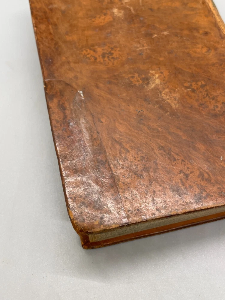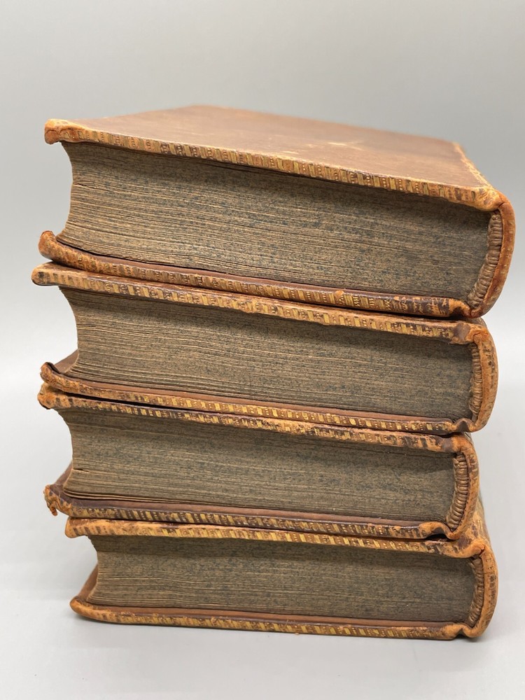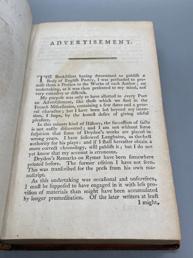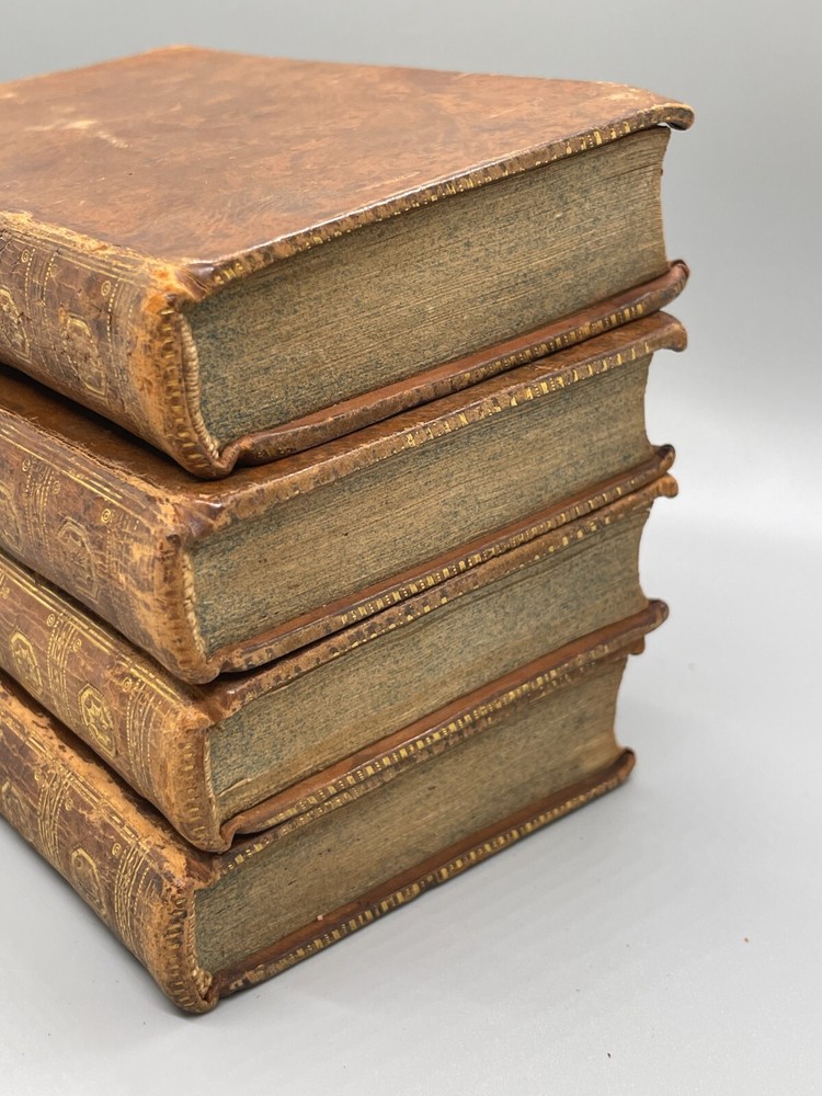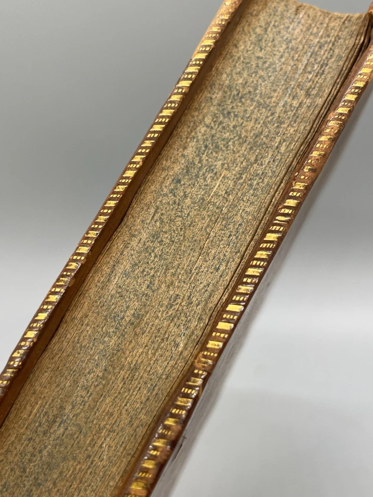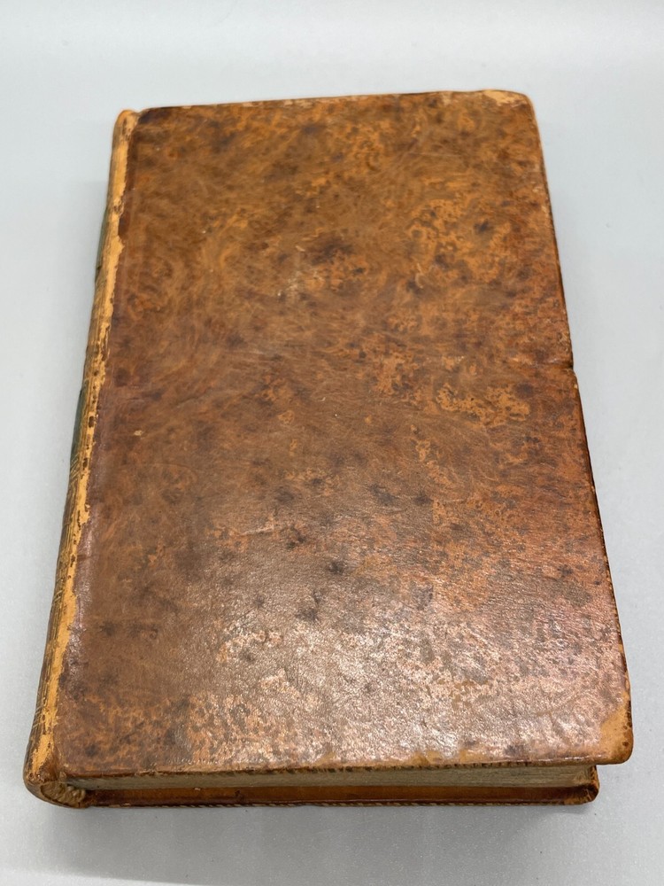 "The Lives of The Most Eminent English Poets; with Critical Observations on Their Works by Samuel Johnson in Four Volumes, Embellished with Elegant Engravings. Montrose: Printed by D. Buchanan, Sold by Him & by W. Creech, P. Hill, W. Mudie & A. Constable, Edinburgh, M,DCCC. (1800). 18mo (3.75 x 5.75 inches) Uniform binding of full calf leather with green labels and gilt tooling. Test block edges are marble flecked. Frontispiece engraved portrait of the author in the first volume. Other engravings are portraits of some of the poets. Volume I: 313 pages, Volume 2: 308 pages, Volume 3: 306 pages and Volume 4: 340 pages. Inside each cover is an armorial style bookplate with the hand-written "Home" surname. The bookplate imagery shows a left facing standing lion, a knight's head armor and the motto" True To The End". This imagery and motto are associated with the Earl of Home, a title in the Peerage of Scotland. A gift inscription on each book reads " A. H. to his sisters 1801". The 10th Earl Home, Alexander (1769-1841), had two sisters. His son, Cospatrick Alexander was born in 1799 and had no sisters. His father died prior to this date. It is possible this set was gifted by the 10th Earl and the inscription is in his hand and the bookplate surname is in the hand of one of his sisters. A modern index card was inserted in Volume 2 with a handwritten note "This is the closest I could find to the 18th c. Hope the set is suitable. Engravings are interesting. - John R." Bindings are intact and show wear to edges and corners. Cracking to spine leather and loss of some gilt. Minimal foxing. Previous owner's personal library notations on end papers. Gift inscription on blank page of each book. Vols 1, 2 and 4 back covers have a crack across leather. Shipped boxed and insured.
