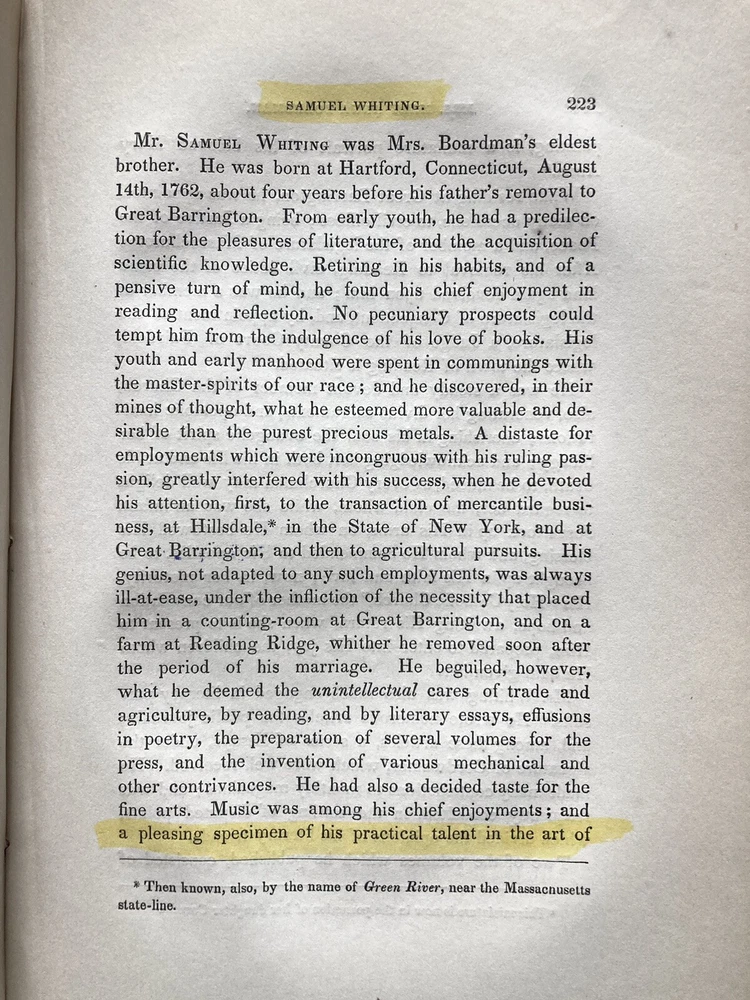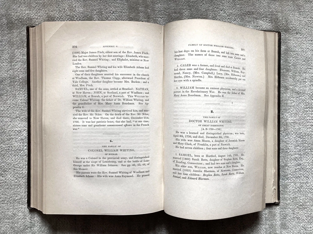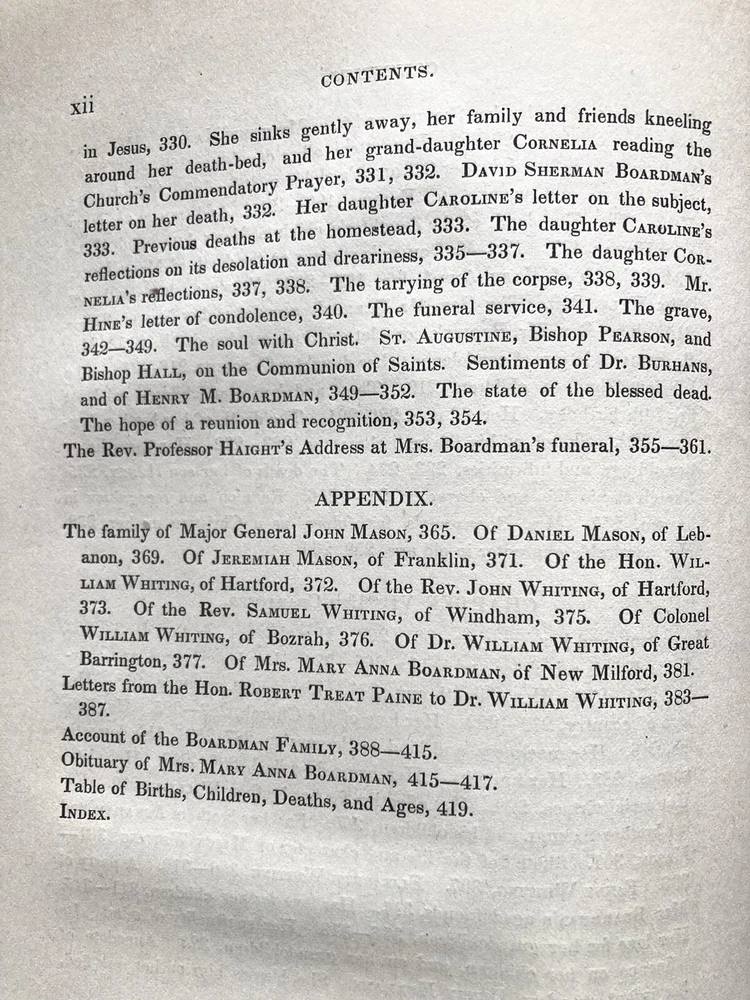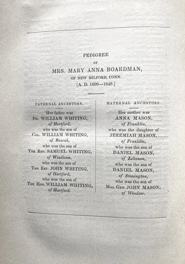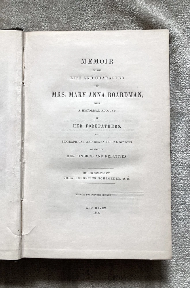 6” x 9”, 478 pages. Very scarce book, considered culturally important. Early American memoir, genealogy, and history. In good+ approaching very good condition. Clean pages, only a hint of tone. Good binding. Nicely embossed boards. Couple of subtle spots on the front board. Quite a few players of early Amerjcan history make an appearance here and the families intertwined with the Boardmans was extensive. Everyday life and religion are also detailed in the book.