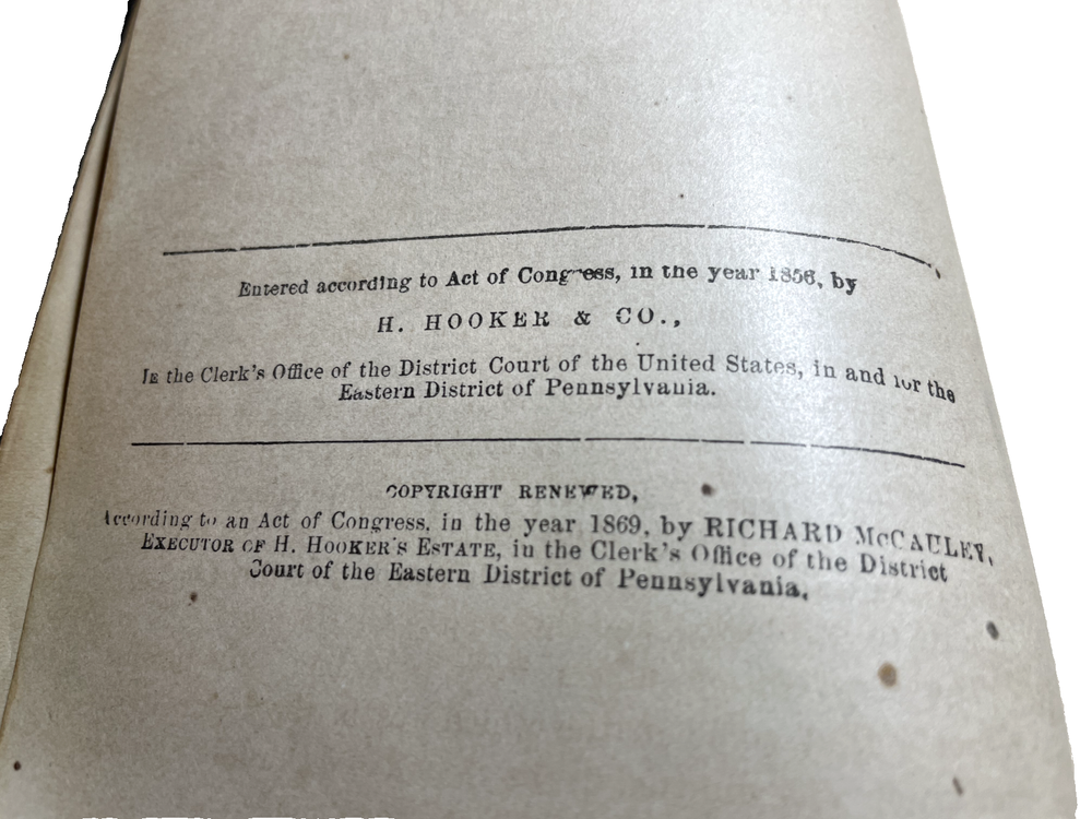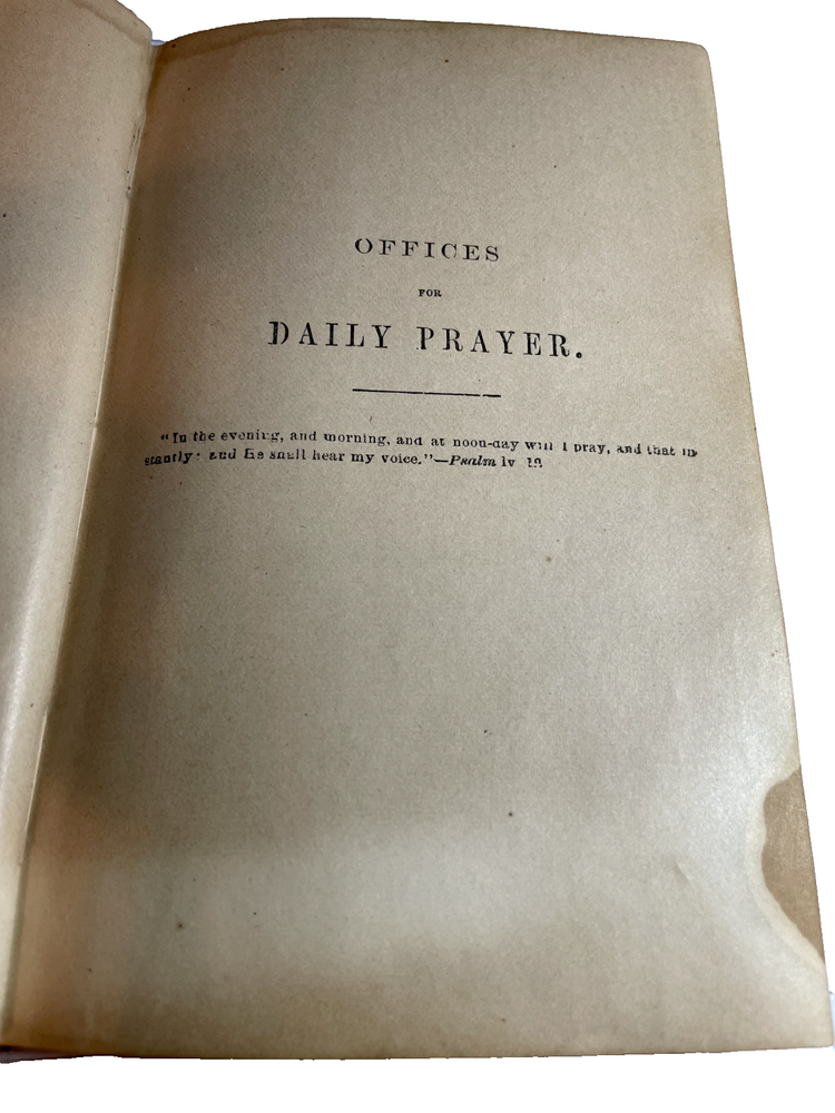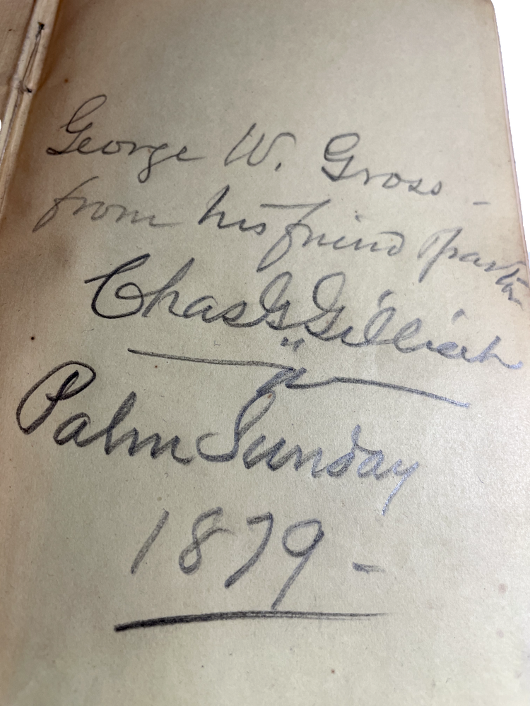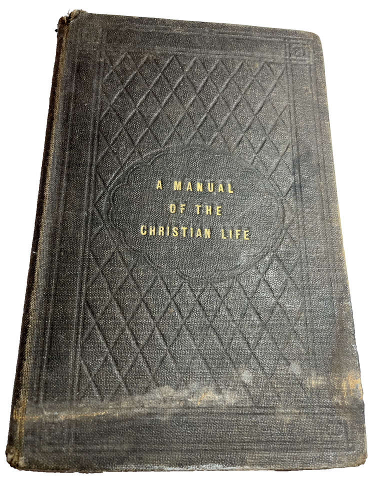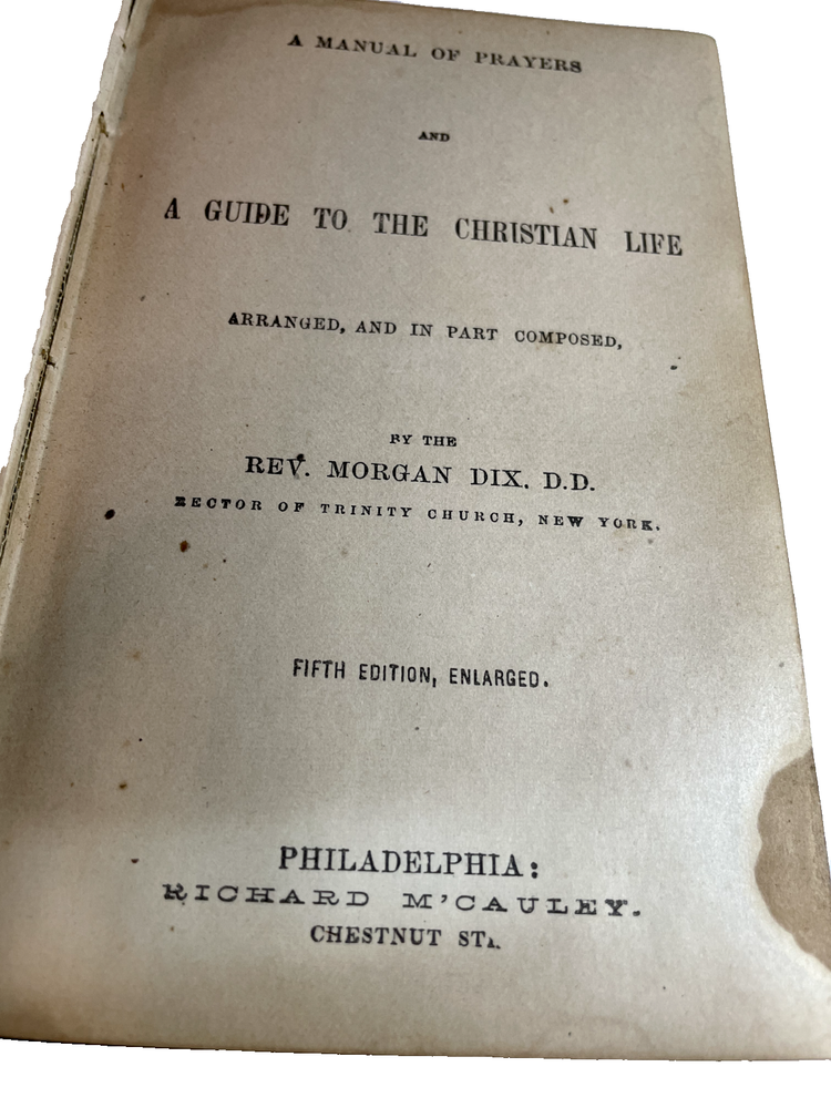 The cover is titled " A Manual of the Christian Life." The cover page is titled "A Manual of Prayers and A Guide to the Christian Life." It is the "Fifth Edition, Enlarged." Publisher is Richard McCauley of Chestnut Street in Philadelphia, PA. It looks like the book was first published in 1856, and this fifth edition is from around 1869 when the copyright was renewed. Rev. Morgan Dix (1827-1908) is listed on the cover page as the Rector of Trinity Church in New York City, New York. He was an Episcopal who authored several books about Christianity and religious life. He was a well-known author and theologian during his time. The book is inscribed in pencil: "George W. Gross from his friend (illegible) Chas. G. Gillriech Palm Sunday 1879." I am not sure "Gillriech" is actually correct. See photo. These two friends lived in or near Orwigsburg, Pottsville and Philadelphia, PA. As stated above, this book has discolored pages, stains and fraying on cover, which I think is leather.