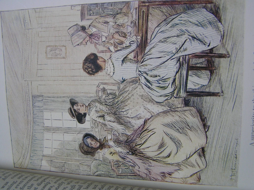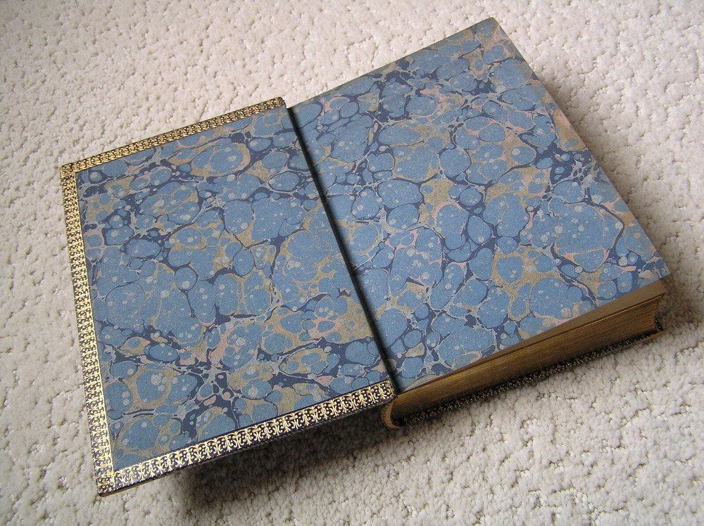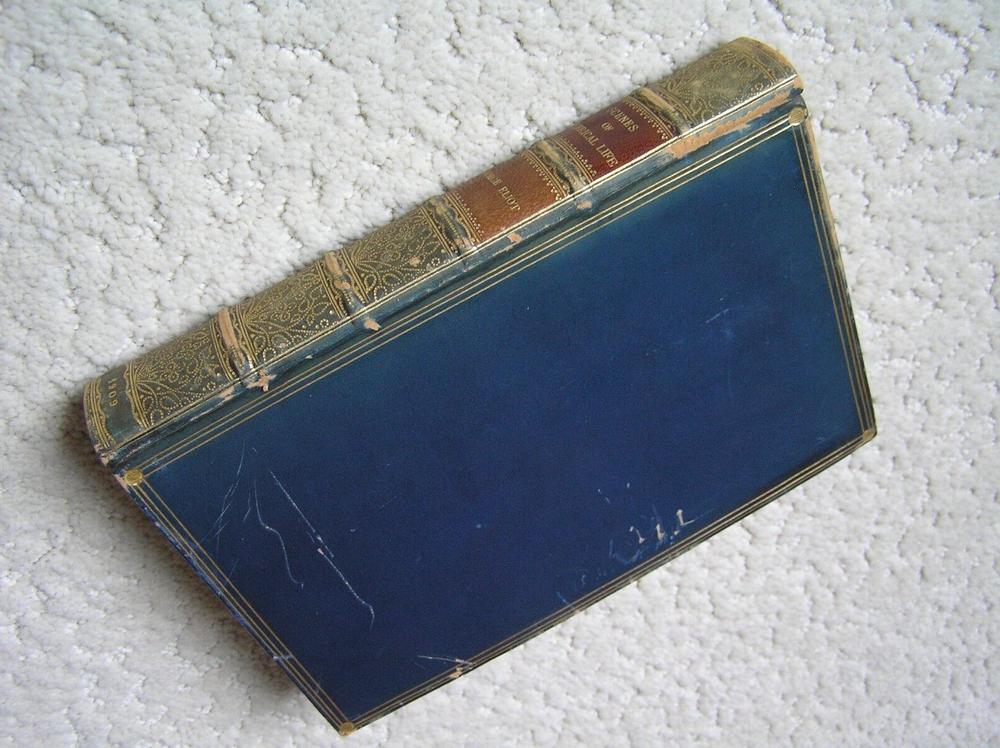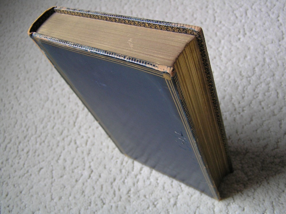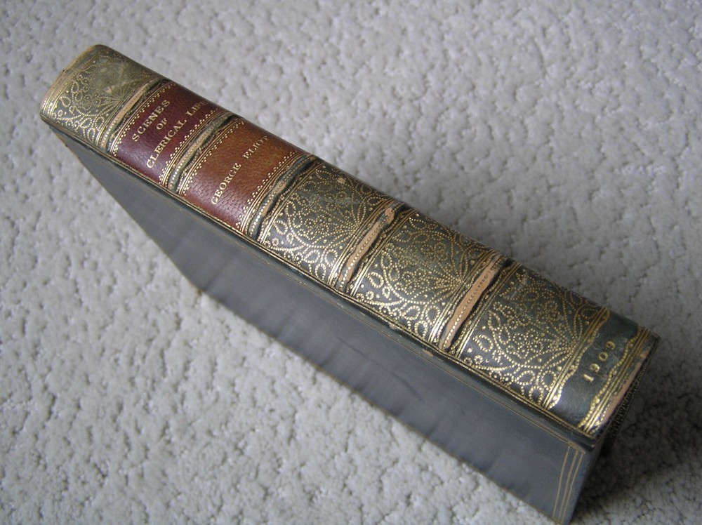 GEORGE ELIOT – Scenes of Clerical Life – 1909 With Illustrations by Hugh Thomson Macmillan and Co., Limited – St. Martin’s Street, London First printed in Cranford Series 1906 Reprinted 1909 Size: 7-3/8” height Color: green/blue – the cover looks blue in photos because of natural lighting – cover looks dark green in artificial light – Leather binding with gilt trim and gilt on all edges – photos show the wear on the cover and spine – the dye rubs off Illustrations: There are 16 color illustrations and 35 black-and-white illustrations. The illustrations do not have text on their reverse sides and the color illustrations are on heavier stock. I believe they would look very good individually framed. One of the illustrations came loose when the book was being photographed for this listing. Condition: complete, no missing pages, no dogeared pages, no marks, no highlighting, no underlining – not damaged by water, smoke, fire, insects No returns Free shipping via USPS Media Mail