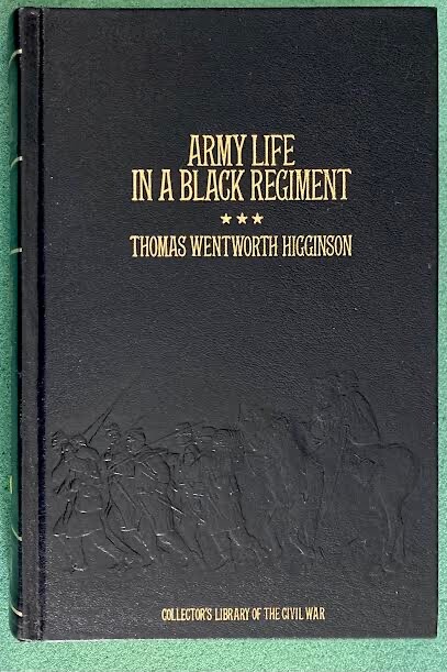 Army Life In A Black Regiment. Offer is for this leather bound hardcover book with a 3-dimensionalized image of soldiers on horse and on foot on the front, gold embossed leather cover. Gilt paper edges. Reprinted in 1982 from the original 1870 edition. The book is in like new condition with very minimal shelf/handling wear. Tight, straight, square spine. Text is unmarked. No bent pages. No bent/impinged cover corners/edges. No decals. Not remaindered. The intact place marker ribbon appears not to have been moved from original manufacturers location. Ships bubble wrapped, securely packaged in a cardboard box. See photos.…cb