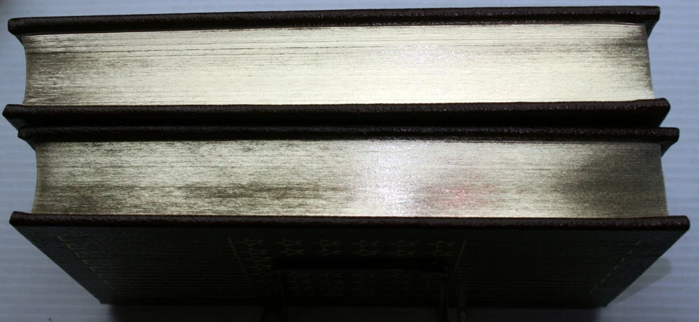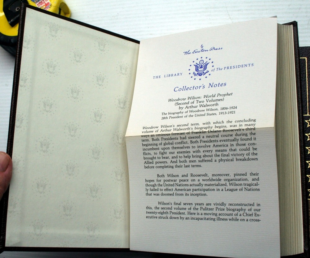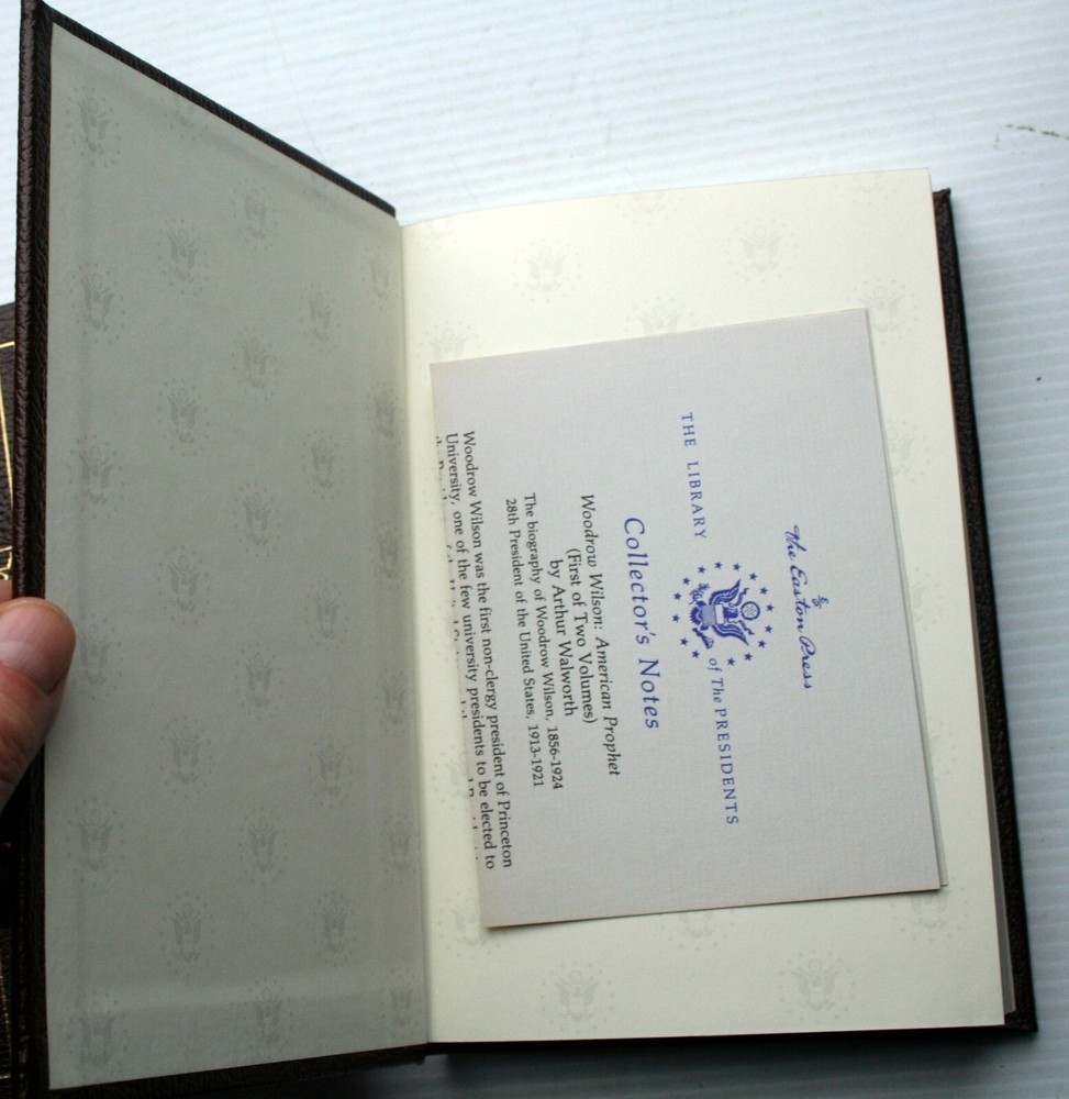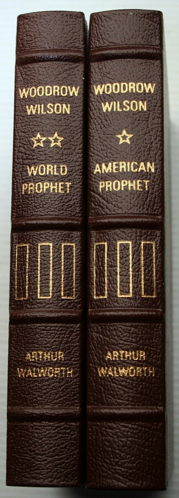 Matching set, acquired together. Tight, flat, square, sharp books with 22K gold inlay and edge treatment with very minor blemishes. Marker ribbons are without fraying. Both books have silk moire end pages, which were dropped in later printings. Both collectors' notes are included. Shelf transfer on the bottom edge. We have cleaned and conditioned these books. The set won the Pulitzer in 1959 for Biography or Autobiography, one year after it was published. Walworth apparently undertook the mission to complete a biography of Woodrow Wilson at the behest of Harvard professor Arthur Schlesinger, Sr. When completed (after a decade of research by Walworth) this biography represented the most substantial effort on Wilson since Ray Stannard Baker completed an eight-volume study of Wilson in 1939. The first volume (“American Prophet”) follows Wilson from childhood to the third year of his presidency while the second volumes follows the build-up to World War I, Wilson’s reluctant engagement in the global conflict and his efforts at ensuring an enduring peace. Wilson’s post-presidency was covered efficiently (in about a dozen pages) but effectively. The earliest impression this biography offers is one of reverence – not for Wilson himself (which the author may have intended) but for the historical value of the biography itself. The painstaking work Walworth undertook to meticulously reassemble Wilson’s life is obvious. And Walworth’s portrayal of Wilson, while generally flattering, also exposes many of his flaws.