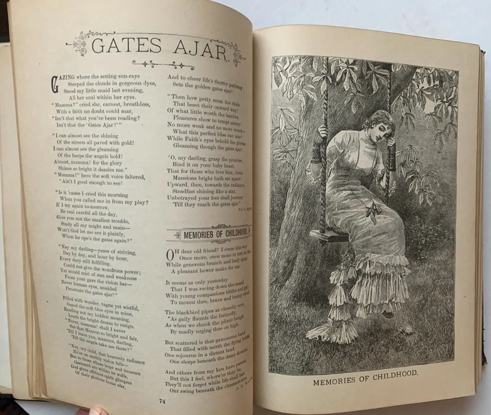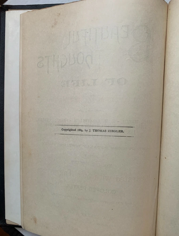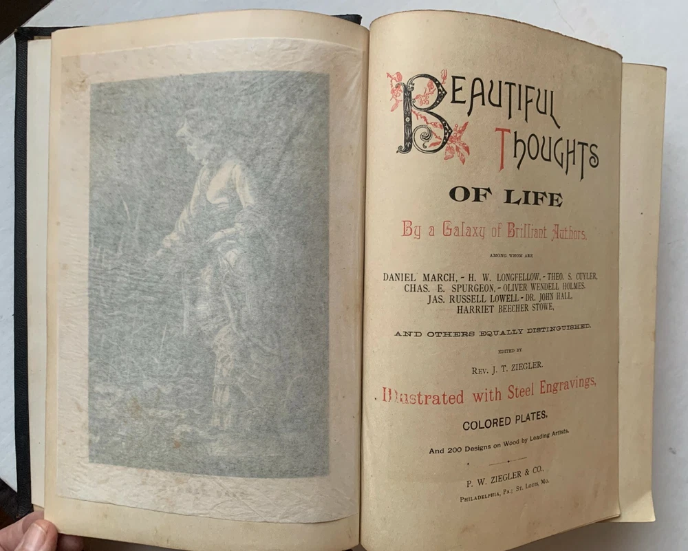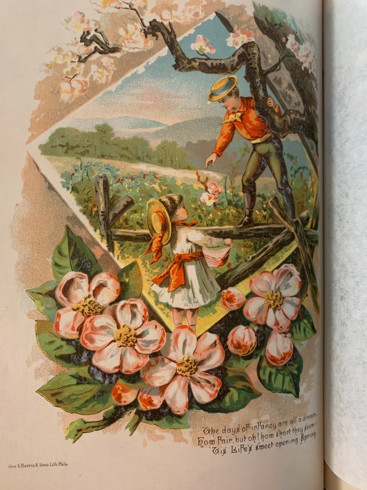 A beautiful anthology "By a Galaxy of Brilliant Authors" including Harriet Beecher Stowe, H.W. Longfellow, Oliver Wendell Holmes and many others. Four colored lithographs by W.W. Denslow "Seasons of Life" bright and vivid. A scarce first edition published in 1889 by P.W. Ziegler & Co. There is an inscription dated 1890 inside. The book is in four parts with an accompanying lithograph for each part: Child/Spring, Youth/Summer, Adult/Autumn and Old Age/Winter. Hundreds of touching poems, observations, and simple stories from the very best authors of that time. PROCEEDS BENEFIT OUR LOCAL LIBRARY PROGRAMS- THANK YOU FOR LOOKING!