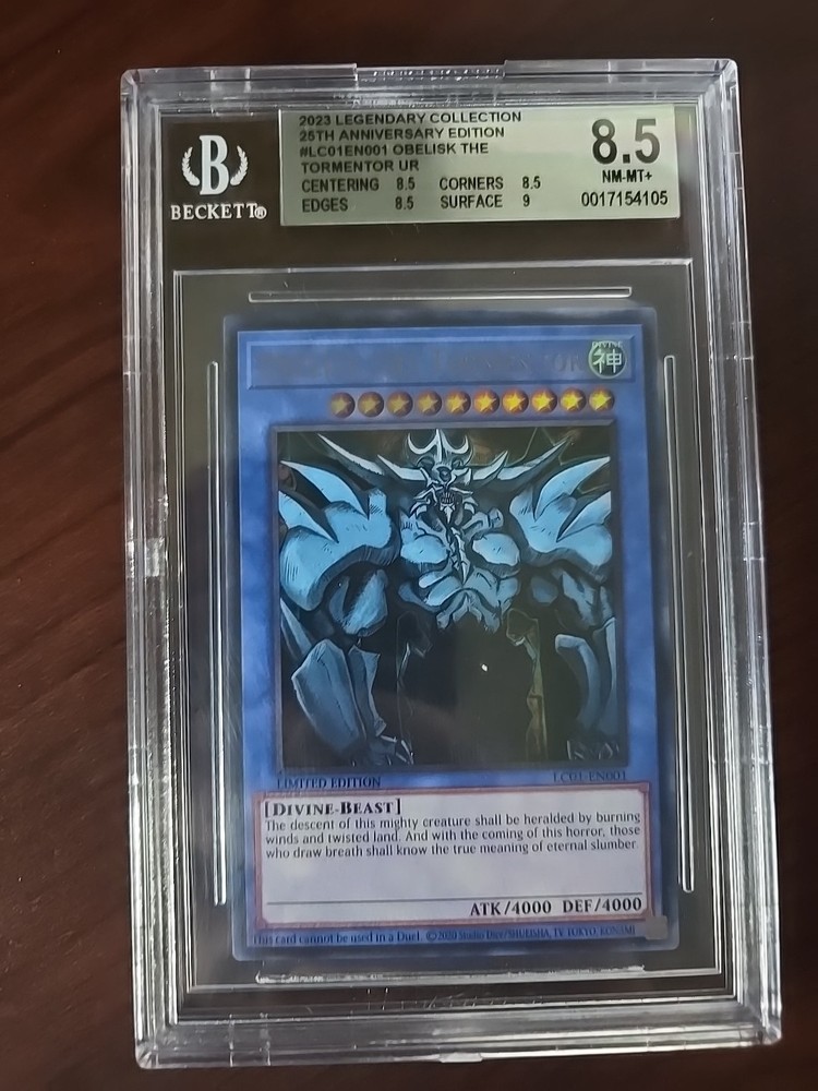This rare and highly sought-after card is a must-have for any serious Yu-Gi-Oh! TCG collector. With its stunning artwork and powerful abilities, Obelisk the Tormentor is a force to be reckoned with in the game. This particular card is from the Legendary Collection: 25th Anniversary Edition and is Ultra Rare, with a defense/toughness of 4000 and an attack/power of 4000. It is a limited edition card with a card number of LC01-EN001 and features the attribute of Divine-Beast. The card is in English language and manufactured by Konami. Its a great addition to any collection or to use in a duel.