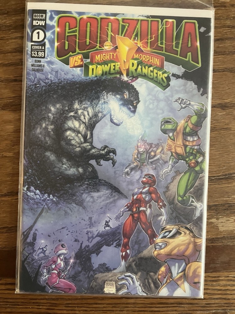The product is a comic book titled "BOOM IDW GODZILLA VS MIGHTY MORPHIN POWER RANGERS #1 Cover A" featuring the popular characters Godzilla and the Mighty Morphin Power Rangers. This single issue, part of the Modern Age era, is published by IDW Publishing and is a part of the Power Rangers universe. The comic combines the iconic Godzilla franchise with the beloved Power Rangers series in a dynamic and action-packed storyline. This collectible item is sure to be a hit among fans of both Godzilla and the Power Rangers.