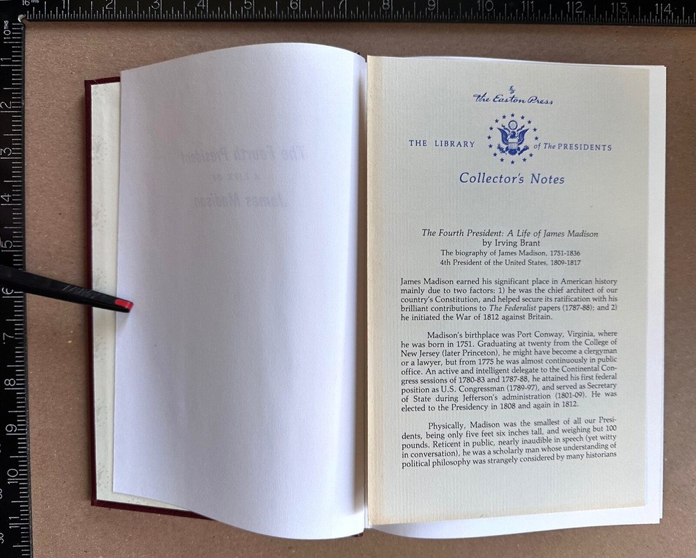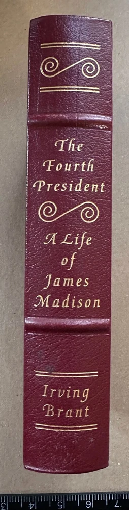 TITLE: The Fourth President: A Life of James Madison (Easton Library of the Presidents, No. 4) AUTHOR: Brant, Irving AUTHOR 2 (if applicable): AUTHOR 3 (if applicable): ILLUSTRATOR (if applicable): PUBLISHER: The Easton Press, Date: c. 1986 ISBN: N/A (pre-ISBN publication) FORMAT: Leatherbound, 1072 pages EDITION: First Edition Thus PRINTING [if applicable]: 1st Printing (No Later Stated) BOOK CONDITION: Very Good JACKET CONDITION: No Jacket (As Issued) DIMENSIONS (if available): 9.25 x 6.50 x 2.25 in. approx. KEYWORDS: James Madison, President, United States, Easton Library, 4th President, America, 1800s, 19th Century, Biography, History, First Americans, DESCRIPTION: From the Collector's Notes: "If there is one single man most responsible for making the United States different and distinct from other countries, it is certainly Thomas Jefferson. No other founding father had as powerful and as lasting an effect on the future of the new nation. Jefferson's unique vision of what the United States should be, as well as his egalitarian personal philosophy, have become essential elements of the American political system and the American credo of individual rights and freedoms. A prodigious and fascinating talent - a clever scientist and inventor as well as the foremost American architect of his time - Jefferson rose to fame as one of the most outspoken of the American revolutionaries. He secured a prominent place in history as the author of the Declaration of Independence: 'We hold these truths to be self-evident, that all men are created equal, that they are endowed by their Creator with certain unalienable rights ... that to secure these rights, Governments are instituted among Men, deriving their just powers from the consent of the governed ...' In a world ruled by the whims of hereditary monarchs and their entourages of titled and landed aristocrats, these powerful words gave voice to the aspirations of people everywhere…" This is the Easton Library of the Presidents reprint edition of Brant's biography of James Madison, originally published by Bobbs-Merrill in 1970. For convenience, I have numbered these volumes based on the order of the Presidencies; numbers do not reflect the order in which the volumes were originally released. This copy includes the original collector's notes. The original custom bookplate has been used, affixed to the IFC and filled in in gold metallic ink. If you're keen on a fresh one rather than a bit of fresh paper pasted over the one on the book, let me know and I can provide a replacement on an individual request basis. CONDITION: Light shelf-wear to covers, some wear and foxing to the outside edge gilt, gilt slightly worn / aged on the top of the text block, the interior appears clean and unmarked. Slight age-toning to outside edge of the Collector's Notes. A solid VG copy. FROM THE BOOKSELLER: Thank you for visiting the Dactyl Books eBay Store! We are a virtual second-hand and antiquarian reseller of books specialising in History, Science, Literature, and Mystery & Detective Fiction, but we have a little bit of everything in our stocks! We are listing new items all the time, but if you are looking for a specific title or edition, don't hesitate to send it on to us and we will be glad to check and give you an opinion on how best to find your desired title. NOTES ON EDITIONS: We use a number of resources to attempt to determine the edition of the book that we are listing. My most frequently referenced resource is Zempel and Verkler's "First Editions: A Guide to Identification," although we also use other internet sources and make comparisons with listings we find on various internet sites. We strive to be extremely careful and diligent in describing our listings, but if you receive a book and don't feel that it's quite what you ordered, please contact us through the "Contact Seller" link to see what we can do for you. To avoid the chances of this happening, if you have a question about a book or other item, or would like to see additional photos, please use the "Contact Seller" link in the item description and let us know what you need. We will do our best to answer your questions *before* any sale. TERMS & ABBREVIATIONS IN OUR LISTINGS: For your convenience, here is a list of terms and abbreviations that we commonly use in listings: IBC: Inside Back Cover IBEP: Inside Back End Paper IFC: Inside Front Cover IFEP: Inside Front End Paper Text-Block: The body of the book contained between the covers. Thanks for your interest in Dactyl Books!