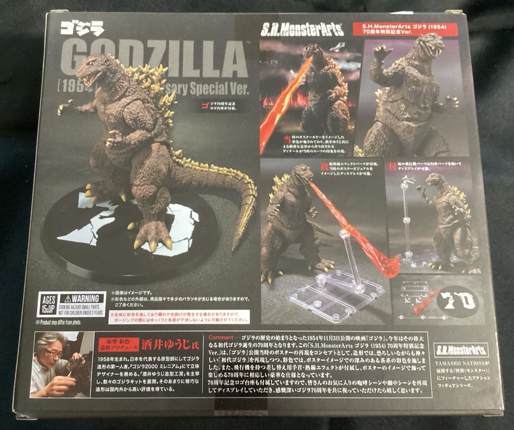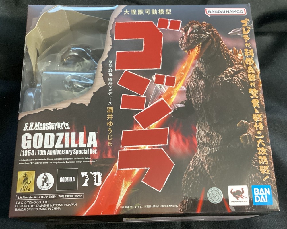IN HAND Bandai S.H.MonsterArts Godzilla 1954 70th Anniversary Figure NIB is a highly detailed action figure of the iconic Godzilla character from the Godzilla franchise. Manufactured by Bandai, this figure commemorates the 70th anniversary of Godzilla's creation in 1954. It is a collectible item that showcases the original design of Godzilla as seen in the first movie.