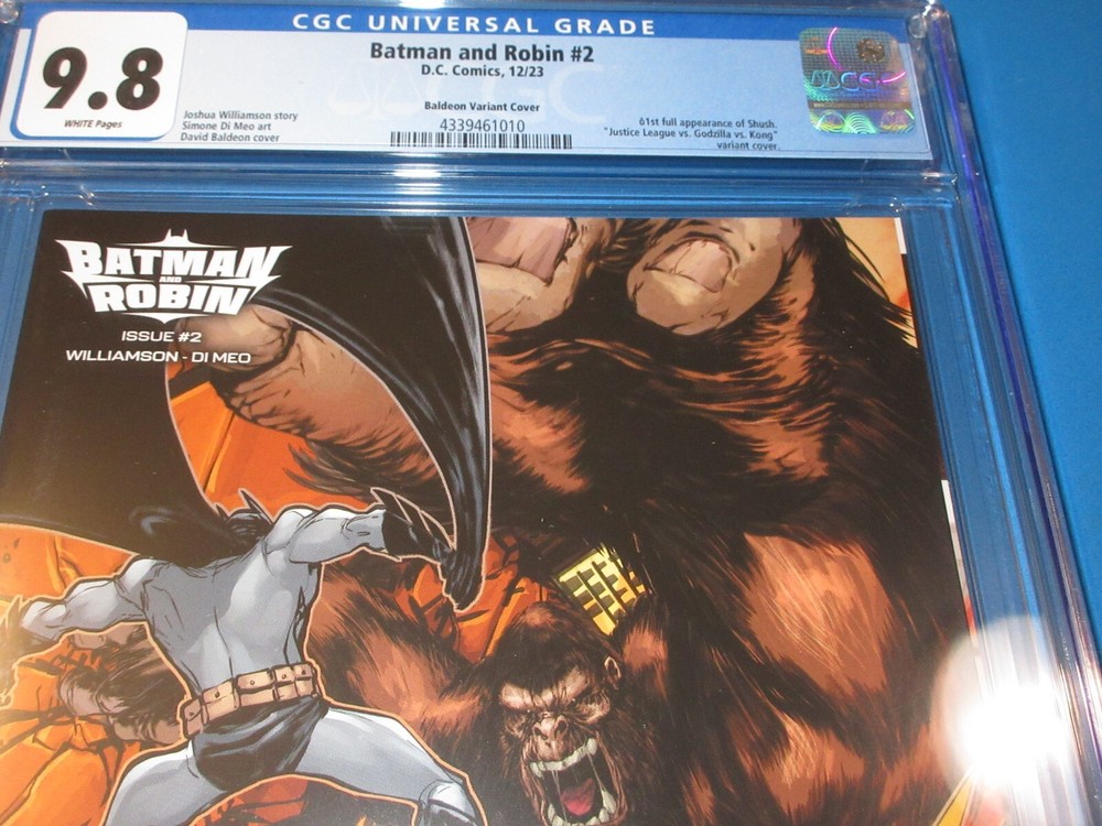 This auction is for Batman and Robin #2 variant in CGC 9.8 with a new case condition. This week we are selling an incredible collection including Amazing Spider-man , Silver Surfer, Dr. Strange, X-men, Iron Man, Hulk, Fantastic Four, Black Panther, Batman, CGC books and many other 1st appearance key issues. You are sure to find something you are looking for this week. Bonus Offer! Win 2 or more comics and get a bonus comics (10 dollar minimum) and an upgraded bonus if you win 10 auctions. Our Shipping rates are: USA: Free for single comics with no limit, multiple comic lots have a charge and additional combined lots are half price. Canada: 13 Dollars for the 1st comic and 1.50 each after that. International: 15 dollars for the 1st comic and 1.50 each after that. CGC books are 9.99 for the 1st and 5 each after that in the USA, 22 bucks and 10 combined for Canada and 28 bucks and 14 combined for international. Feel free to ask questions. I guarantee superfast Domestic shipping! ...to open their eyes...that they may receive forgiveness of sins and a place among those who are sanctified by faith in me. Acts 26:18