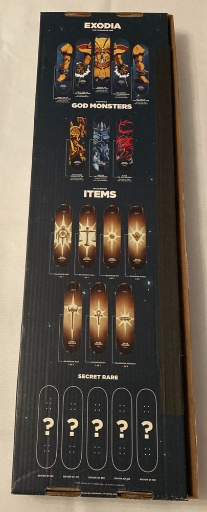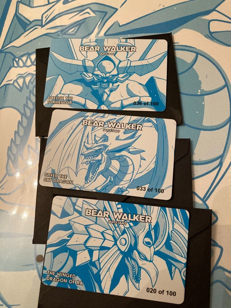 Bear Walker Yu-Gi-Oh! Egyptian God FULL SET SECRET RARE Skateboard Decks Ra Obelisk Slifer!!!!! Full Egyptian God Set of the Winged Dragon of Ra, Slifer the Sky Dragon, and Obelisk the Tormentor Bear Walker x Yu-Gi-Oh Skateboard Decks!! Beyond the common and holographic rarity, these boards are the 'Secret Rare' rarity, with only 100 of each board made! Boards are New and in great condition. Never used or skated with. Beautiful! See photos!! Size is a 8.25. (See photos for alternative measurements.) I will consider, review, and respond to any and all offers! I can combine shipping if you purchase anything else from me!! Please message me with questions or concerns!!!! I do my sourcing mainly thrift stores, retailers, and sometimes other places! If you have any questions about an item please ask before bidding/buying!
