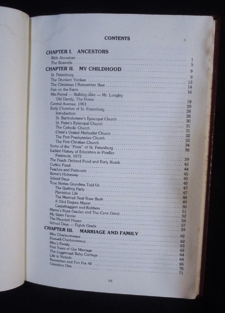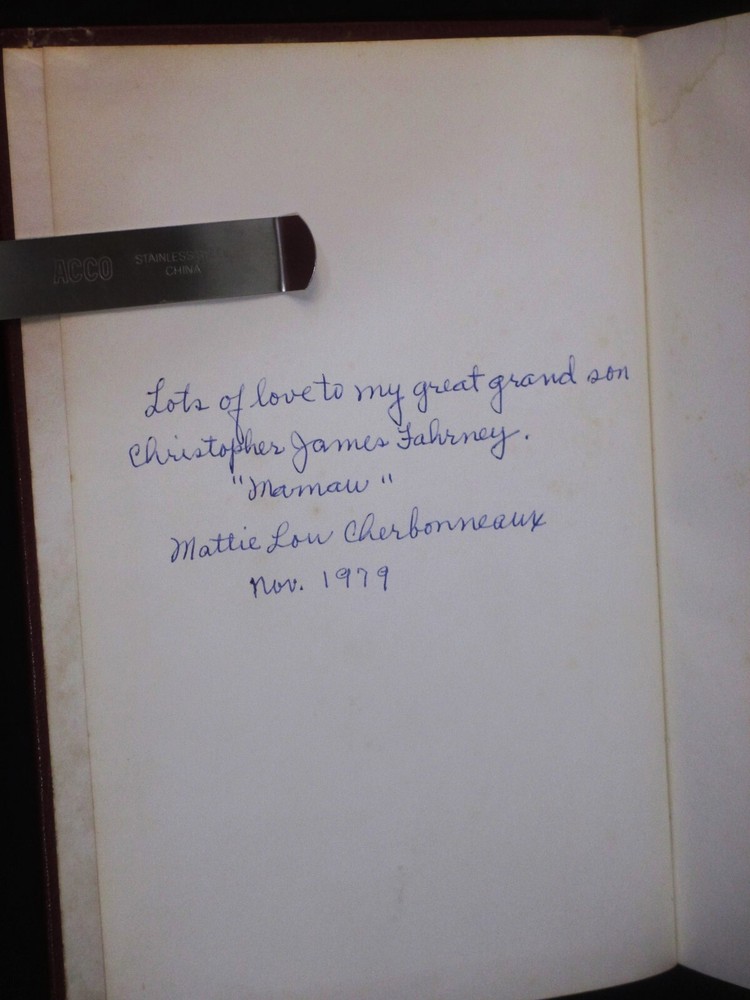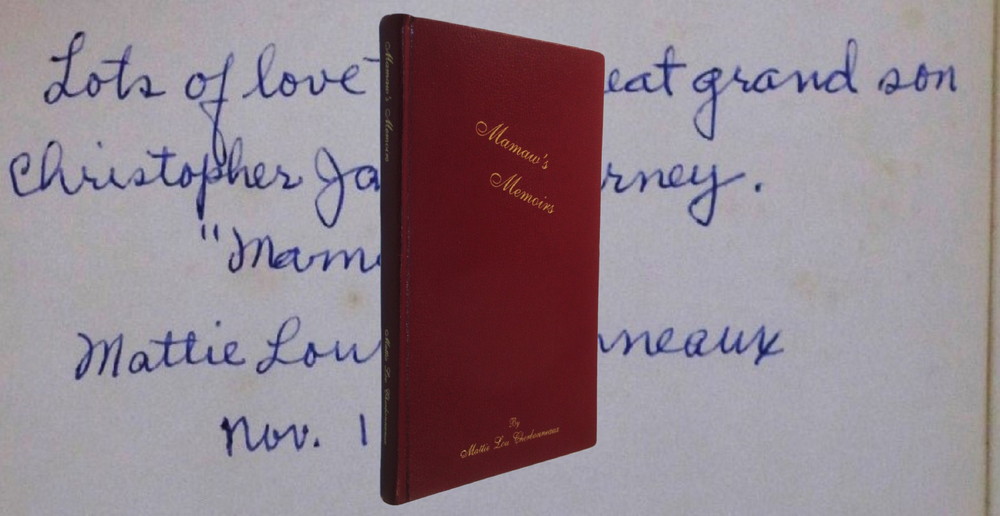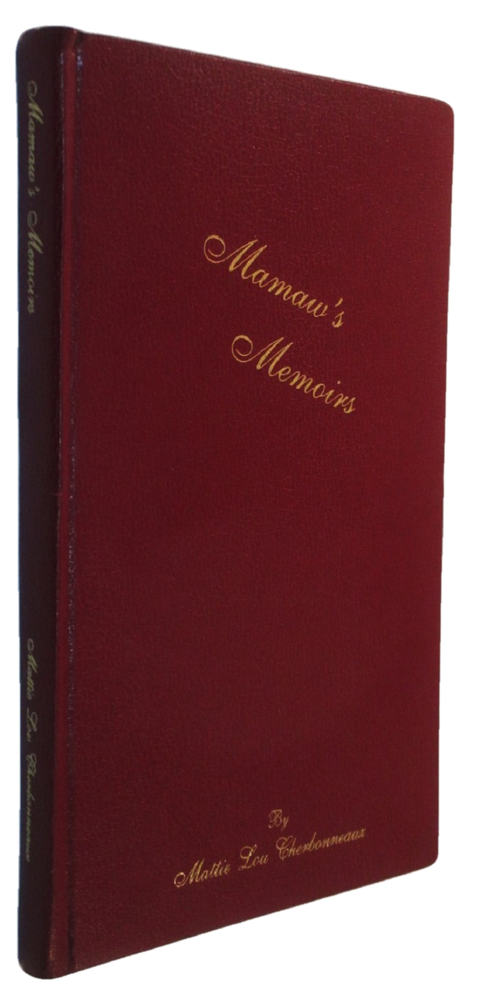 Mamaw’s Memoirs Mattie Lou Cherbonneaux Self published 117 page hardcover – unstated print date Red leather with gilt graphics Signed and inscribed by author (1979 inscription) ______________________________ Mamaw’s memoirs relates the stories of two grand moms: Grandma Bibbs stories to me and the recollections of my experiences to my grandchildren.