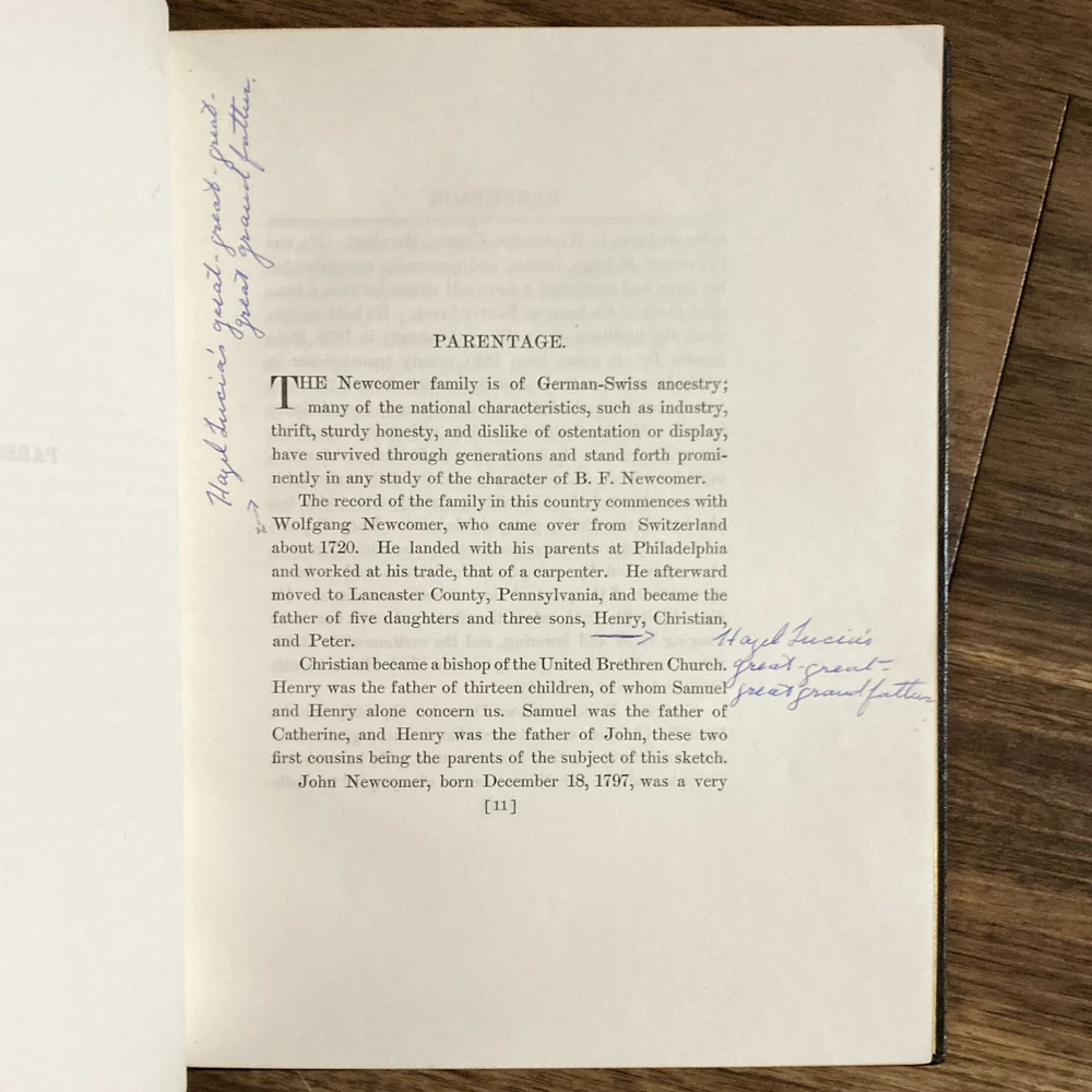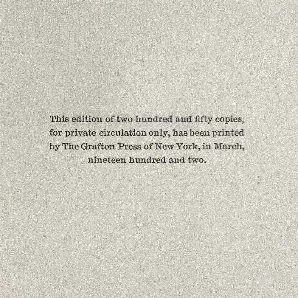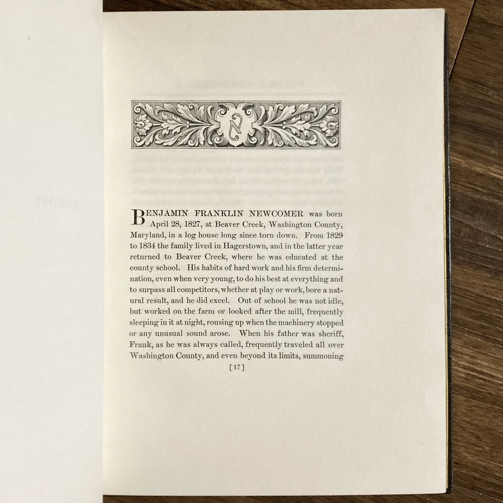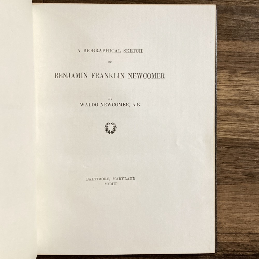 Limited, privately circulated edition (one of only 250 copies printed) leatherbound hardcover copy of A Biographical Sketch of Benjamin Franklin Newcomer by Waldo Newcomer (The Grafton Press, 1902). Inscribed by family member, Marie Hitt Newcomer. Incredibly rare book covering the life and works of the pioneer banker and railroad executive from the 19th century. Leather bound boards with gilt lettering. Gilded page edges and decorative endpapers, the free endpapers now are curling at top and bottom edges. Page on the opposite side of title page (likely a frontispiece portrait) appears to have been removed. Binding is firm and spine is straight. Some very sparse margin notes, otherwise all pages are clean and unmarked though tanned. See photos for condition. Packaged with care and shipped via USPS Media Mail