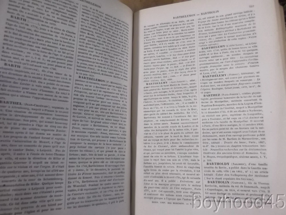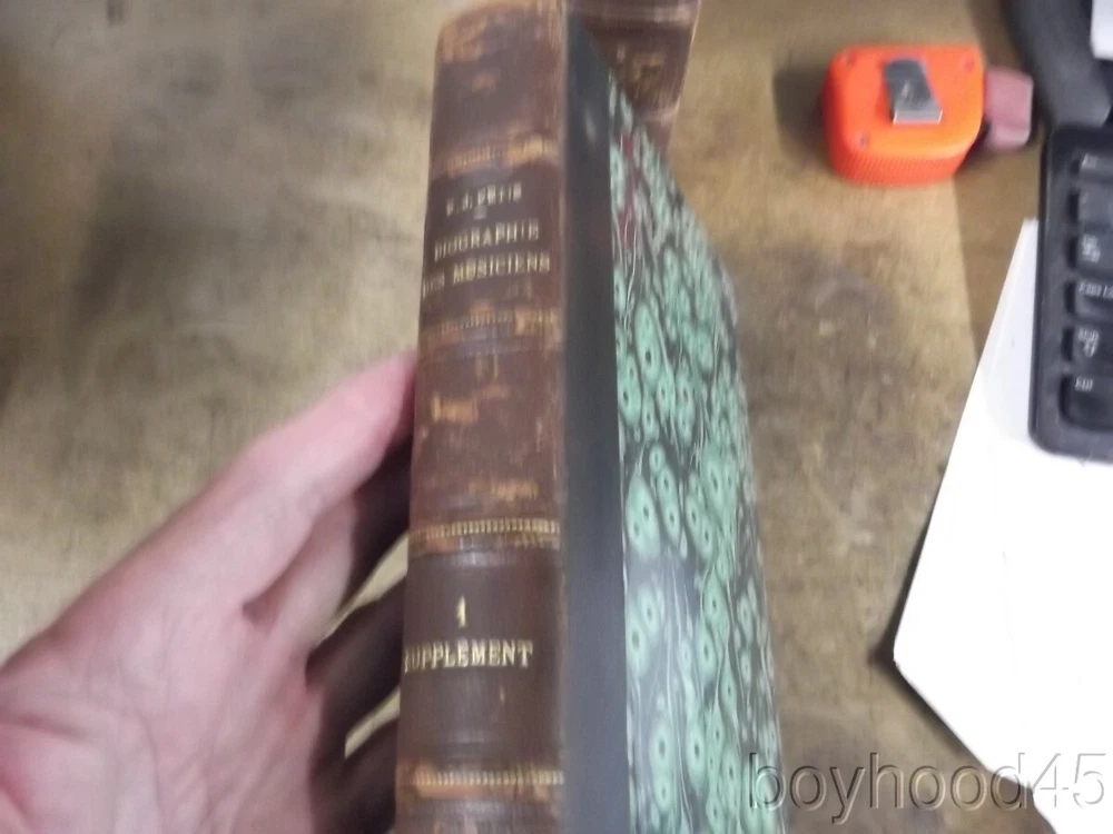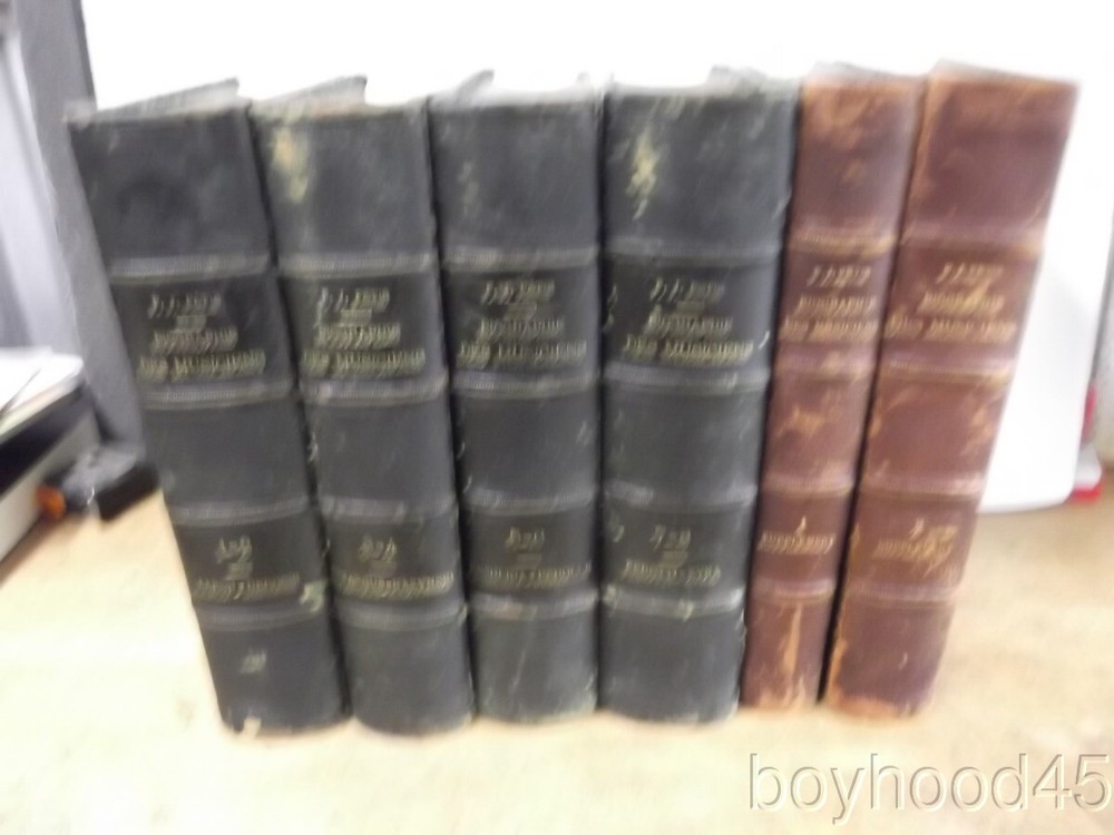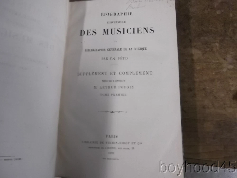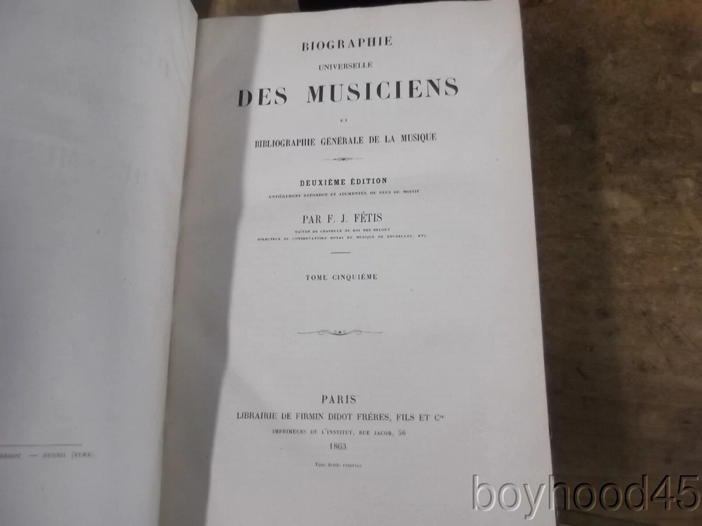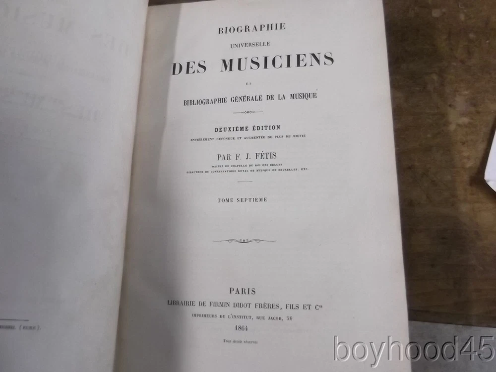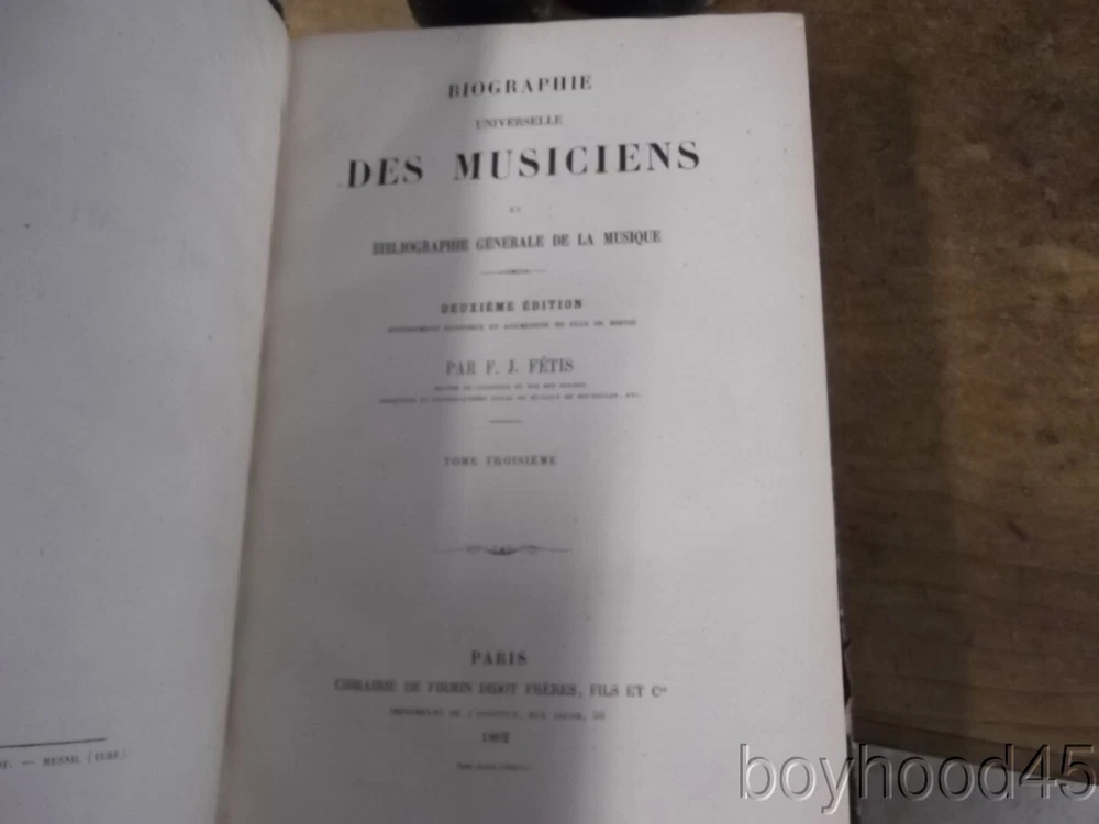 Biographie Universelle Des Musiciens Ed. by F.J. Fetis-8 Vols/2 Supplements-1860 Biographie Universelle Des Musiciens Ed. by F.J. Fetis-8 Vols/2 Supplements-1860 Click images to enlarge Description I have acquired the bulk of the library of noted opera historian and musicologist, Michael Kaye. This is "Biographie Universelle Des Musiciens," edited by F.J. Fetis. Eight volumes bound into four books plus two Supplemental Volumes. Published by Librairie De Firmin Didot Freres, Paris. The four volumes are the Second Edition, published 1860-1865. The two Supplemental volumes were published in 1878 and 1880, respectively. This set was uniformly bound in one-quarter leather (leather spines) with paper over board covers. Volumes show edgewear. There are gutter cracks on two of the volumes and hinge cracks to two volumes. Some cornr creasing to pages in one volume. ALL volumes are clean, unmarked and sound/solid books. The leather spines on the two Supplementary volumes have browned from sunning. Generally in Very Good condition. Books measure 6 1/2 X 9 3/8, app. 400+ to 500+ pages in each of the eight volumes. A SCARCE FEW copies of this set can be found on other internet booksites for upwards of $390 for 8 volume sets and $668 for sets containing the Supplemental volumes!!!!!!! I will offer this respectable complete set with Supplemental volumes for only $250.00 plus $25.00 S&H in the US. Condition Notes: Clean set that shows some expected wear. A nice solid, complete set!! Payment Paypal Shipping Domestic shipping: Fixed Shipping Charges. International shipping: Fixed Shipping Charges. Shipping Carrier Domestic International Shipping Locations Usps Book Rate $20.00 - - Usps Priority Intl - $160.00 Worldwide I will ship to: United States, Worldwide Vendio Images: More than just a pretty image. 250+ Mobile Responsive & Active Content Free Listing Templates with Vendio Sales Manager. Vendio provides powerful selling automation for sellers of all sizes. Get business information that counts! - Vendio Counters are active content free.
