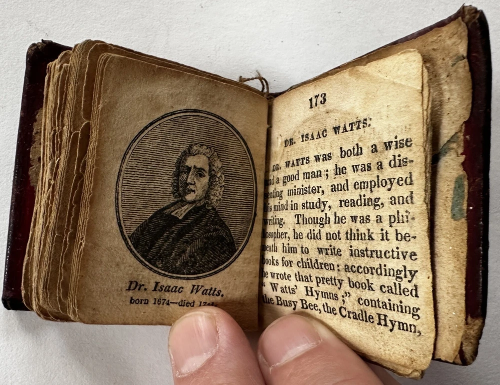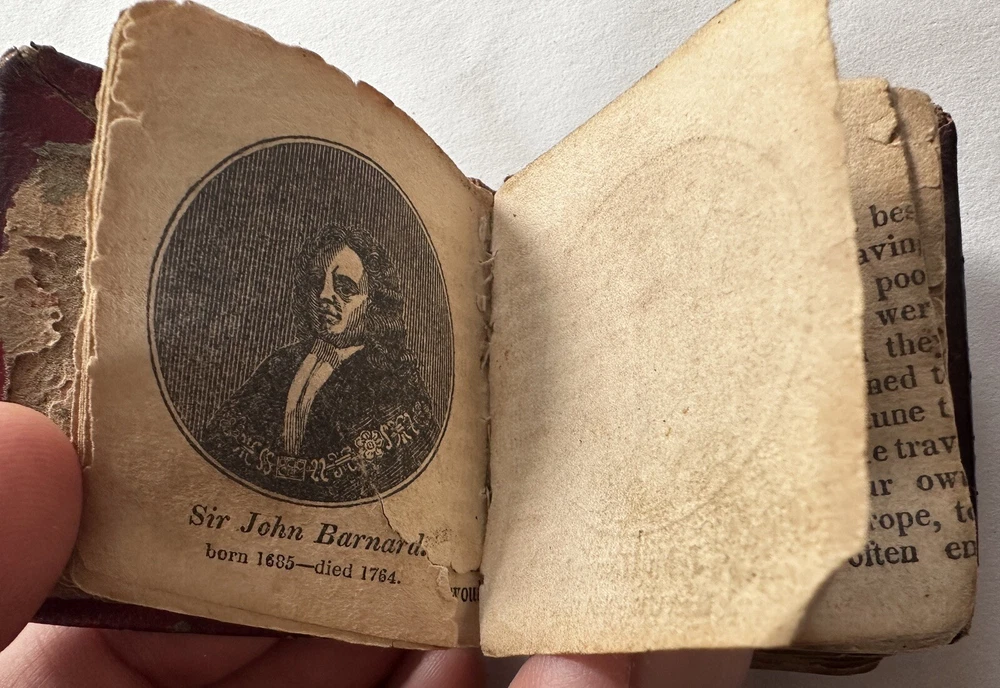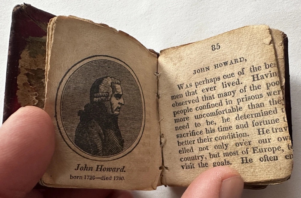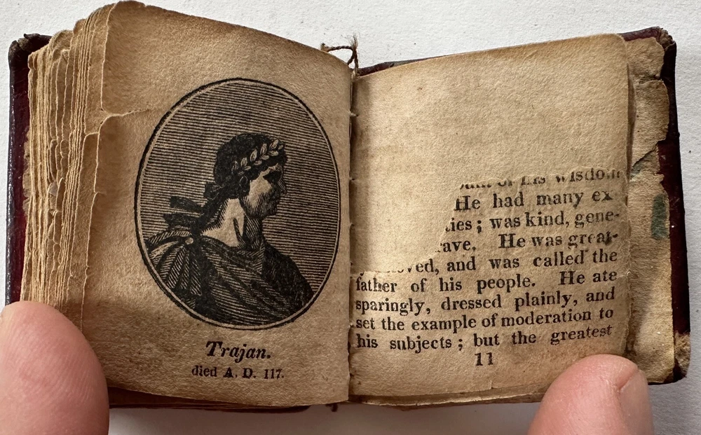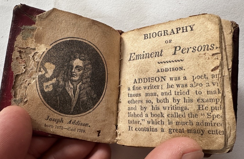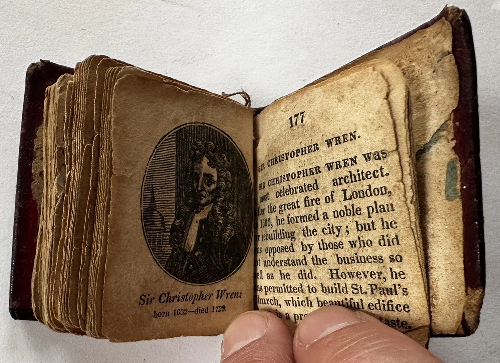 Biographies Eminent Persons c.1814 miniature Darton Harvey 27 portraits by Mills Biographies Eminent Persons c.1814 miniature Darton Harvey 27 portraits by Mills Biography of Eminent Persons. Published c1814-25 by Darton & Harvey with woodcut portraits by Wells. With early female owners name of Mary Wheeler Bolton. Miniature book in original period full leather (roan) binding, spine gilt lettered and ruled. Poor condition! Incomplete like many juveniles of this early period which manage to survive. Contains 27 tiny woodcut portraits (of 47), so lacking 20 portraits plus various scattered text leaves. Clearly resewn early on by an owner, text block shaken, missing pages, some pages defective or with edge damage, etc. Leather remains supple, small spine hole. Offered as it survives, still a very 200 year old charming miniature object intended for a child. Probably over 90-95% of the examples ever made have now long since perished or vanished. Any& all examples worthy of consideration, their age flaws enhancing the appeal. Book measures 2.5”H x 2 .25” W. B15001 Bondy, Miniature Books, p.65 (pl. 64).