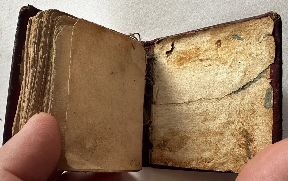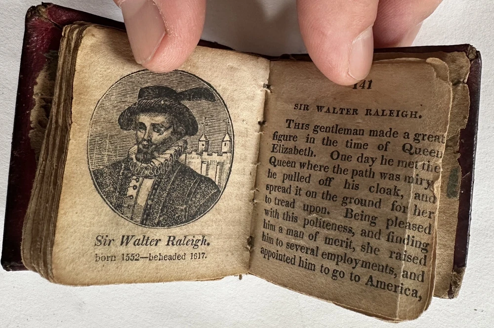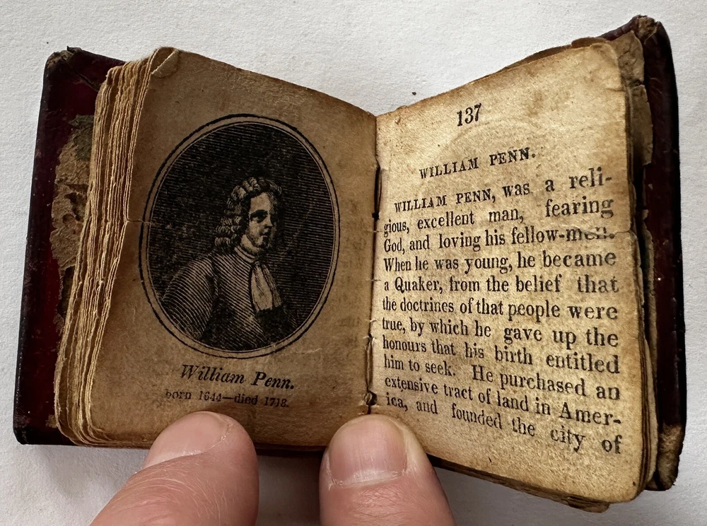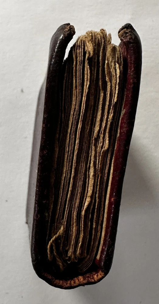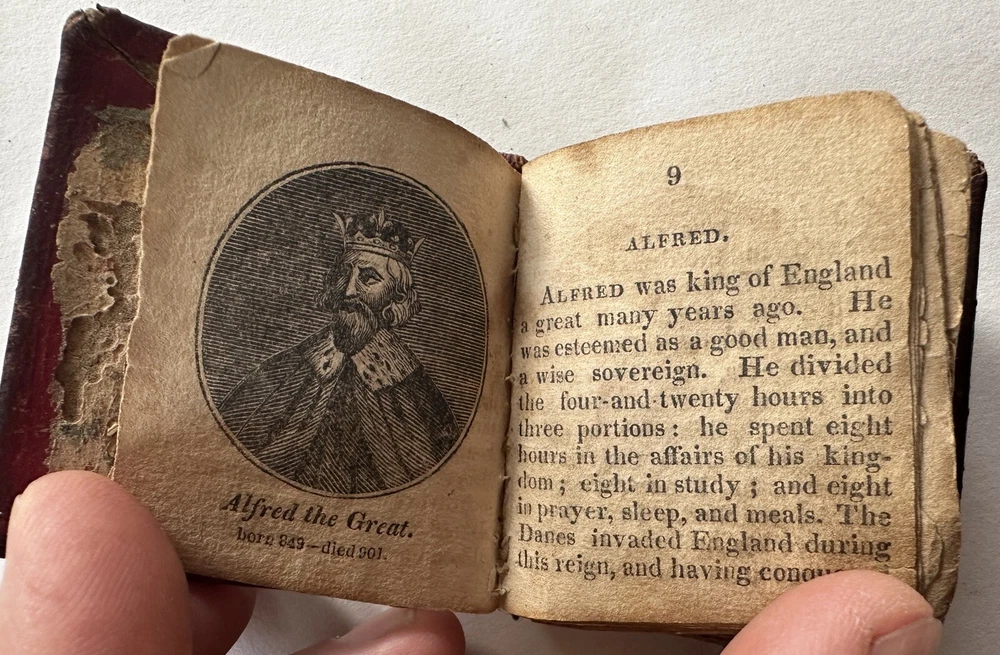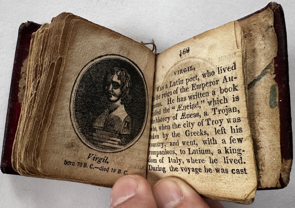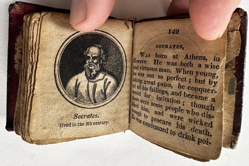 Biographies Eminent Persons c.1814 miniature Darton Harvey 27 portraits by Mills Biographies Eminent Persons c.1814 miniature Darton Harvey 27 portraits by Mills Biography of Eminent Persons. Published c1814-25 by Darton & Harvey with woodcut portraits by Wells. With early female owners name of Mary Wheeler Bolton. Miniature book in original period full leather (roan) binding, spine gilt lettered and ruled. Poor condition! Incomplete like many juveniles of this early period which manage to survive. Contains 27 tiny woodcut portraits (of 47), so lacking 20 portraits plus various scattered text leaves. Clearly resewn early on by an owner, text block shaken, missing pages, some pages defective or with edge damage, etc. Leather remains supple, small spine hole. Offered as it survives, still a very 200 year old charming miniature object intended for a child. Probably over 90-95% of the examples ever made have now long since perished or vanished. Any& all examples worthy of consideration, their age flaws enhancing the appeal. Book measures 2.5”H x 2 .25” W. B15001 Bondy, Miniature Books, p.65 (pl. 64).
