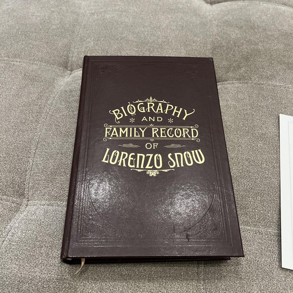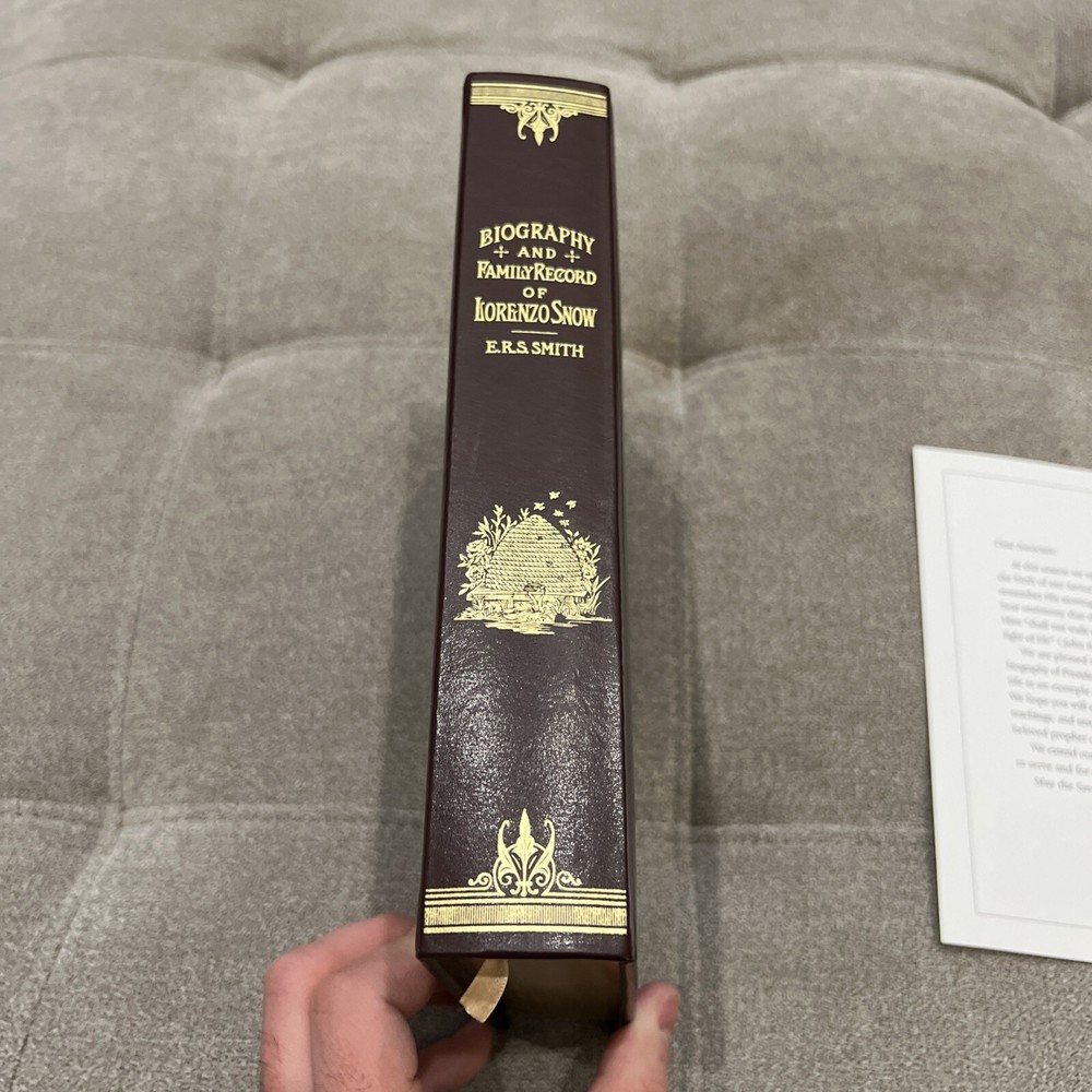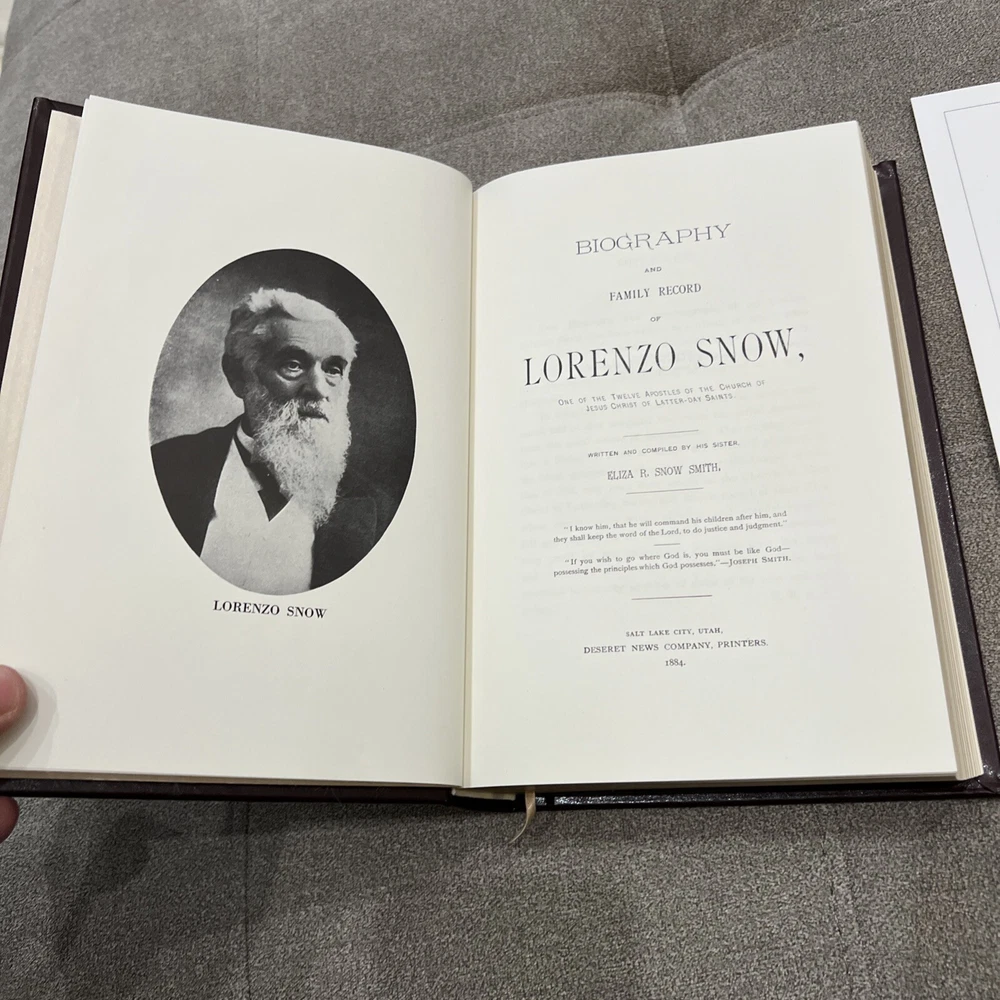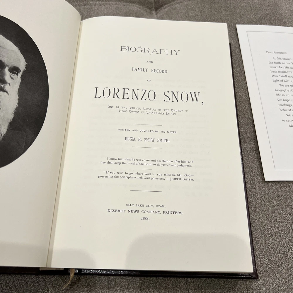 The product is a special edition leather-bound book titled "Biography and Family Record of Lorenzo Snow" by Eliza R. Snow, focusing on the early Mormon Church leader Lorenzo Snow. Published by The Church of Jesus Christ of Latter-Day Saints in 1999, this book is intended for young adults and adults. It features special attributes such as gold gilt page edges, a Christmas card from the First Presidency, and a satin ribbon marker. This special LDS employee gift edition includes a personalized touch and provides a detailed account of Lorenzo Snow's life within the context of the Mormon Church.