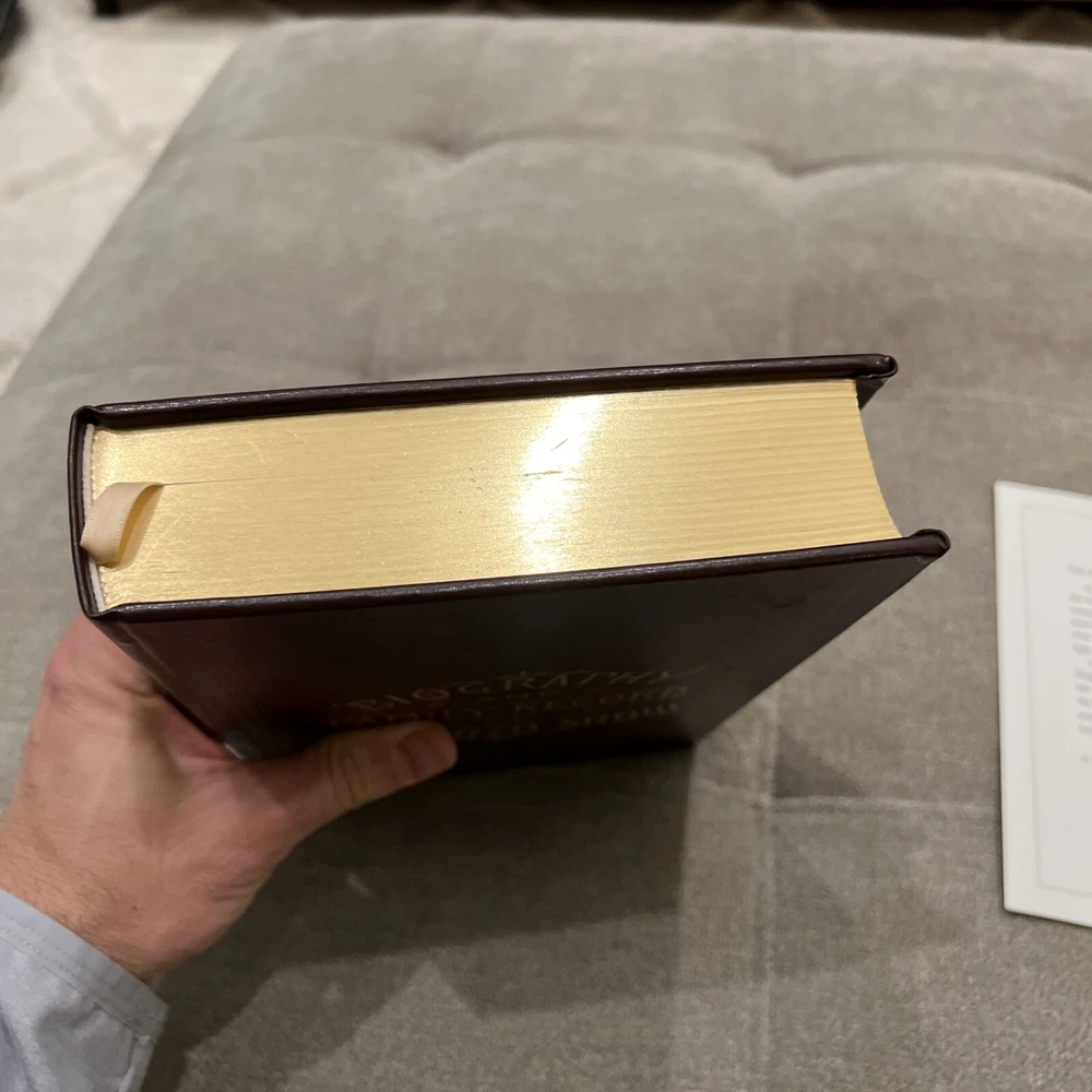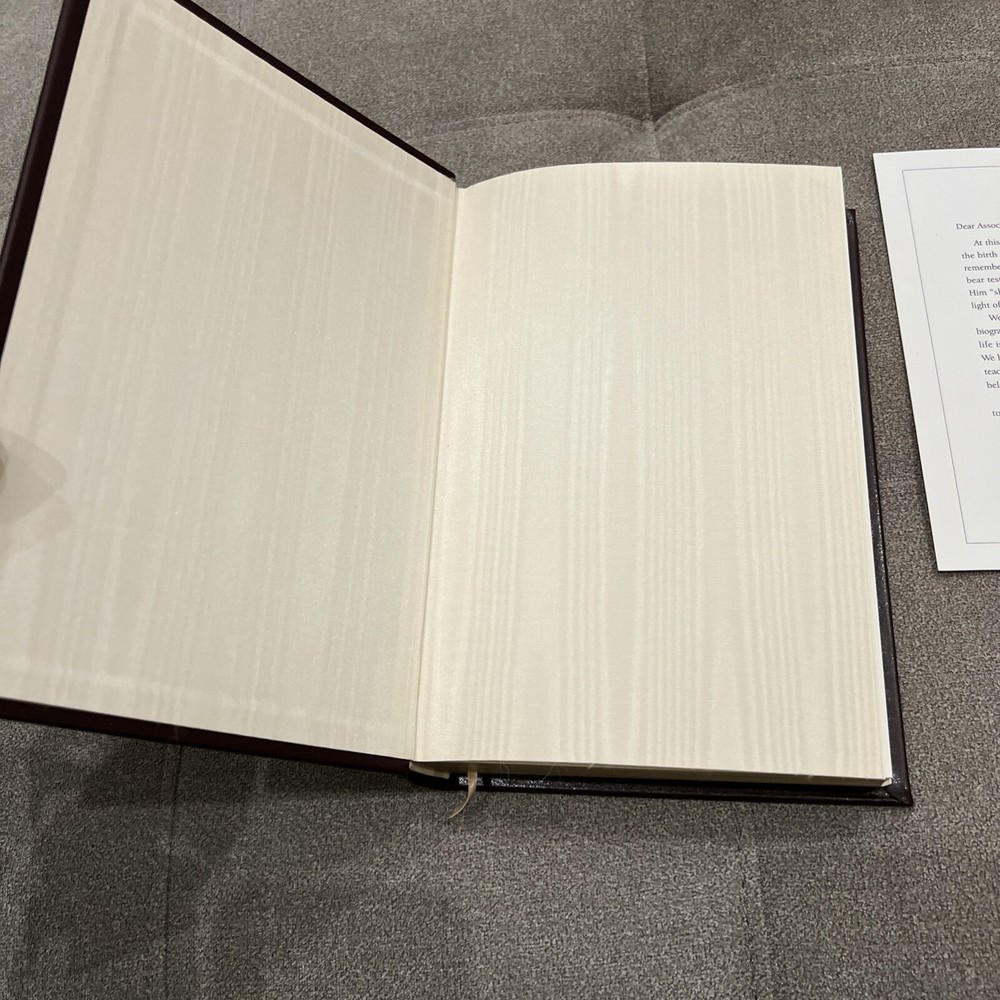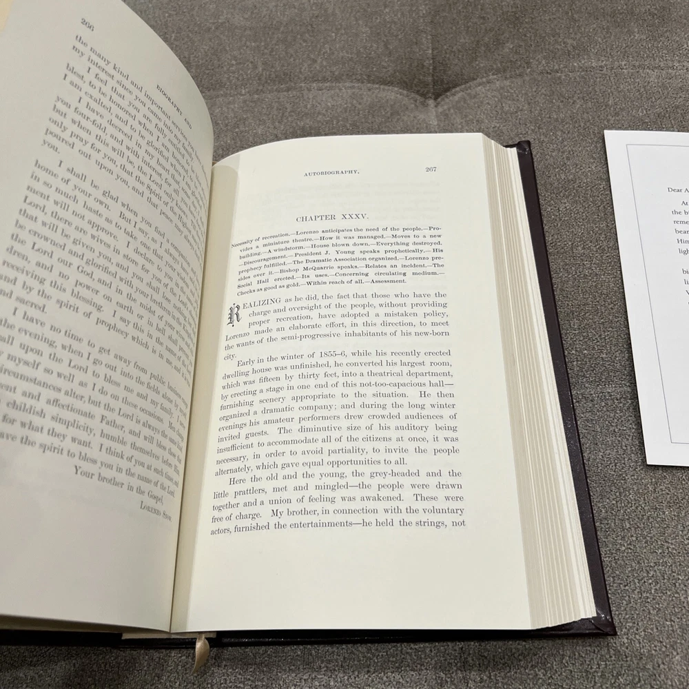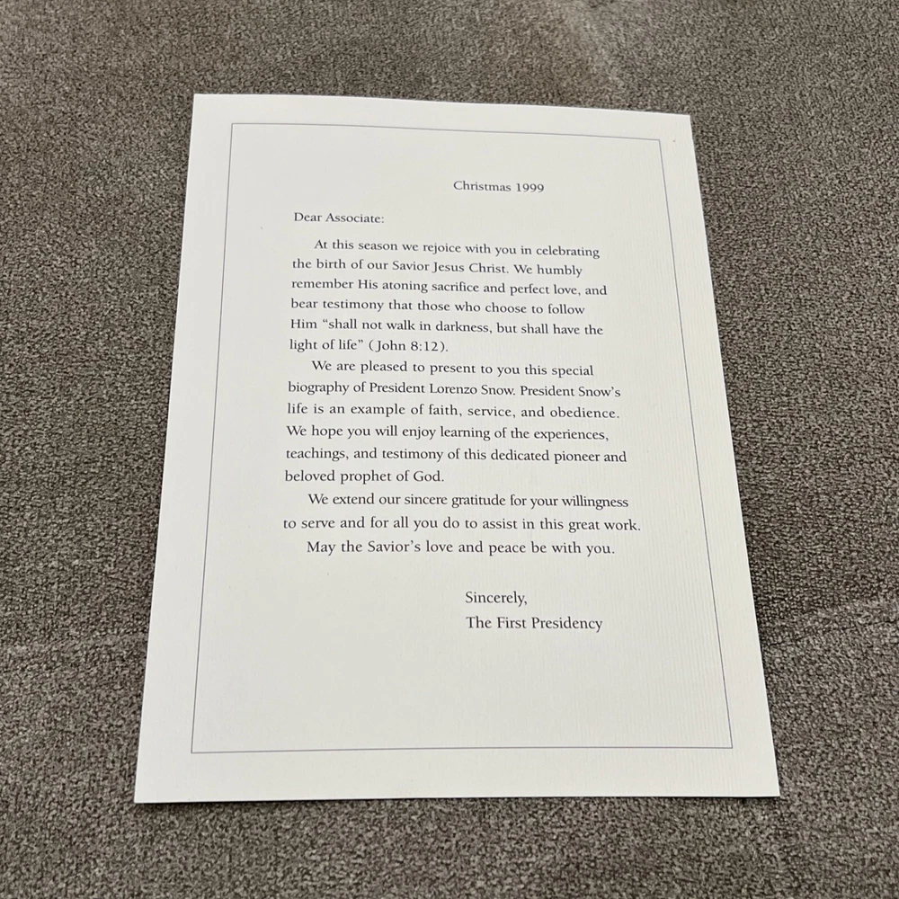 The product is a special edition leather-bound book titled "Biography and Family Record of Lorenzo Snow" by Eliza R. Snow, focusing on the early Mormon Church leader Lorenzo Snow. Published by The Church of Jesus Christ of Latter-Day Saints in 1999, this book is intended for young adults and adults. It features special attributes such as gold gilt page edges, a Christmas card from the First Presidency, and a satin ribbon marker. This special LDS employee gift edition includes a personalized touch and provides a detailed account of Lorenzo Snow's life within the context of the Mormon Church.