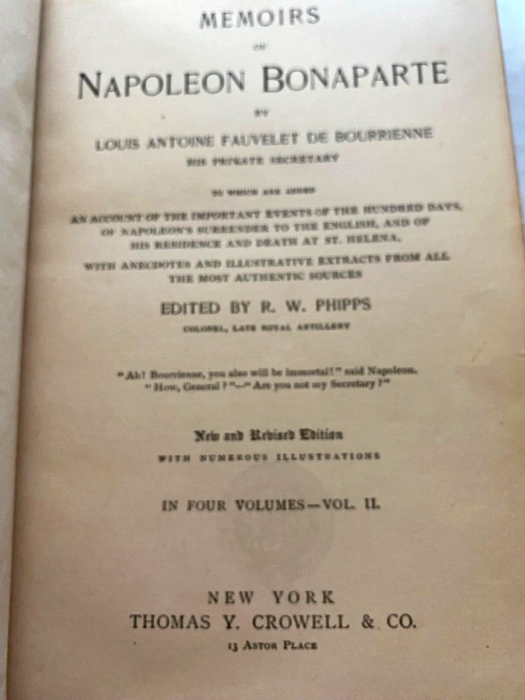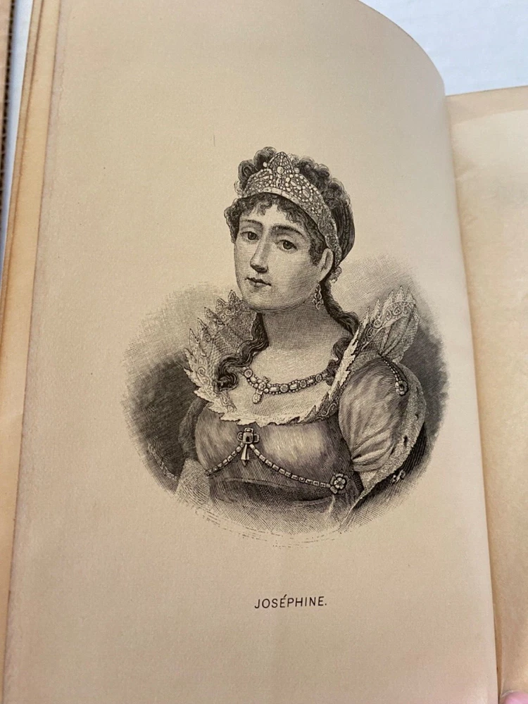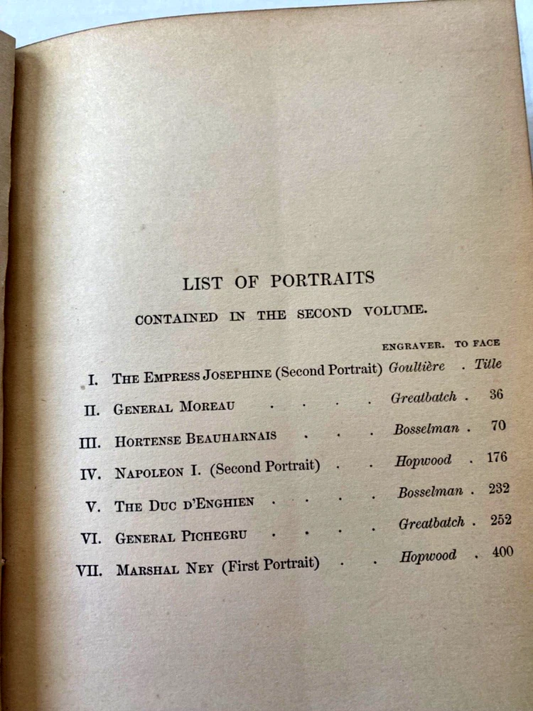 Antique leather-bound book titled "Memoirs of Napoleon Bonaparte" by Louis Antoine Fauvelet De Bourrienne. Published by Thomas Y. Crowell & Co. New York 407 pages and two pull out graphs (see photos).: Contains seven (7) portraits : Empress Josephine, General Moreau, Hortense Beauharnais, Napoleon, The Duc D'Enghien, General Pichegru and Marshal Ney. Also includes the engraver's name for each portrait. Very good condition. see photos