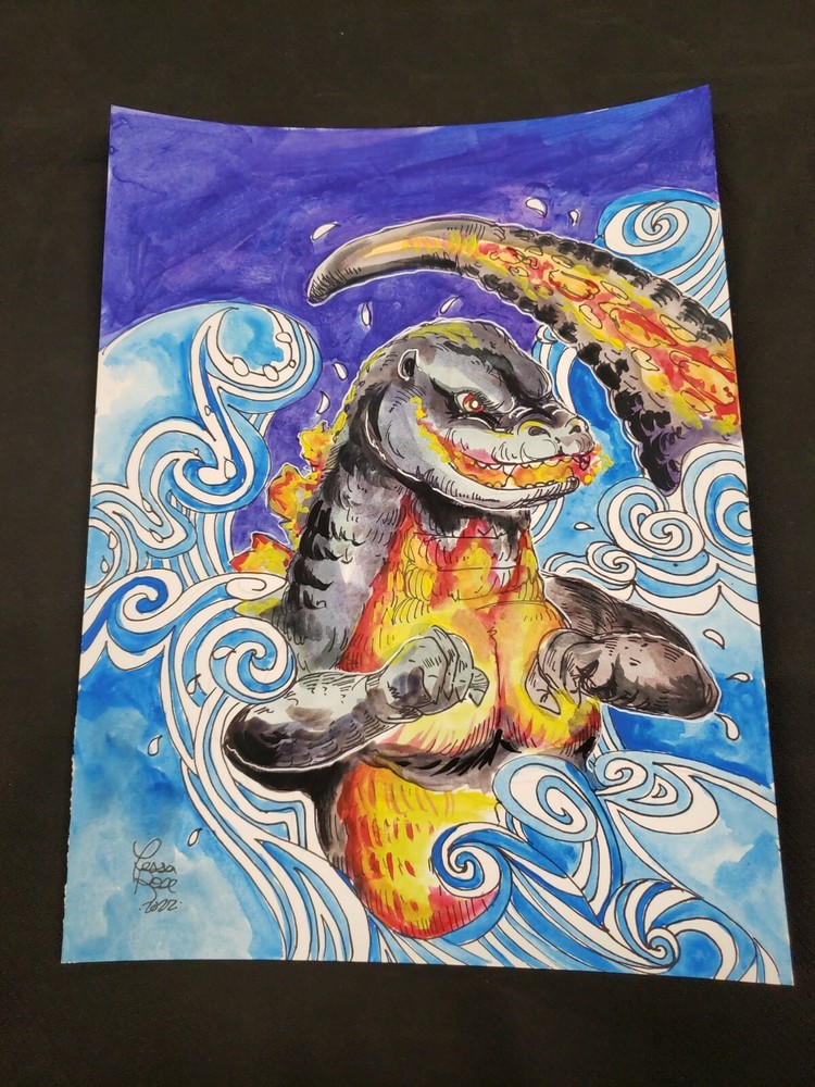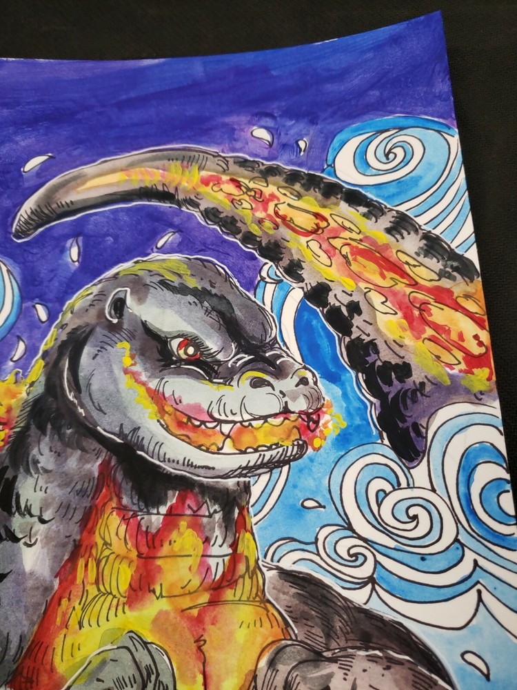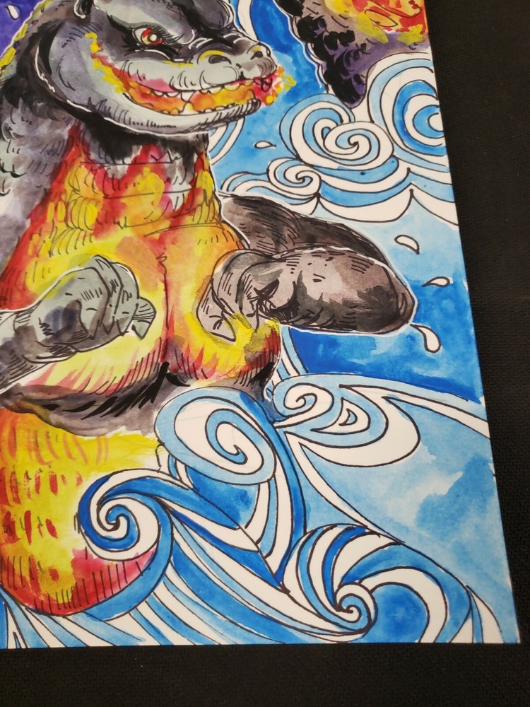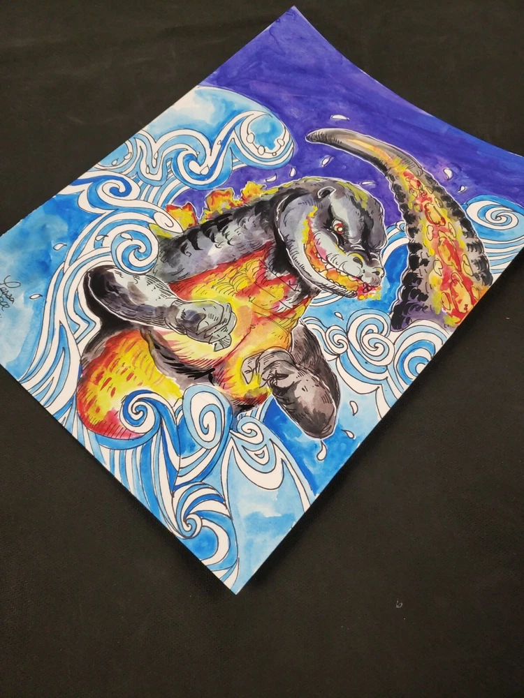 Tessa Rose Original painting Godzilla in Ocean Godzilla Art 9x12 acrylic paint and markers on watercolor paper Shipped with USPS first class...