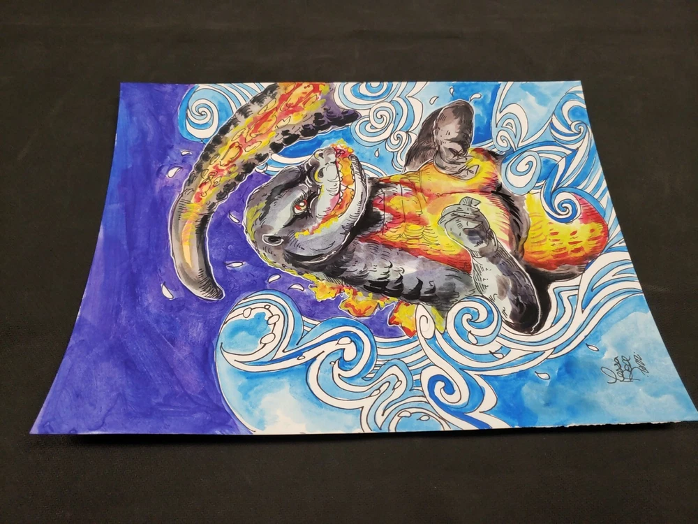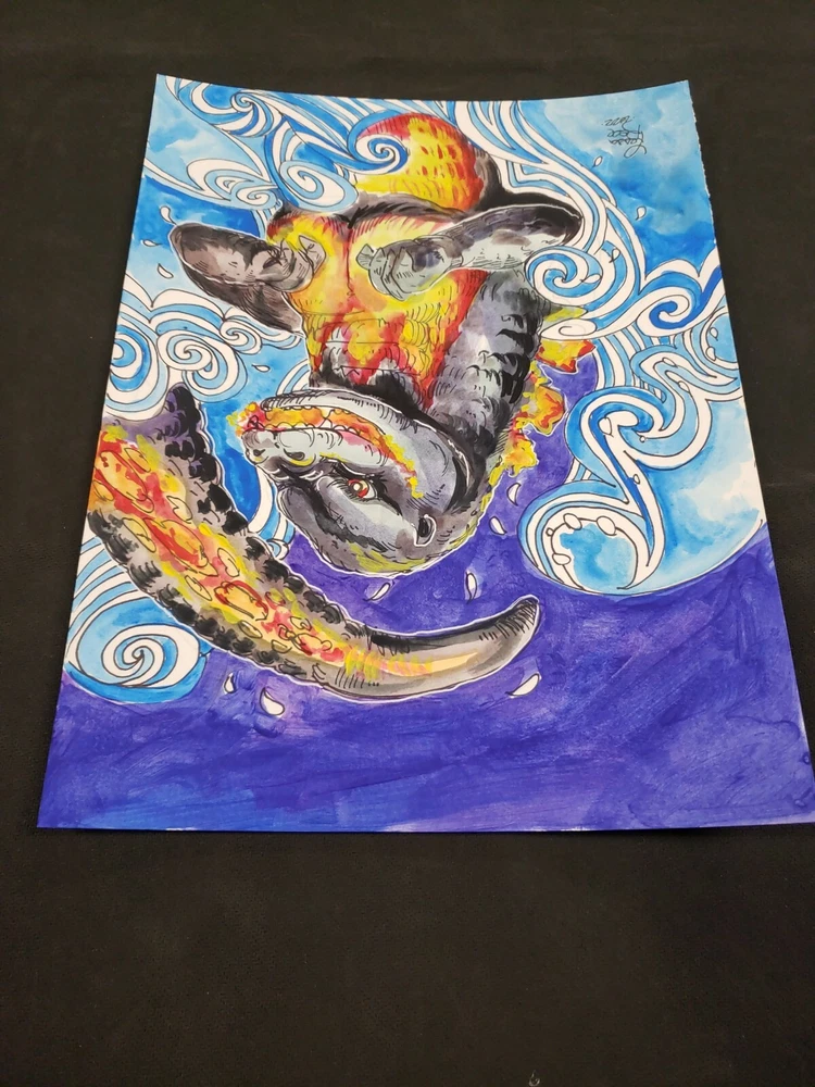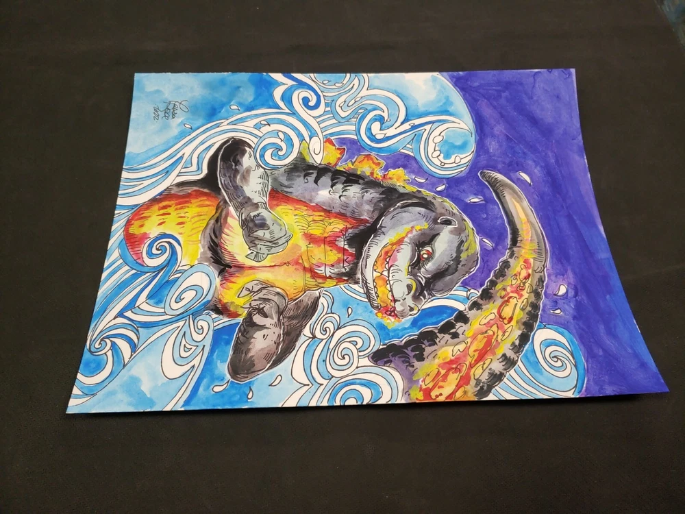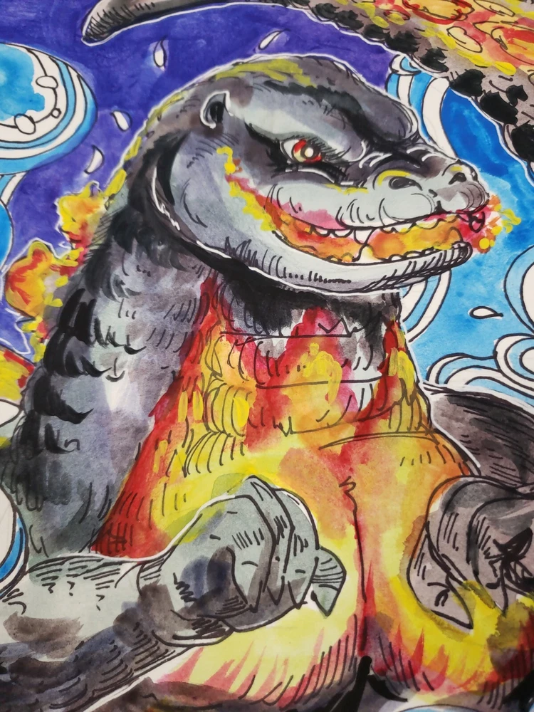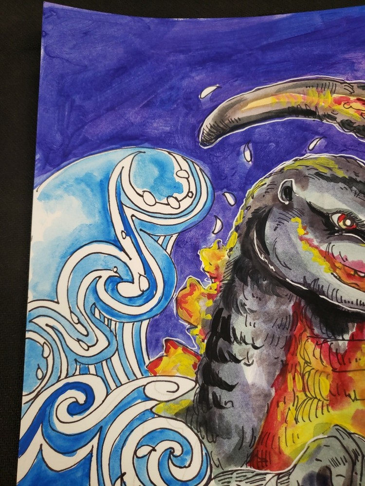 Tessa Rose Original painting Godzilla in Ocean Godzilla Art 9x12 acrylic paint and markers on watercolor paper Shipped with USPS first class...