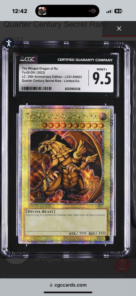 Elevate your Yu-Gi-Oh! TCG collection with the legendary power of "The Winged Dragon of Ra" from the prestigious Legendary Collection: 25th Anniversary Edition. As a Quarter Century Secret Rare card, "The Winged Dragon of Ra" (LC01-EN003) is a must-have for both serious collectors and seasoned duelists. Its Divine attribute and Divine-Beast monster type reflect its formidable strength, making it a force to be reckoned with in any game.This English language card comes from the trusted house of Konami and bears the certification number 6022902036, ensuring its authenticity and quality. The limited edition status of this card adds to its exclusivity. Whether for competitive play or as a centerpiece of your collection, "The Winged Dragon of Ra" stands as an emblem of the Yu-Gi-Oh! TCG legacy.
