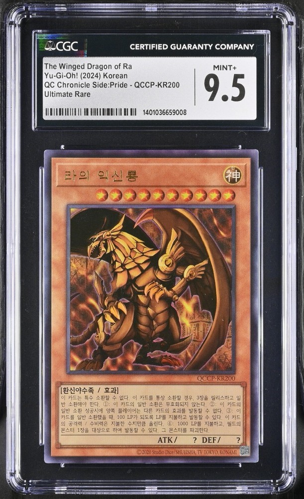This Yu-Gi-Oh! TCG card is a one-of-a-kind Ultimate Rare from the Quarter Century Chronicle Side Pride set. The winged dragon of Ra is depicted in stunning detail and has been professionally graded with a score of 9.5. The card is in Korean language and has a certification number of 1401036659008. The card is a must-have for any collector of CCG individual cards or collectible card games. It's a great addition to any collection and is sure to impress with its unique design and rarity. Don't miss out on the chance to own this amazing card!