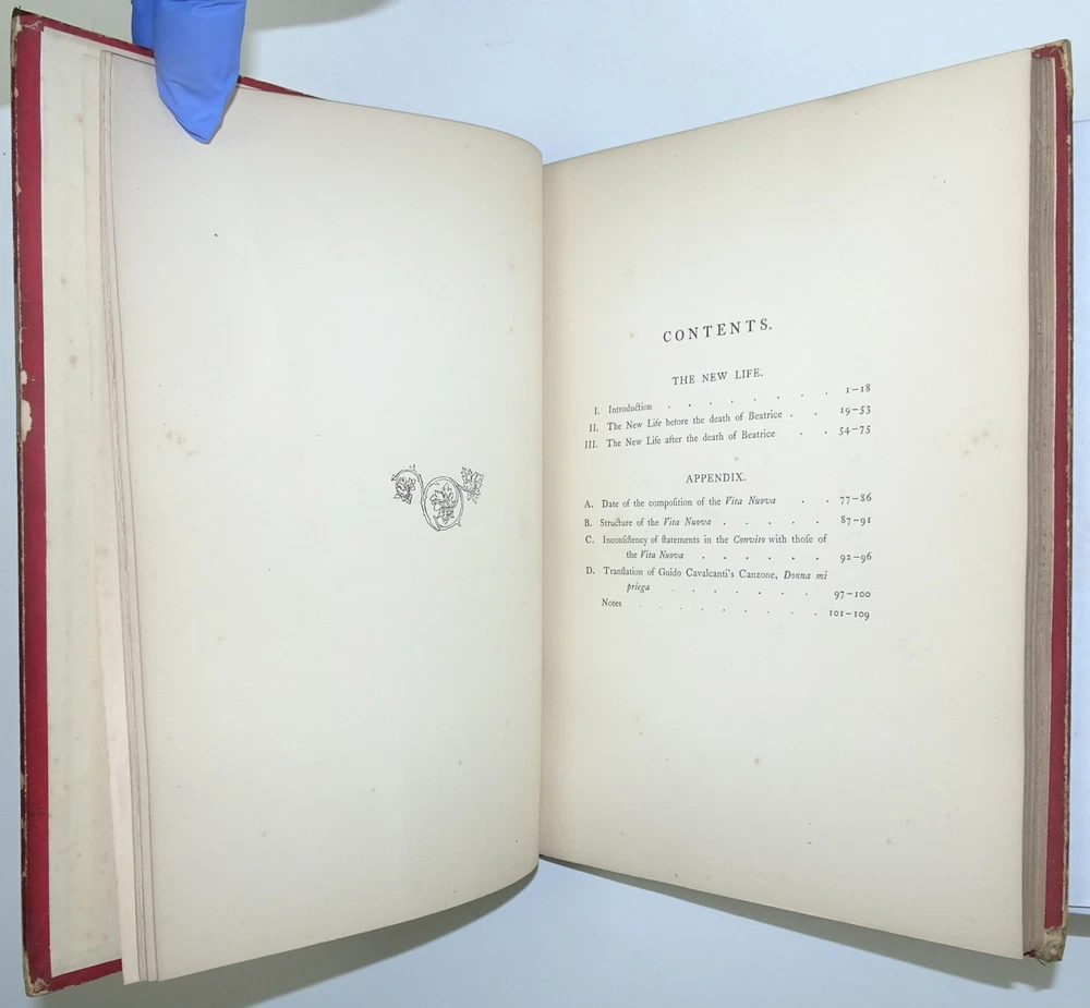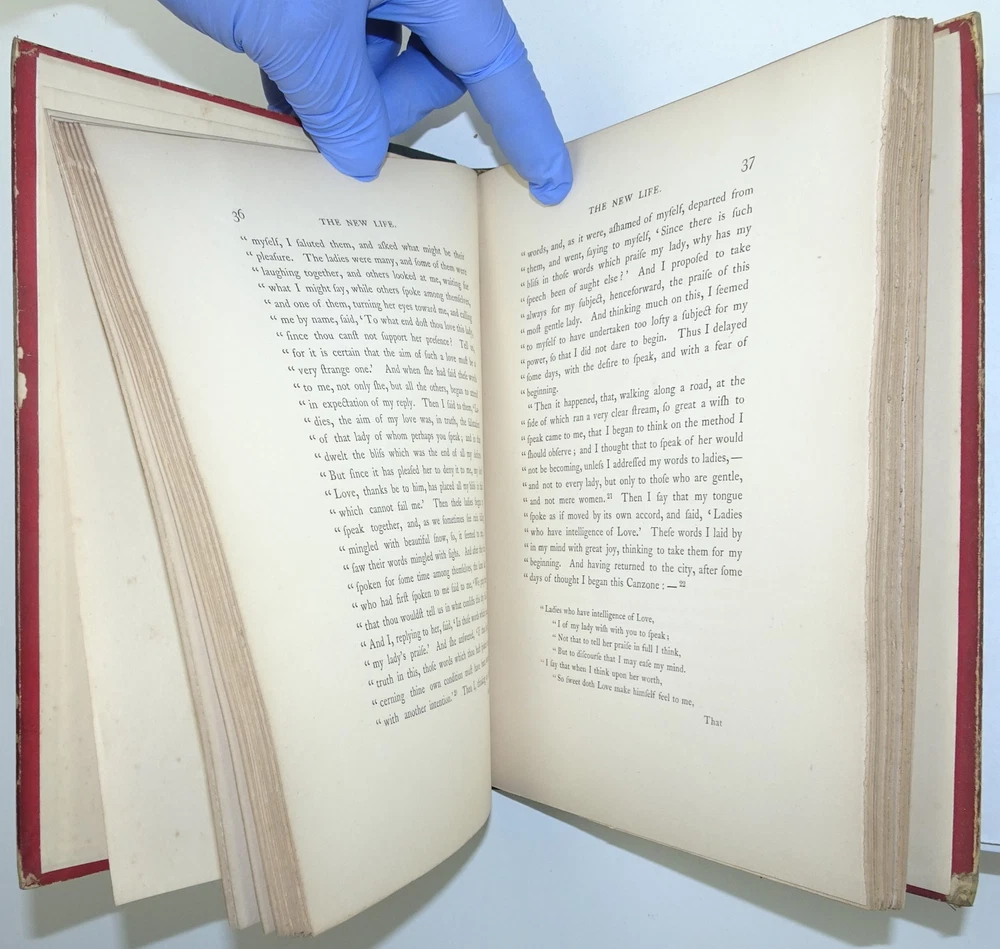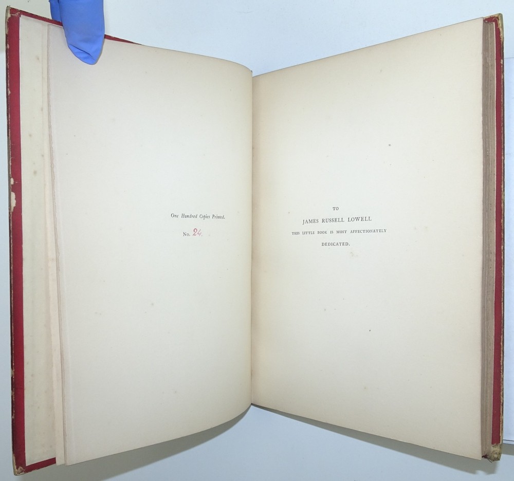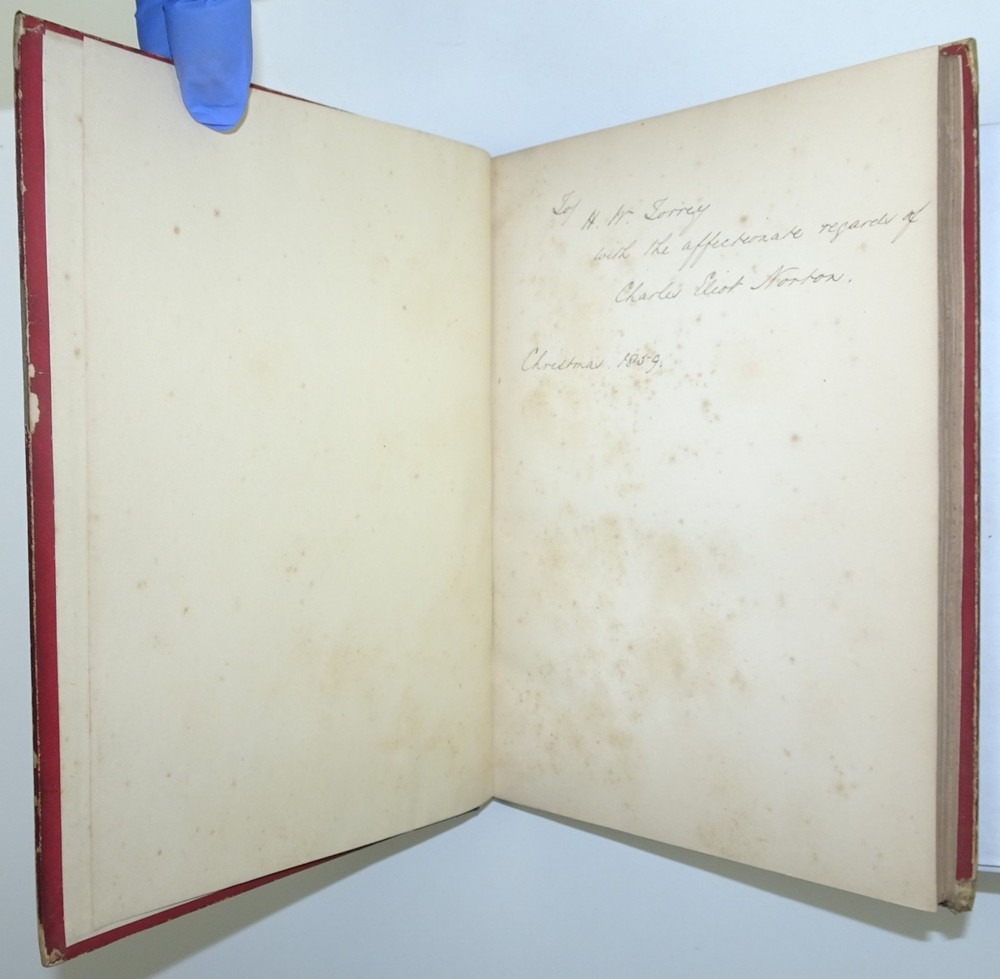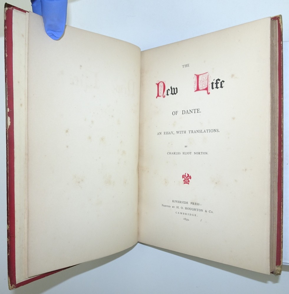 DETAILS: Title: The New Life Of Dante. An Essay, With Translations. Author : Charles Eliot Norton . Date Published: 1859 Place Published: Cambridge, Massachusetts . Published by: Riverside Press . Description: Special Edition limited to 100 numbered copies, (this example is no:"24"). Inscribed to H. W. Torrey and signed by Norton! Size: Approx 8 1/4" x 6 1/4" x 3/4". CONDITION: Overall: Good to very good. Bound in a mid 19th century 1/3 leather binding! Pages: Good to very good with some moderate foxing and or soiling , (please see pictures) . Binding: Very good, still sound. Hinges: Very good, sound and flexible . Hardcovers: Good to very good with some wear, (please see pictures) . Spine: Excellent - near fine .