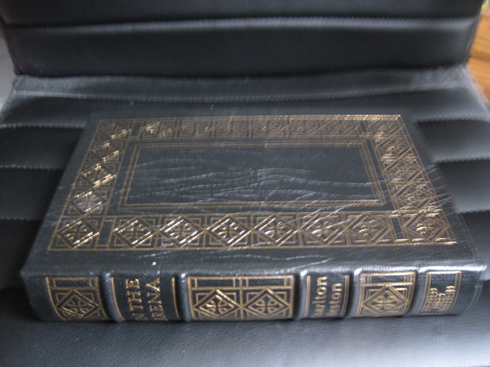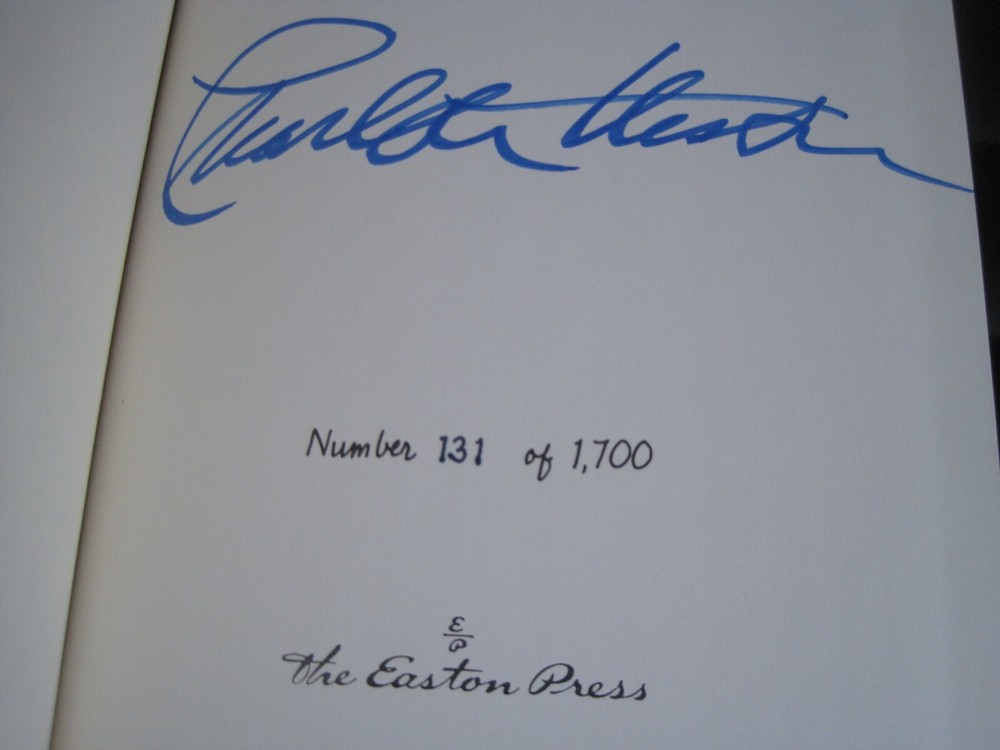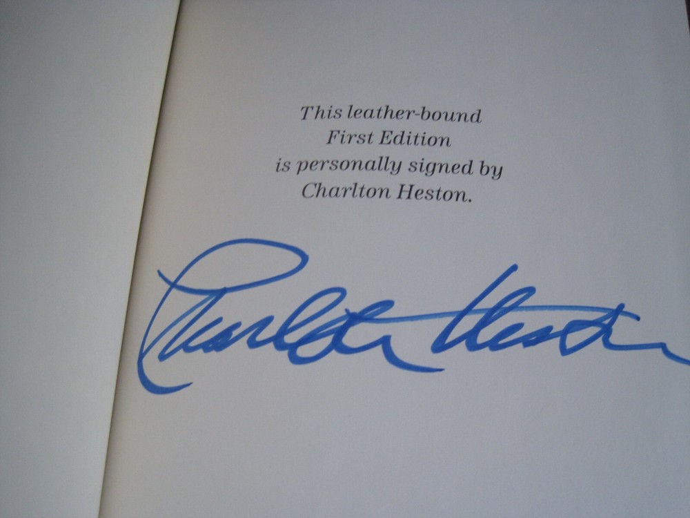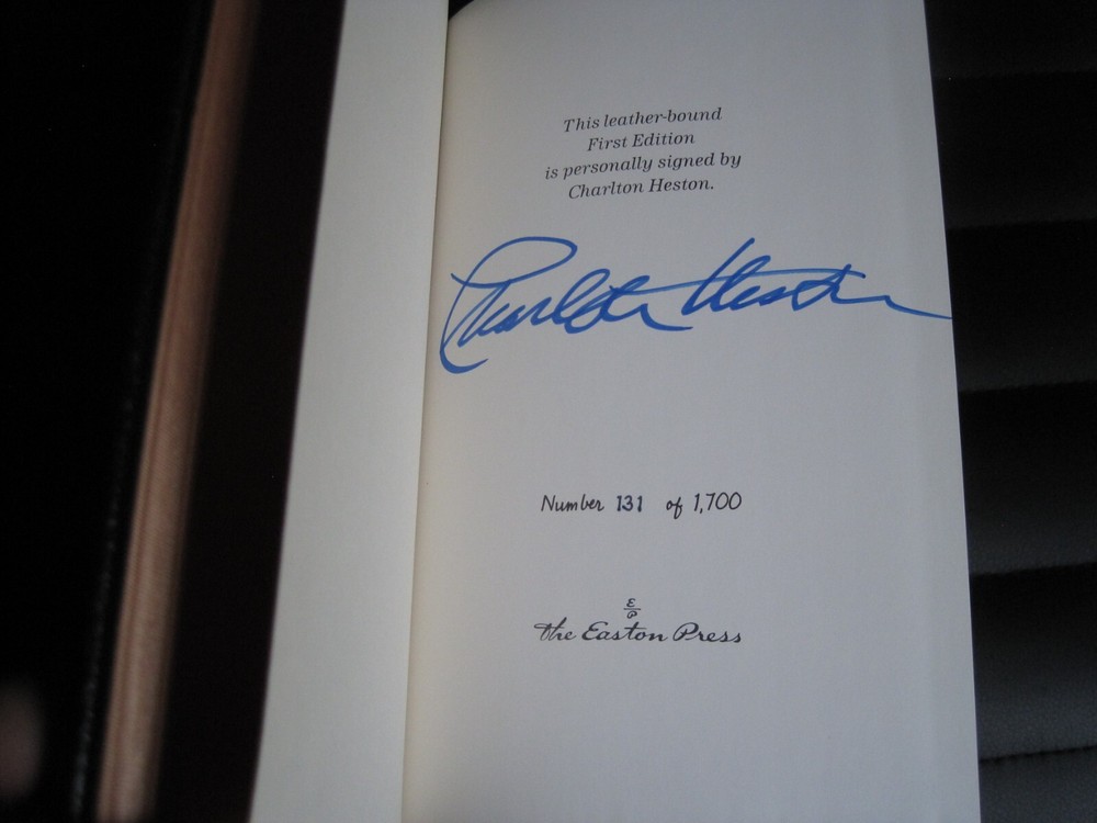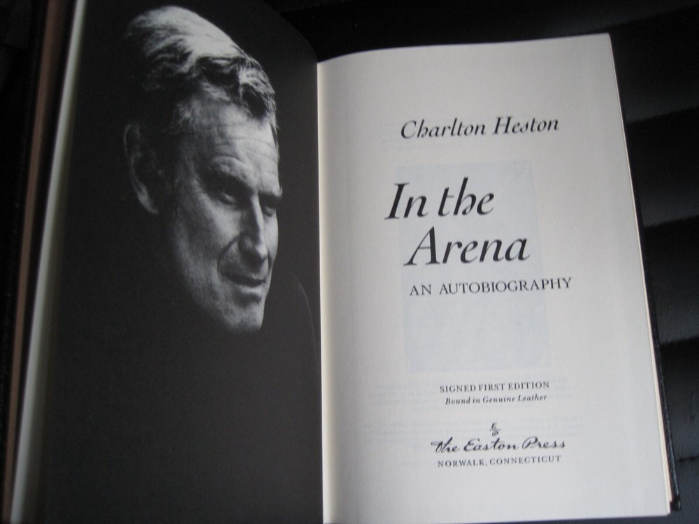 This is a leather bound signed first edition of Charlton Heston's best-selling memoir - "In The Arena - An Autobiography", the fascinating and controversial life story of the famous Academy Award winning Hollywood star. The book is unread and in great condition (see images). Signed by the late Hollywood star on the limitation page, this is number 131 of 1700 copies ever printed. Easton Press books are the golden standard in the publishing industry, highly collectible and lasting generations. Easton Press Full Genuine Leather Dubbed Spine Accented Wit 22 kt. Real Gold Satin Ribbon Page Marker Distinctive Cover Design Gilded Page Edges To Protect Against Humidity High Quality Acid - Free paper Smyth-Sewn Pages Silk-Moire Endleaves I combine multiple items for savings on shipping charges. I ship worldwide. Please ask about international shipping charges and/or different shipping options. Please check out my other auctions for several rare signed books for sale. Thank you!