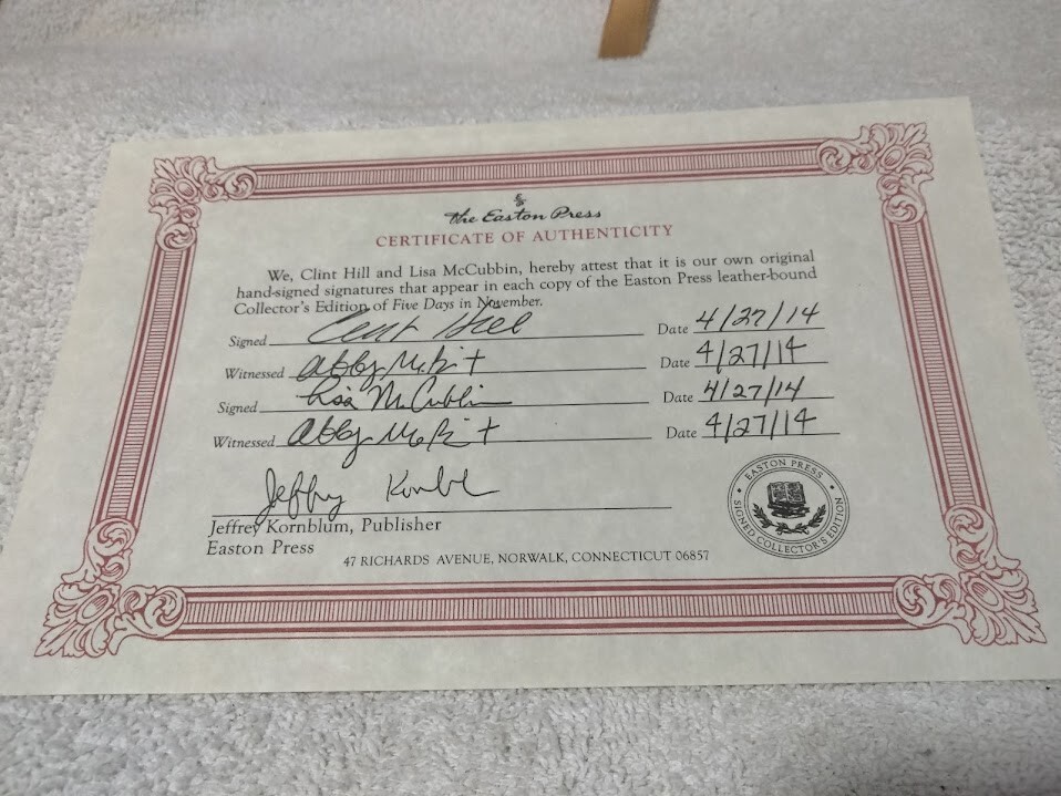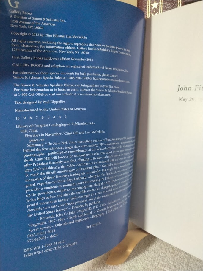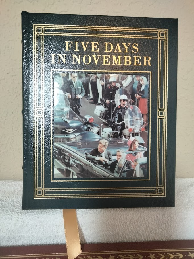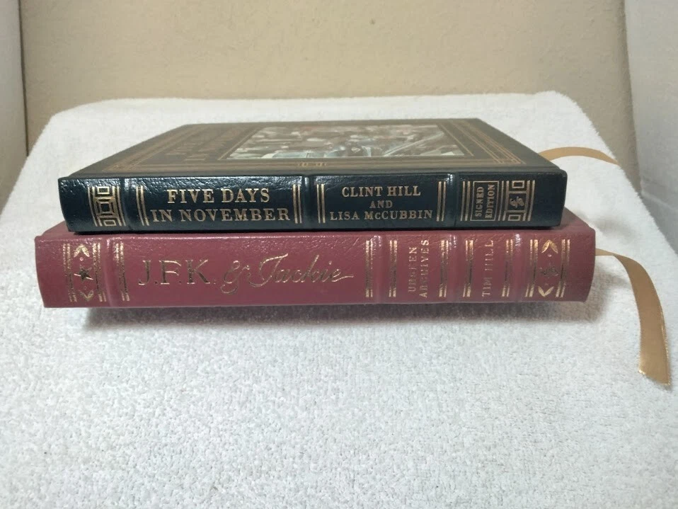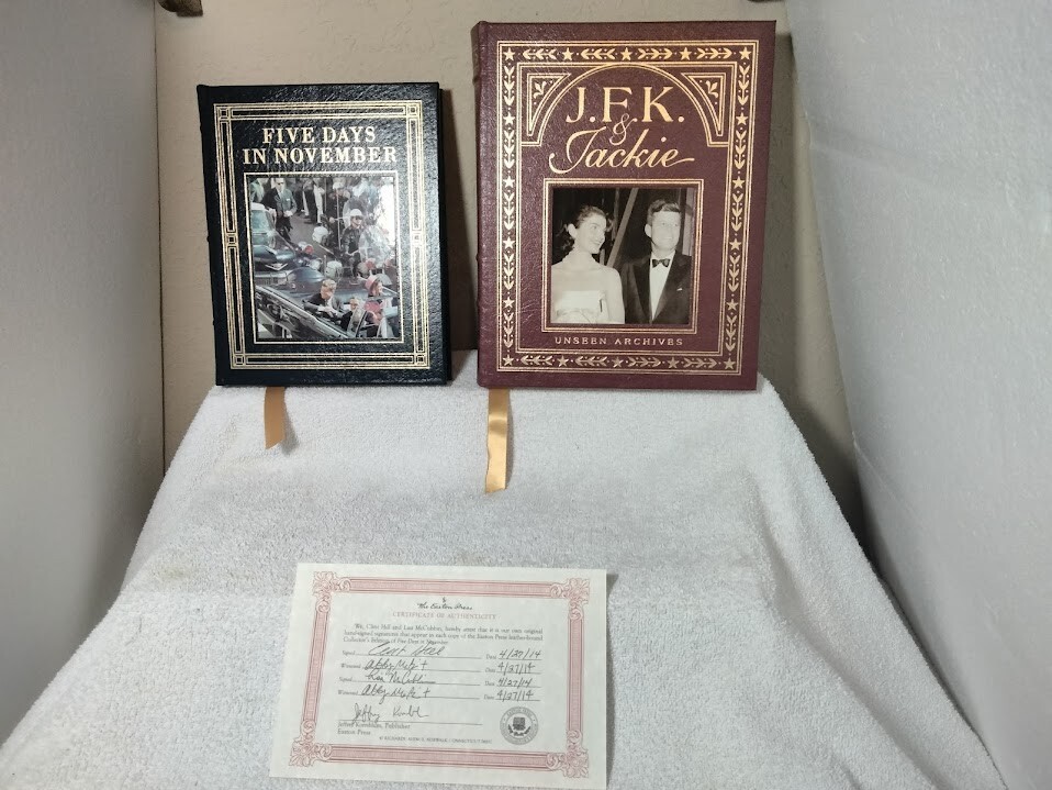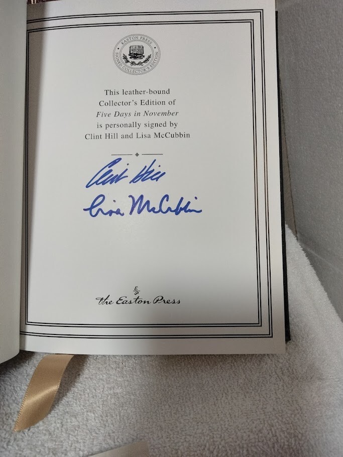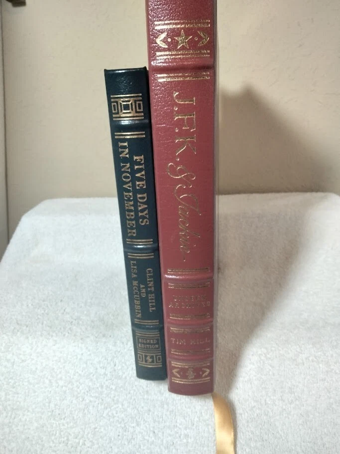 The product is a signed edition of "Five Days in November" by Clint Hill & Lisa McCubbin, published by Easton Press in 2013. This luxury edition features a leather binding and is a limited edition first printing. The book offers a unique insight into the events surrounding JFK & Jackie Kennedy's final days, making it a valuable collector's item for those interested in political history and biography. The signature adds a personal touch to this exclusive edition, making it a sought-after piece for enthusiasts of American political literature. Also as a bonus I am including the Easton Press Leather Bound Book by Tim Hill - JFK & Jackie "Unseen Archives". Both books are in excellent condition and the Five Days in November book is signed by both Authors (Clint Hill & Lisa McCubbin) plus includes the Certificate of Authenticity. Wrapped carefully and shipped within one business day.