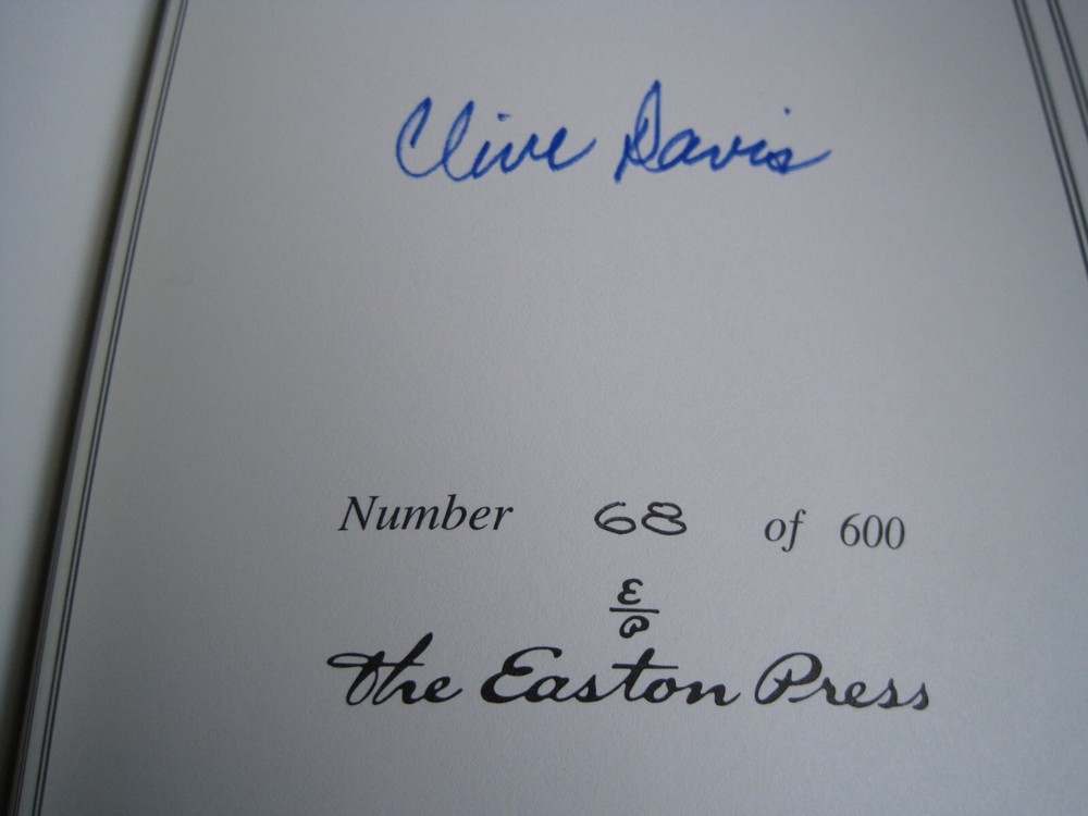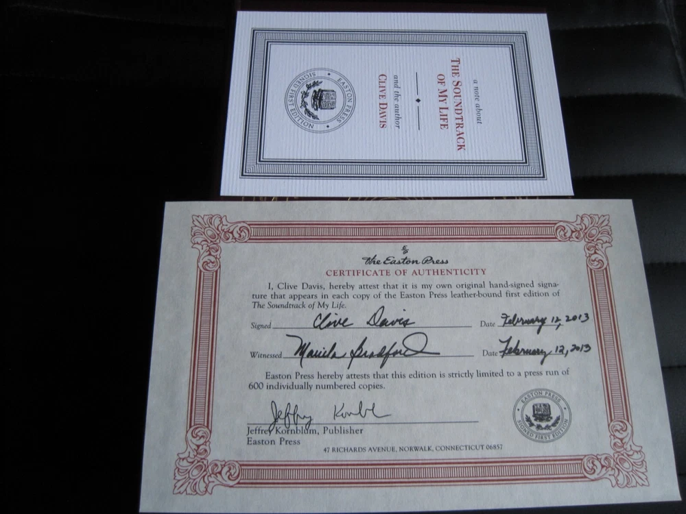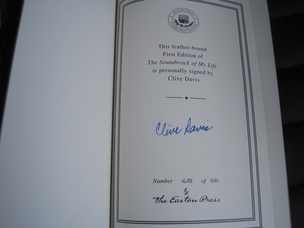 This is a leather bound signed numbered first edition of Clive Davis's best-selling memoir - "The Soundtrack Of My Life", a fascinating autobiography written by the famous record producer and business executive, former President of Columbia Records and Arista Records. In this star-studded autobiography, Clive Davis shares a personal, candid look into his remarkable life and the last 50 years of popular music as only a true insider can. In the history of popular music, no one looms as large as Clive Davis. His career has spanned more than 40 years, and he has discovered, signed, or worked with a staggering array of artists: Whitney Houston, Janis Joplin, Simon and Garfunkel, Barry Manilow, Patti Smith, Lou Reed, Dionne Warwick, Carlos Santana, The Grateful Dead, Alicia Keyes, Kelly Clarkson, Jennifer Hudson, and Aretha Franklin, to name a few. He has been inducted into the Rock and Roll Hall of Fame, received a Lifetime Achievement Grammy, and hosted the world’s highest profile parties. The book is new, unread, and in great condition (see images). Signed by the world famous record producer on the limitation page, it also includes a signed and dated certificate of authenticity and the publisher's note card. This is book number 68 of only 600 numbered copies ever printed. Easton Press books are the golden standard in the publishing industry, highly collectible and lasting generations. Easton Press Full Genuine Leather Dubbed Spine Accented Wit 22 kt. Real Gold Satin Ribbon Page Marker Distinctive Cover Design Gilded Page Edges To Protect Against Humidity High Quality Acid - Free paper Smyth-Sewn Pages Silk-Moire Endleaves I combine multiple items for savings on shipping charges. I ship worldwide. Please ask about international shipping charges and/or different shipping options. Please check out my other auctions for several rare signed books for sale. Thank you!