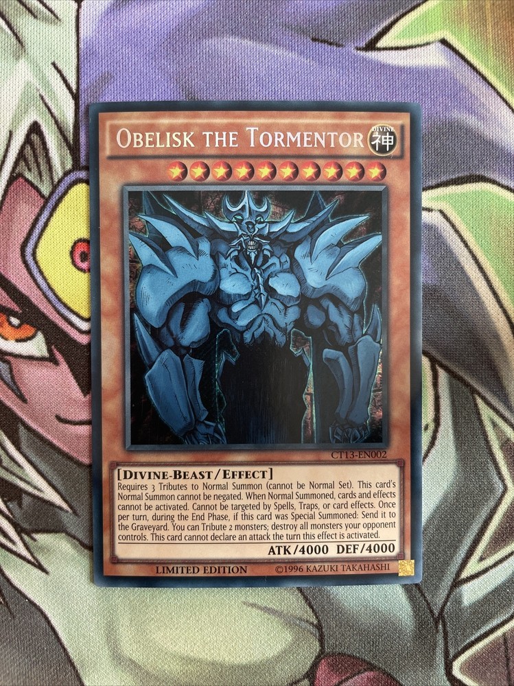 Listing Template 2018 Home About Us Shipping Returns View Feedback Contact Us CT13-EN002 Obelisk The Tormentor Secret Rare Limited Edition NM Yugioh Card This card is in near mint condition. Thanks for viewing! Thanks for viewing! Please check out our eBay store for more cards and don’t forget to use our promotional offers to save money on multiple items! We offer COMBINED INTERNATIONAL SHIPPING! Please contact us and ask us to combine multiple cards in your shipment to save on postage costs! International tracking is included on all orders over £40. If you require a tracking code under this amount it is an additional charge of £6.50. Please add this to your order or contact us for more information. We provide postage free in the UK! All of our single cards are sleeved, with a taped Toploader to ensure maximum protection, and the best overall condition of your cards! Combined orders may in the same sleeve, unless requested otherwise. Do you want to earn extra cash for your old cards? Clear out your binder and send us photos of what you have! We will happily send you an offer and sort out postage to make it hassle free. There's no harm in trying! Message us now! Free UK Delivery! Honest Sellers. We take care of the cards so you can worry less about the fuss and more about winning, competing and collecting. About Us We started selling collectable cards over 6 years ago after selling off our own childhood Yu-Gi-Oh collection. We then rediscovered our passion for trading card games. Ever since, my brother and I have been trying to ensure that we provide a range of cards within the fastest possible time to ensure you can build your collection as you’d like it! With over 35,000 positive feedback we strive for quality customer service, aiming to give the service that we would like to receive and stock a huge inventory of new and vintage collectable cards from popular games such as Yu-Gi-Oh and Pokemon so there’s something for everyone! Our goal is that we hope to build a collectable card community as passionate about collectable cards as we are! Contact Us The best way to get in contact is through eBay’s ‘contact seller’ button where we’ll try to get back to you as soon as possible. Feedback We always prioritise your buying experience so you can shop without worry. Contact us if there’s any part of an order you were dissatisfied with as we hope to resolve any issues as soon as possible. Buy with confidence. View Our Categories