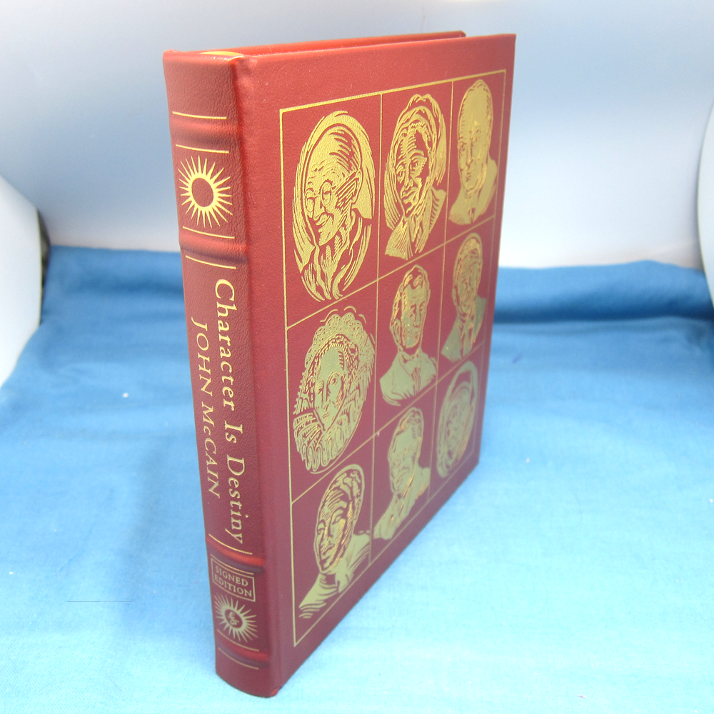 Character is Destiny, by John McCain. Beautiful leather-bound edition, signed by John McCain, and including a certificate of authenticity verifying the signature. Includes an unused Easton Press bookplate. Like new condition, never read. Gilt is bright and fully intact. Leather binding is in mint condition.