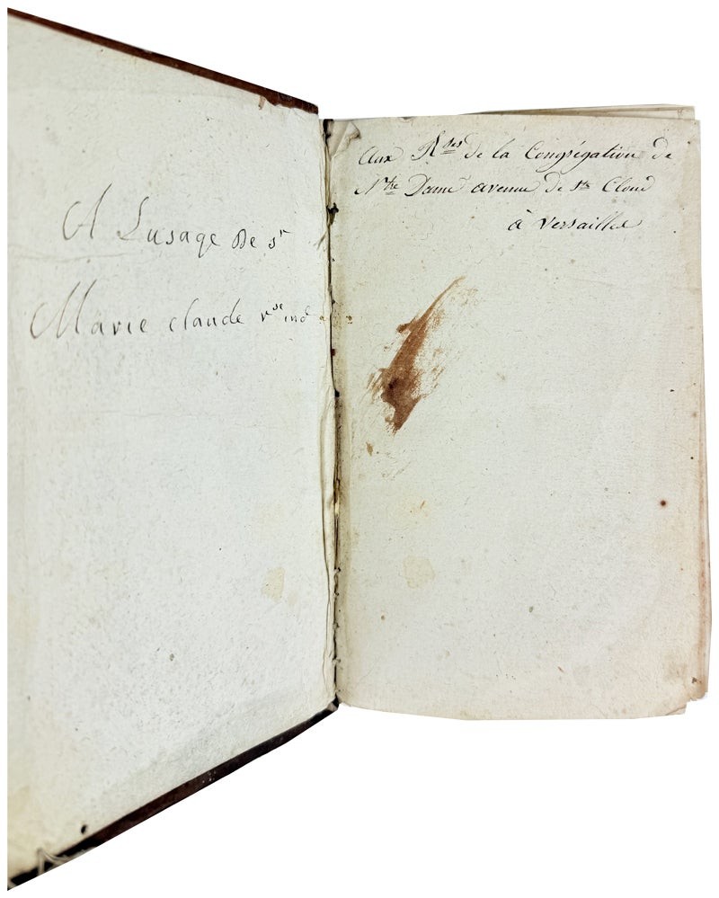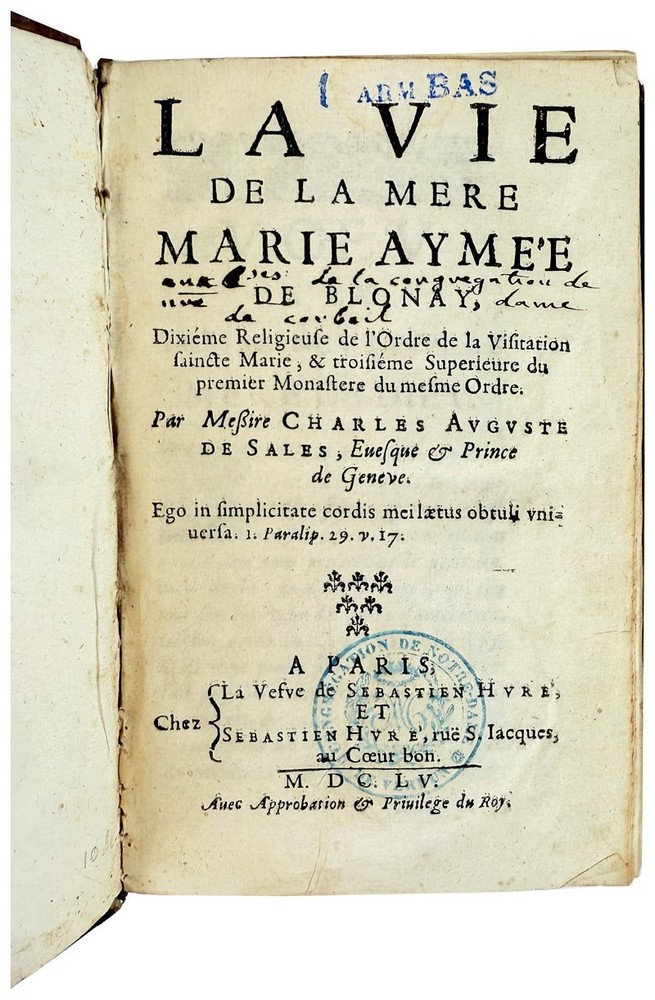 La Vie de la Mere Marie Aymee de Blonay, Dixieme Religieuse de l'Ordre de la Visitation saincte Marie, & troisième Supérieure du premier Monastere du mesme ordre Author: Charles Auguste de Sales Title: La Vie de la Mere Marie Aymee de Blonay, Dixieme Religieuse de l'Ordre de la Visitation saincte Marie, & troisième Supérieure du premier Monastere du mesme ordre Publication: Paris: Vefve [Veuve] de Sebastien Hure et Sebastien Hure, 1655 Description: Very Good-. Paris: Chez la Vefve [Veuve] de Sebastien Hure, et Sebastien Hure, rue S. Jacques, au Coeur bon, 1655. First Edition. Octavo (18.5cm); full contemporary calf, gilt spine in six compartments; [10],468pp.; woodcut initials, head- and tail-pieces throughout. Leather quite worn at margins with early and pleasingly crude stitching along bottom joint of upper cover and both upper cover corners, top half of front joint also split though holding, spine cocked, contemporary ownership inscriptions to front pastedown and free endpaper (Marie Claude of Lusage and the sisters of the Congregation de Notre Dame de Versailles), two 19th-century rubber-stamps to title page, else a Good to Very Good example, internally clean and sound. Biography of the late Visitation Nun Marie Aimee de Blonay (1590-1650). De Blonay was the daughter of a notable Savoyard family--her father Claude de Blonay was the co-Lord of Saint Paul and an associate of Saint Francis de Sales, uncle of the author of this biography Charles Auguste. Marie de Blonay's career began inauspiciously--her entry into the Order of the Visitation, recently founded by Francis de Sales, was delayed by the brutal murder of her brother, who was ambushed and stabbed to death by the son of a rival family. The tragedy occurred while his father was abroad and the body was brought instead to his sister Marie. Marie did eventually enter the rapidly expanding Order of the Visitation, where she first worked as a nurse before being named Superieure of the Monastere de Lyon. OCLC locates two copies in North America as of April, 2025, at Johns Hopkins and BYU. Seller ID: 32734 Subject: 17th Century, Biography / Memoir, France / French Writers, French Language, Religion / Theology, Women, Women Printers Capitol Hill Books is a used bookstore located on historic Capitol Hill in Washington DC, with three floors of quality used books, first editions, and rare books. [Note: Our online inventory is stored and managed at a separate location from at our brick and mortar shop. If you have a question about an item listed online, please send a direct message here rather than calling the store so that we can make sure someone familiar with the item in question can respond.] Terms Books described only as First Editions are First Printings unless otherwise specified. All items are guaranteed to be as described or they may be returned within 30 days of receipt for a full refund. All orders ship within two business days. Standard mail is USPS Media Mail. Expedited and international shipping are also available (please contact for estimates). We offer combined shipping on multiple orders. This listing was created by Bibliopolis.