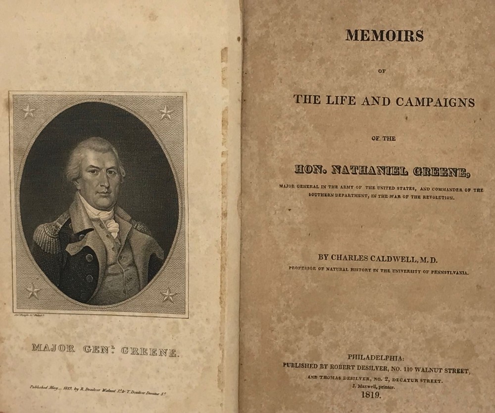 MEMOIRS OF THE LIFE AND CAMPAIGNS OF THE HON. NATHANIEL GREENE, MAJOR GENERAL IN THE ARMY OF THE UNITED STATES, AND THE COMMANDER OF THE SOUTHERN DEPARTMENT, IN THE WAR OF THE REVOLUTION Author: CALDWELL, Charles Title: MEMOIRS OF THE LIFE AND CAMPAIGNS OF THE HON. NATHANIEL GREENE, MAJOR GENERAL IN THE ARMY OF THE UNITED STATES, AND THE COMMANDER OF THE SOUTHERN DEPARTMENT, IN THE WAR OF THE REVOLUTION Publication: Philadelphia, [PA]: Published by Robert Desilver, No.110 Walnut Street, and Thomas Desilver, No.2, Decatur Street. J. Maxwell, Printer, 1819 Description: First edition. 8vo. xxiii, [1], 452pp., two folding facsimiles. Portrait frontispiece. Lacks errata. Worn full brown contemporary calf, front board detached, rear board starting, flyleaf loose, lacks leather spine label. Persistent foxing and browning to text block. Bookplate of George J. Price on front pastedown, his signature in pencil on flyleaf, dated 1844. Howes C-21. Gephart 13488. Seller ID: 66351 Subject: Americana, Revolutionary Americana We are a Washington, D.C. based bookstore in business for over 40 years. We specialize in Americana and general Antiquarian books. Terms All orders ship within three business days. Standard mail is USPS Priority Mail. Expedited and international shipping are also available. We offer combined shipping on multiple orders. All items are guaranteed to be as described or they may be returned within 30 days of receipt for a full refund. This listing was created by Bibliopolis.