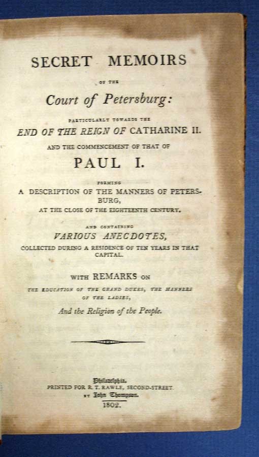 SECRET MEMOIRS Of The COURT Of PETERSBURG: Particularly Towards the End of the Reign of Catherine II. And the Commencement of That of Paul I. Forming a Description of the Manners of Petersburg, at the Close of the Eighteenth Century. And Containing Various Anecdotes, Collected During a Residence of Ten Years in that Capital. With Remarks on the Education of the Grand Dukes, the Manners of the Ladies, And the Religion of the People Author: [Masson, Charles François Philibert. 1762 - 1807] Title: SECRET MEMOIRS Of The COURT Of PETERSBURG: Particularly Towards the End of the Reign of Catherine II. And the Commencement of That of Paul I. Forming a Description of the Manners of Petersburg, at the Close of the Eighteenth Century. And Containing Various Anecdotes, Collected During a Residence of Ten Years in that Capital. With Remarks on the Education of the Grand Dukes, the Manners of the Ladies, And the Religion of the People Publication: Philadelphia: Printed for R. T. Rawle, Second-Street, by John Thompson. 1802 Edition: 1st US edition thus (American Imprints 2633) Description: Philadelphia: Printed for R. T. Rawle, Second-Street, by John Thompson. 1802. 1st US edition thus (American Imprints 2633). Two volumes in 1 (vii, [1], 321, [1] pp). Divisional t.p. to 2C4r. 8vo, signed in 4s. Period full brown sheep with a red leather title label to spine. Gilt dentelles to edges. General wear to binding, with front joint starting at top. Ffep detached. Period pencil pos. Usual browning to paper. A VG copy in an all orginal, not-oftern-found period binding. Item #30656 Seller ID: 30656 Subject: Potpourri Tavistock Books, ABAA Alameda, CA Established in 1989, Tavistock Books has been in its present Alameda location since 1997. We are a general antiquarian business, with material ranging from Aviation to Zoology, from the 16th C to the 21st. We have specialties in Dickens, History of Nursing, Children's Serial Fiction & Western Americana. Shop hours are generally Tuesday - Saturday, 10 am to 3 pm, Pacific Time, though it always helps to call prior to visiting, as we may, for example, be off buying books or exhibiting at a book fair. Guarantee We guarantee everything we sell and any item may be returned for any reason within 30 days of receipt. If the return is due to an error on our part, we will reimburse you the cost of your return. Please do exercise the same care in packaging, as we do in shipping all items purchased from us. We are members of the Antiquarian Booksellers' Association of America (ABAA), and the International Online Booksellers Association (IOBA). Shipping We are happy to ship to buyers outside of the United States. Please contact us for an exact shipping quote. All books shipped to US destinations are usually sent US Post Office Media Mail, with despatch usually within 72 hours of payment receipt. Delivery typically takes a week, but may be longer, especially during the holidays. Faster shipping is available, please contact us for a price quote. We will combine shipping on items purchased at the same time. We prefer PayPal. Feedback We leave feedback for buyers once they have posted feedback for us. If you are unhappy with any aspect of a transaction with us, please contact us immediately. We work hard to keep buyers happy and to promptly resolve the rare problem that may arise. This listing was created by Bibliopolis.