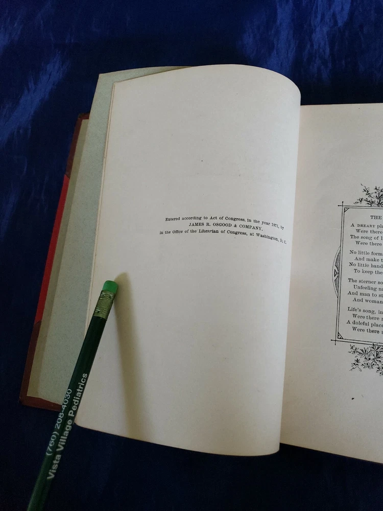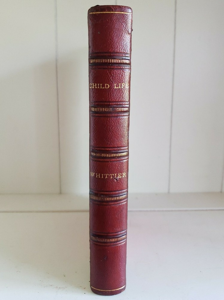 Child Life: Poetry, Ed. John Greenleaf Whittier Antique 1871 Victorian Leather. Shipped with USPS Media Mail. All of my antique leather books are treated with Cellugel (which is safe for all book materials) to preserve the leather and inhibit deterioration from red rot. The leather has pre-existing scars and wear. This is a genuine antique book, literally a piece of history. If it were sentient, it could tell of over a hundred years full of lives it has touched and hands it has passed through. Every year, more of these irreplaceable treasures are lost-- to fires, floods, etc., or simple carelessness. It is my hope to rescue as many as possible and help them find homes where they will be cherished and passed on to future generations. Previous owner's inscription inside. No tears or odors. All photos depict the actual book listed; please examine them carefully. If you have any questions, please ask. Please visit my eBay store to find more great books! If you would like a discount for combined shipping costs for multiple items, PLEASE LET ME KNOW, and I'll be happy to take care of it! π Thanks for looking! Your purchase supports small family business. https://www.ebay.com/str/neverenoughbooks65