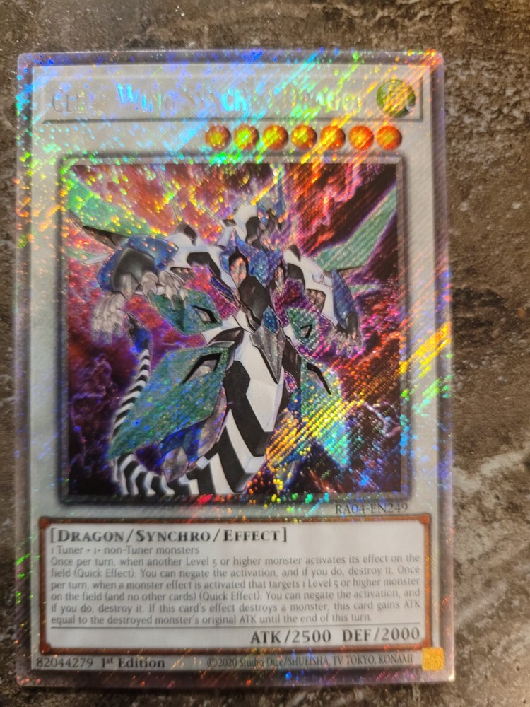 Just pulled this beauty—Clear Wing Synchro Dragon in Platinum Secret Rare looks absolutely stunning! The holographic finish shines brilliantly, and it arrived in perfect condition, straight from the pack to a sleeve. A must-have for collectors and duelists alike!