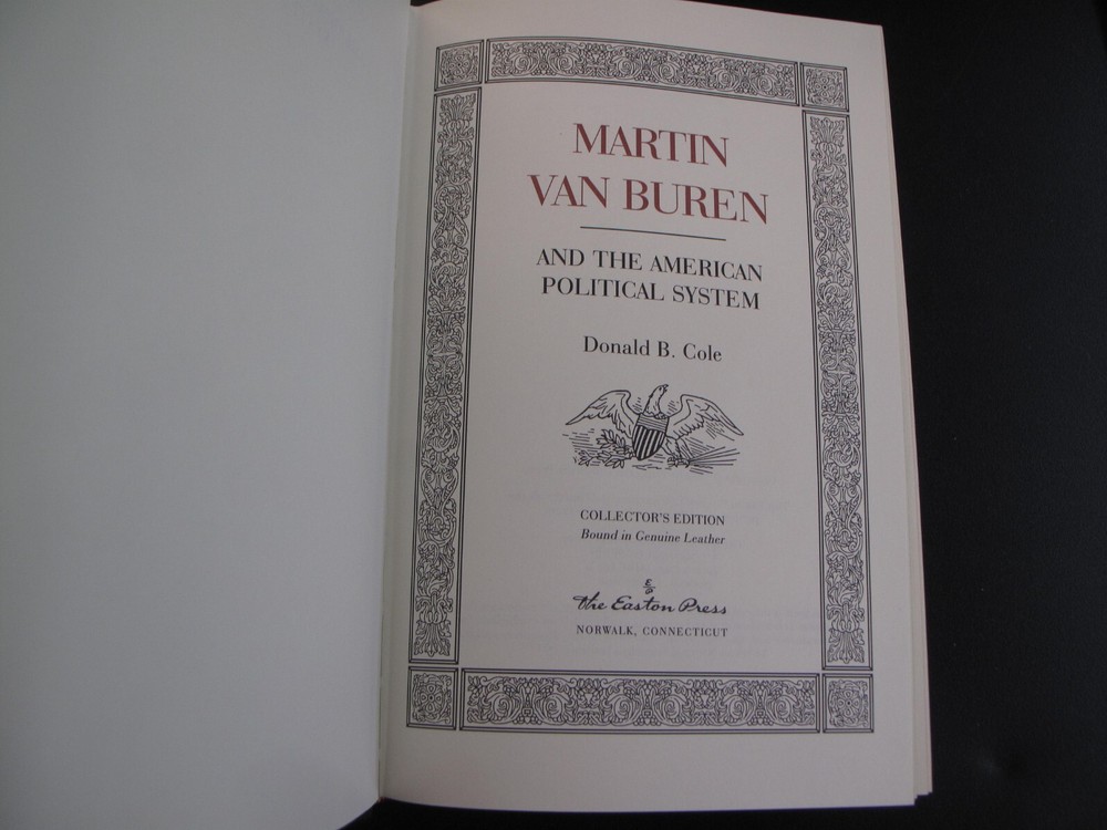 We are offering MARTIN VAN BUREN AND THE AMERICAN POLITICAL SYSTEM Donald B. Cole; The Easton Press. (1997.) This book is hard-bound in brown leather with gilt stamping on the covers and spine. The binding is solid. The contents are bright and clean. Shipping Anywhere In The United States Media Mail $6; International Shipping $65. Please Note: We are happy to accept all forms of payment. Everything we sell is Returnable for any reason. We only ask for prompt notification, within 14 days. We generally do try to "combine shipping" when you purchase more than one item--except in cases of large lots or very heavy shipments. ON INTERNATIONAL ORDERS, WE DO REFUND ON OVERCHARGES!! Don't hesitate to ask for more info/detail on any of our listings. HOFFMAN BOOKS, ABAA, IOBA