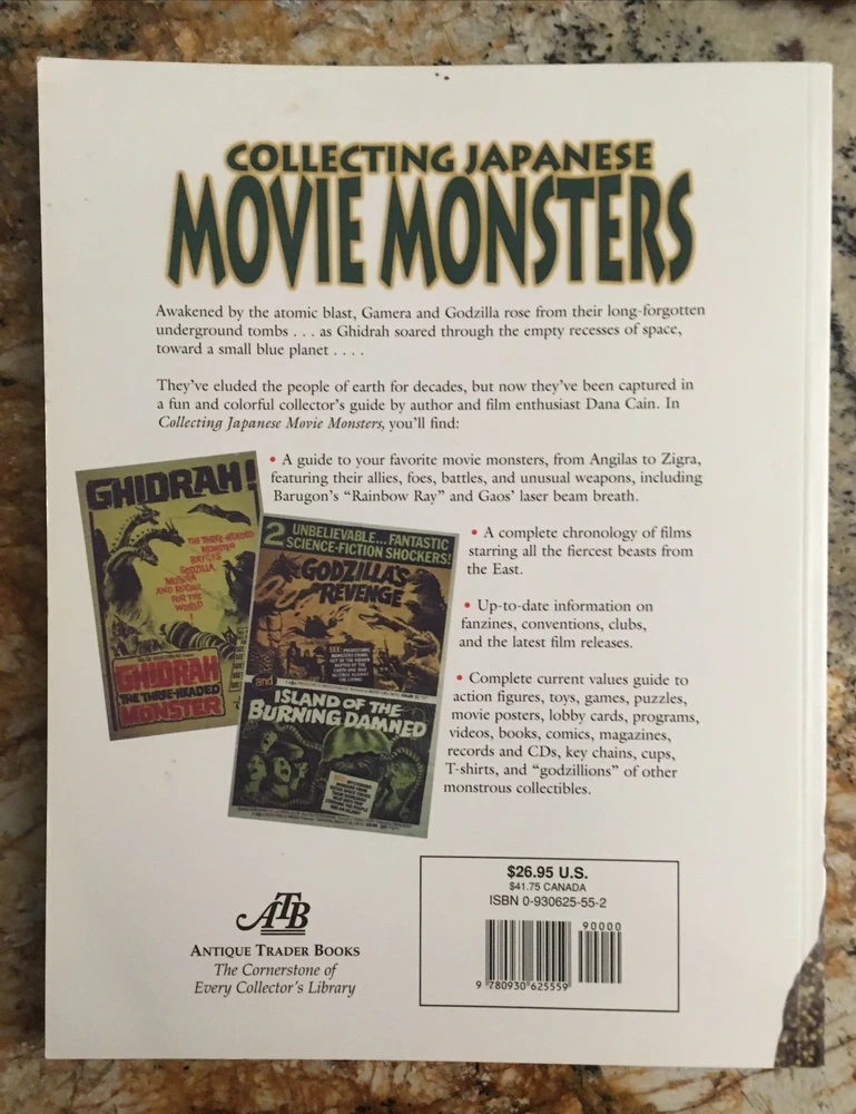 The book is brand new, but it has a flaw on the top cover. (see photos) Selling off my book collection. Has been in my bookcase for over 25 years. ============ The product is a paperback book titled "Collecting Japanese Movie Monsters" by Dana Cain, published in 1998 by Antique Trader Books. It features information on various Japanese movie monsters like Godzilla, Gamera, and King Ghidorah, as well as collecting tips and details on action figures and memorabilia. The book is in very good to excellent condition. I would grade it higher if not for f for the flaw on the top left orner. Includes color photos of the monsters genres. A must have buy for any fan of the "king of Monsters, Godzilla!"